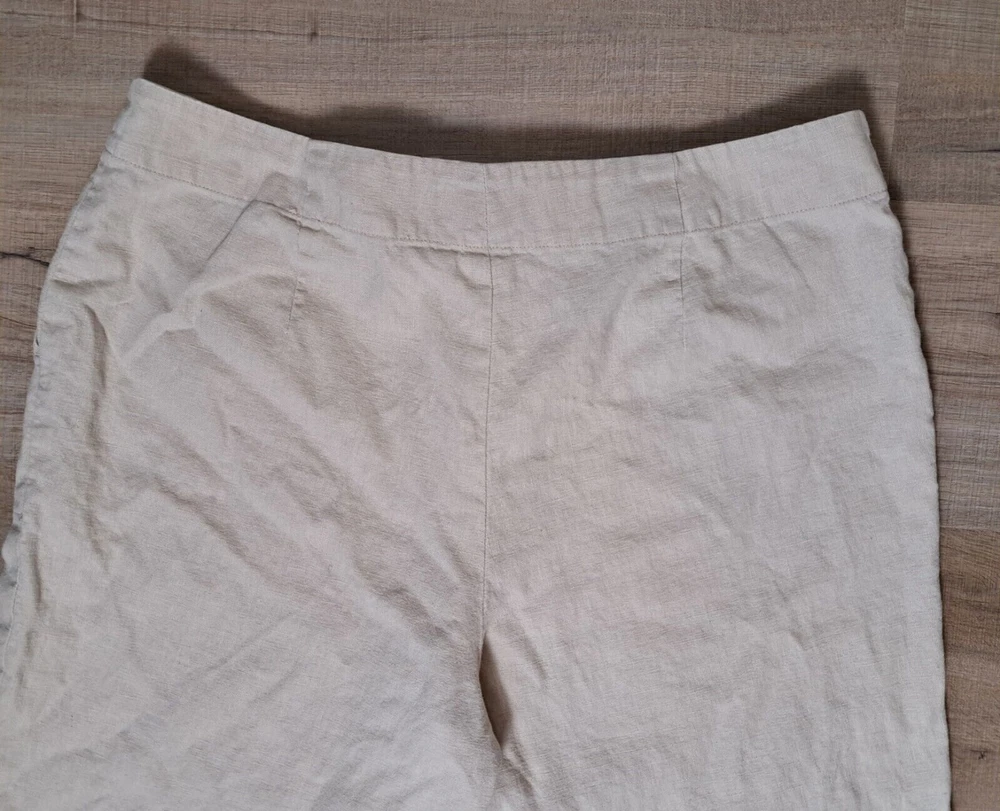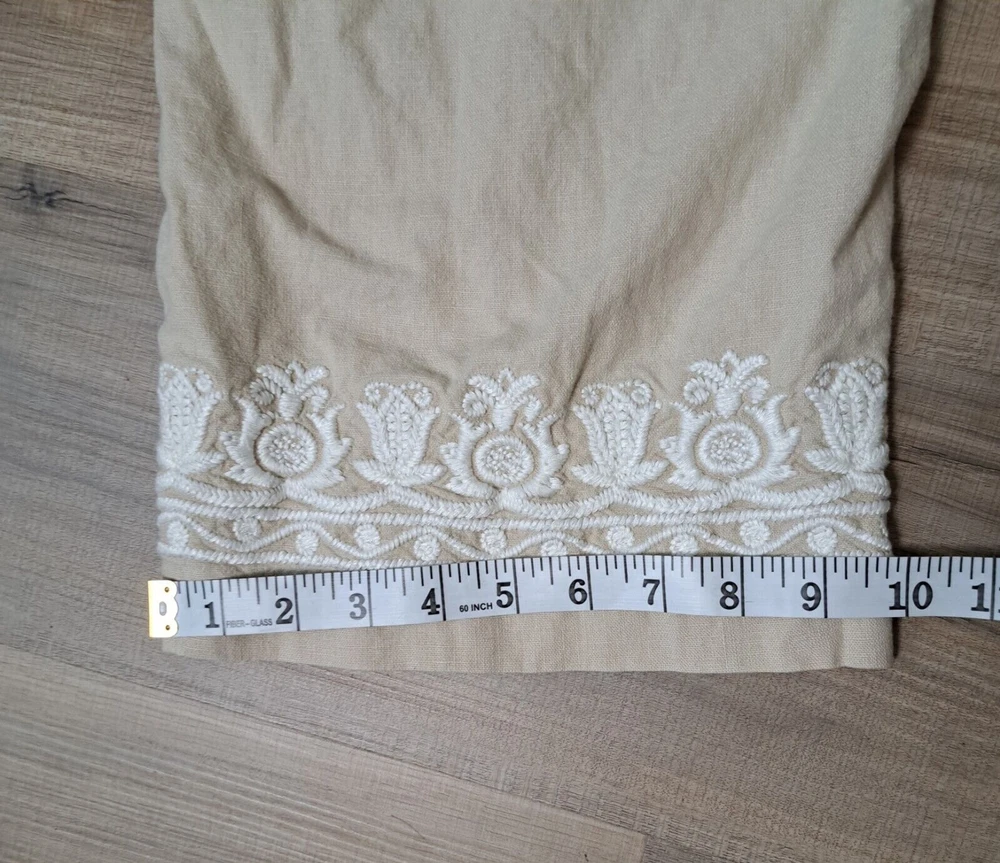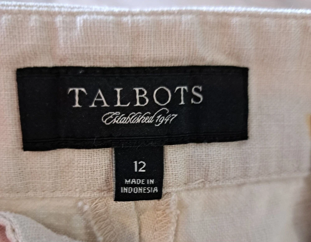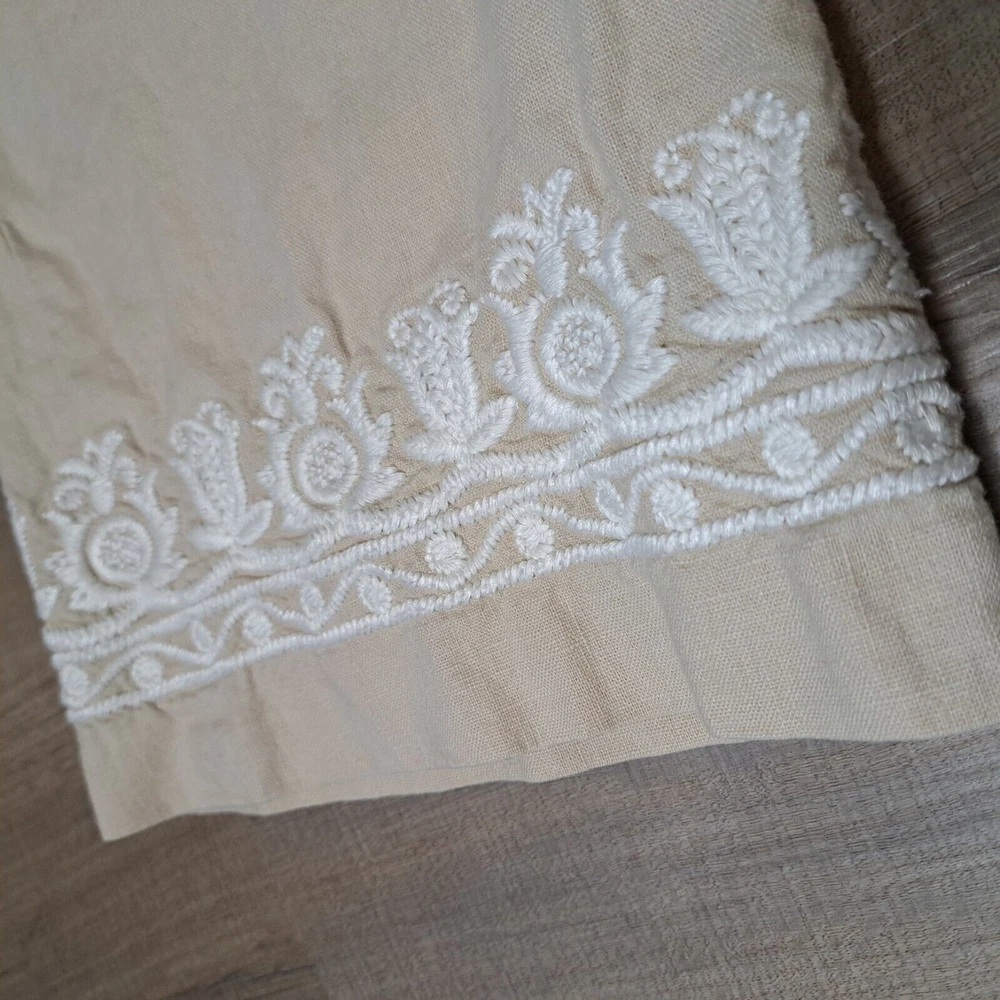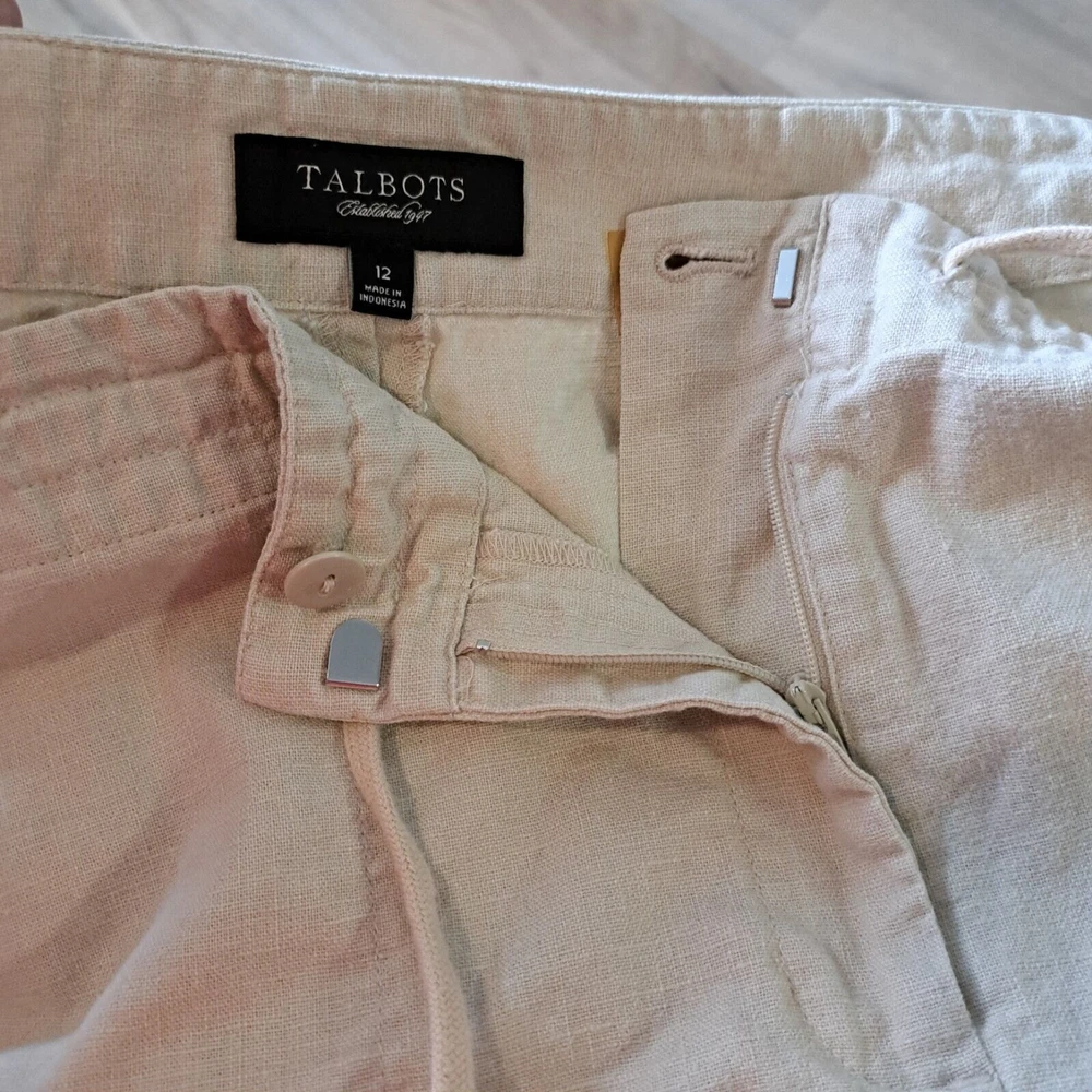 Used in Great condition, please see pictures for details and measurements. Elevate your summer wardrobe with these Talbots women's linen blend cropped pants in a beautiful beige color. These pants feature a straight leg and are embroidered with subtle accents, making them perfect for any occasion, whether it's a party, casual outing, or travel. The pants have a comfortable fit with a mid-rise and a drawstring closure that adds a touch of versatility to the garment. Crafted from a linen-cotton blend, these pants are breathable and machine washable, making them easy to care for. The pockets on the front and flat front style add functionality and a classic touch. These pants are perfect for the summer, fall, and spring seasons and are a must-have for any fashion-forward woman's wardrobe.