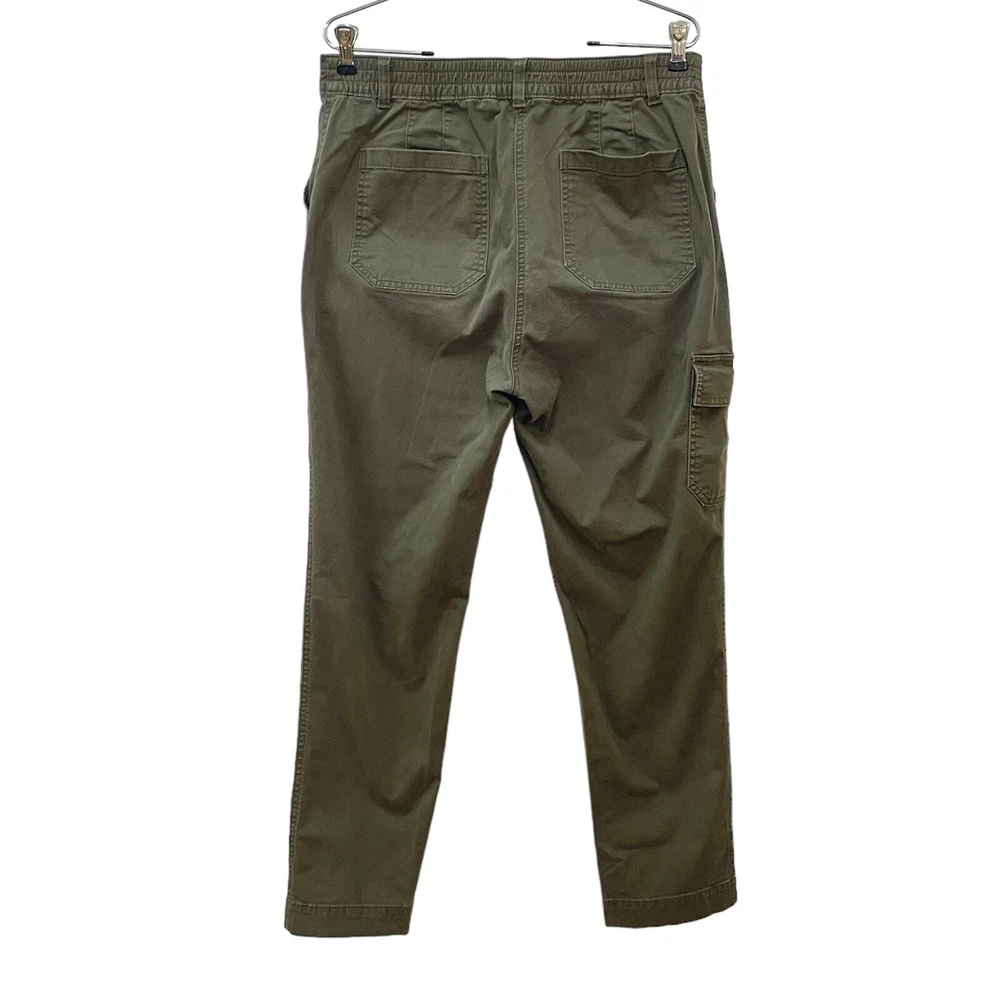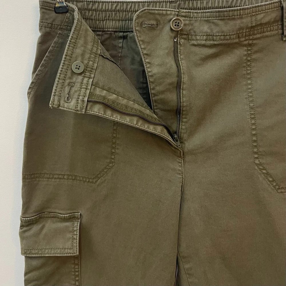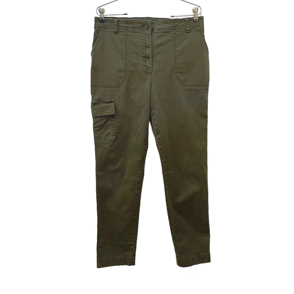 Talbots Women's Olive Green Cotton Stretch High Rise Slim Leg Cargo Pants Olive/Army green Front and back pockets One side cargo pocket Flat front Elastic waist in back Cotton-spandex blend Waist- 16" across Rise- 11.5" Inseam- 27" *Excellent preowned condition