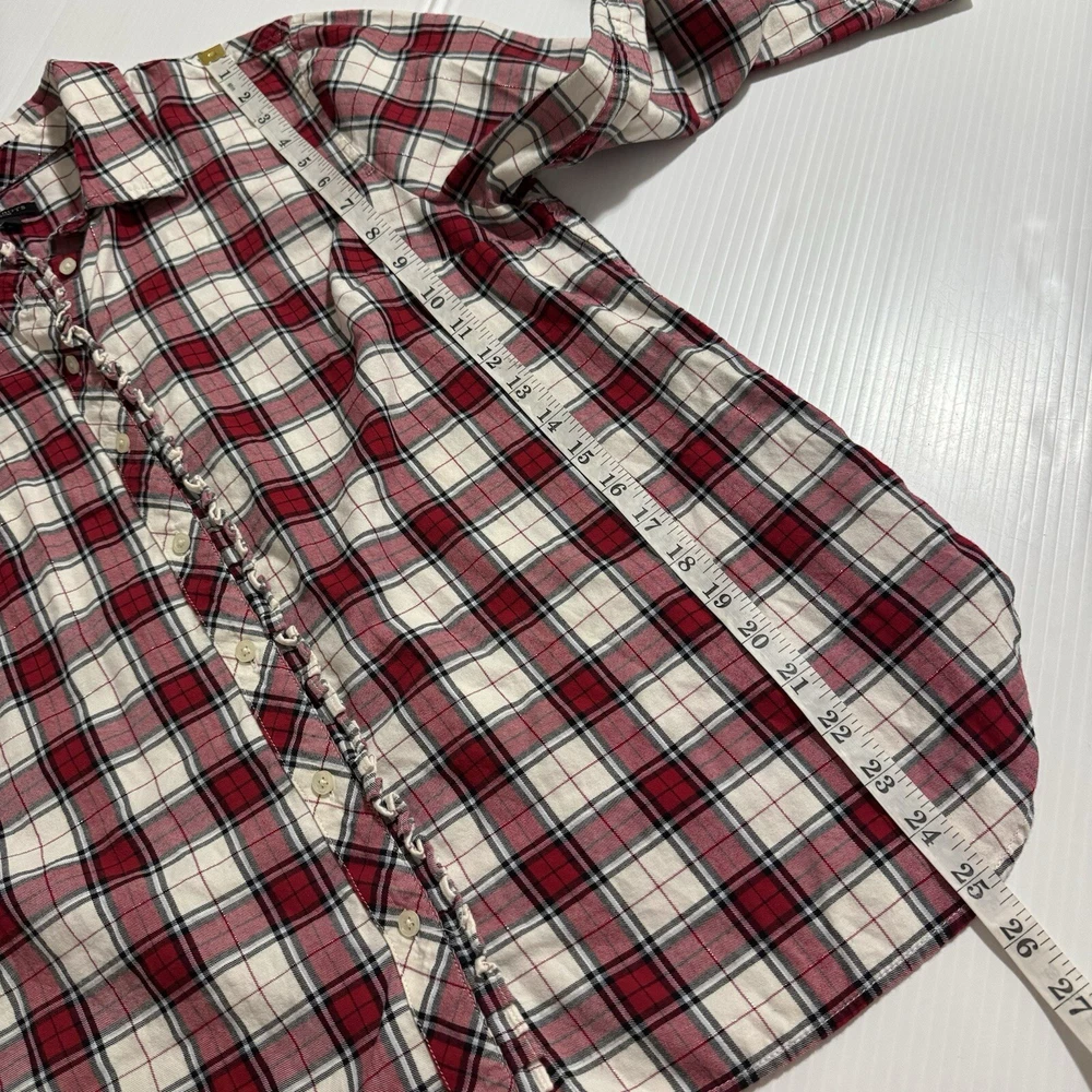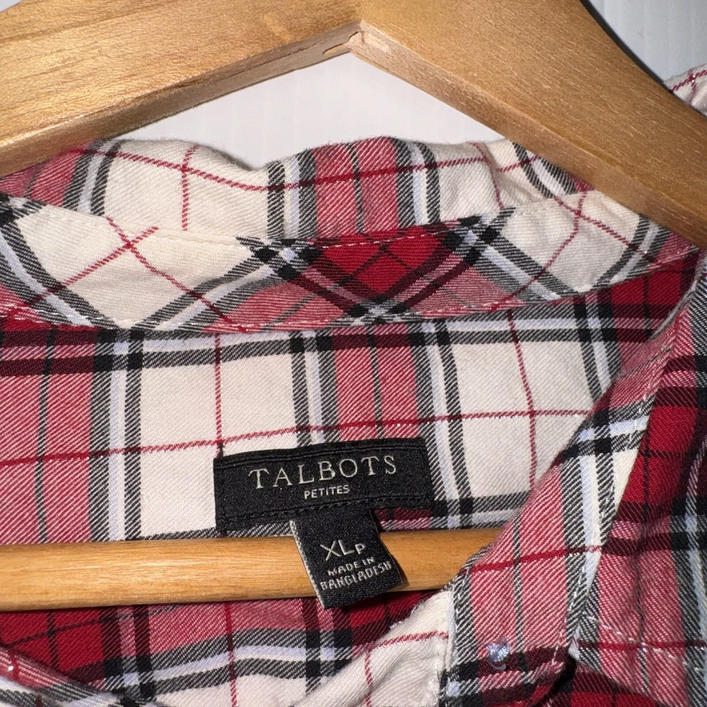 Talbots Women’s Plaid Button Front Flannel Shirt Ruffle Metallic Red White XLp Please see all photos Used good condition, with signs of use Note: Please take into account the measurements in the photos are approximations, you must be sure of your sizes. Please view all photos carefully before making any purchase. Shipments are made the same or next day on business days. Any questions please ask