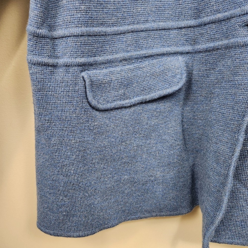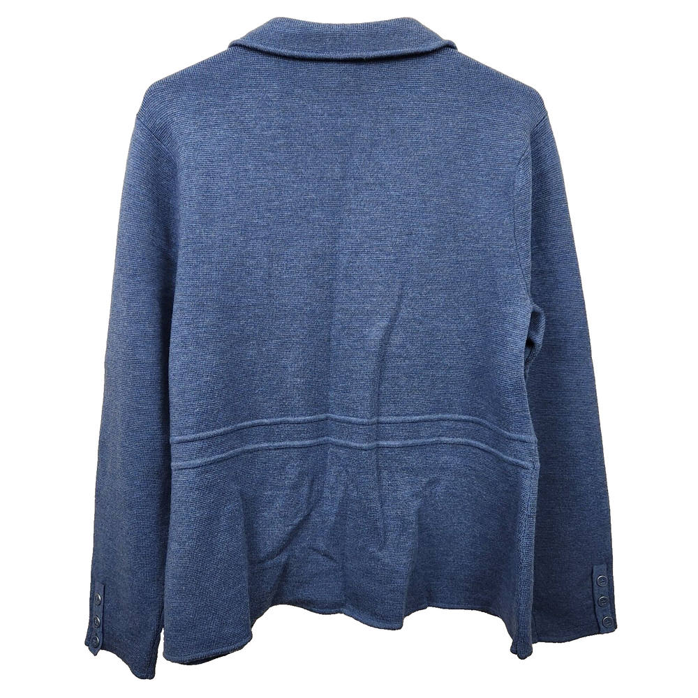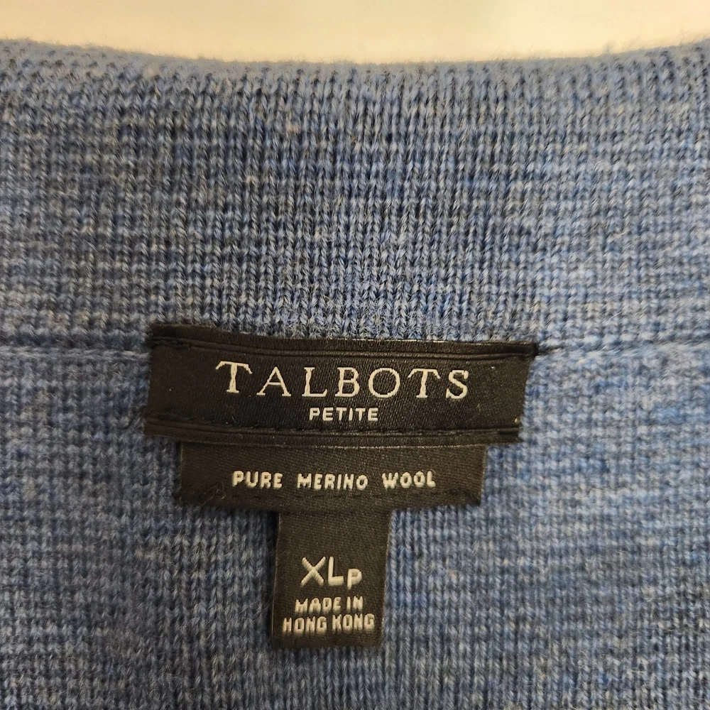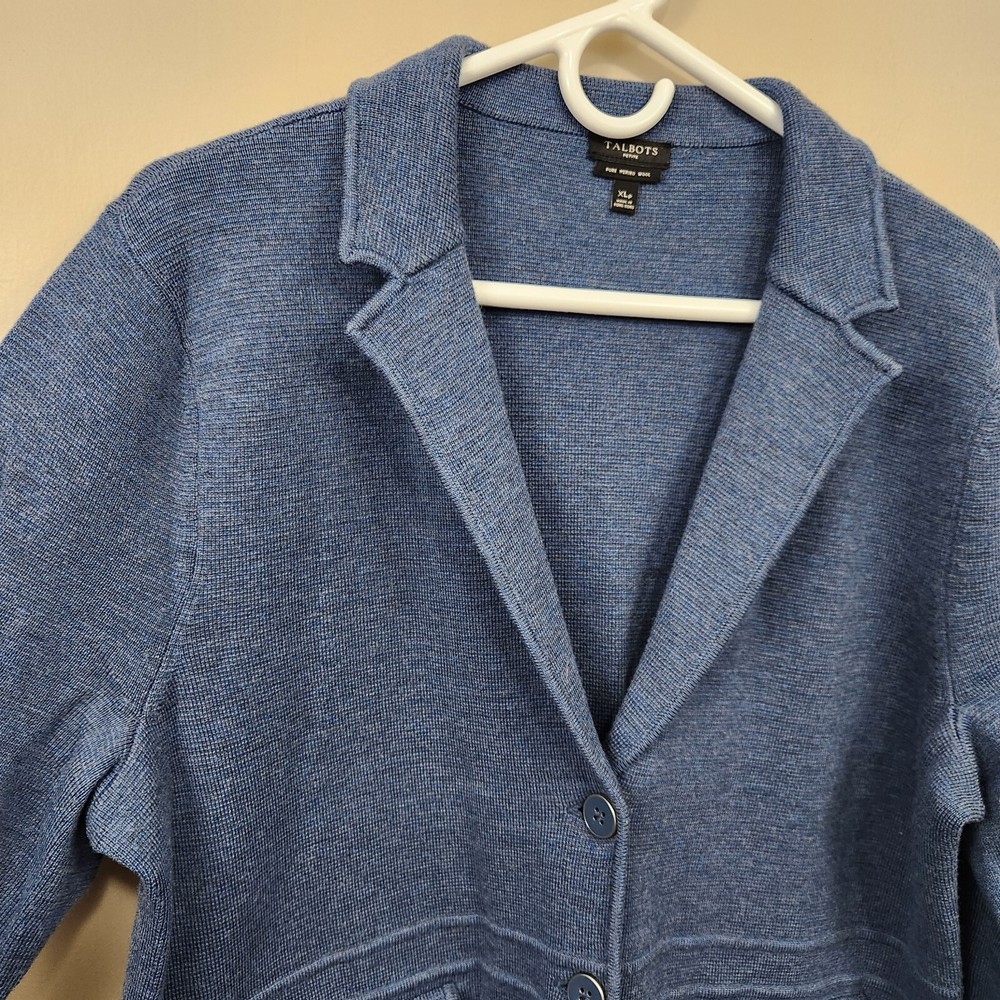 Women's Talbots 100% pure merino wool blue button-front cardigan blazer sweater jacket, size XLP extra large petite. Garment is in excellent preowned condition with no signs of wear. Measurements are approximately 10.5" to the v-neck button closure, 24" in length and 22" across the chest.