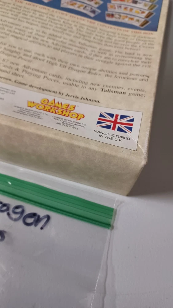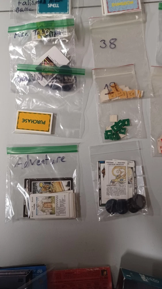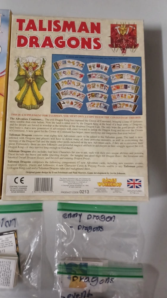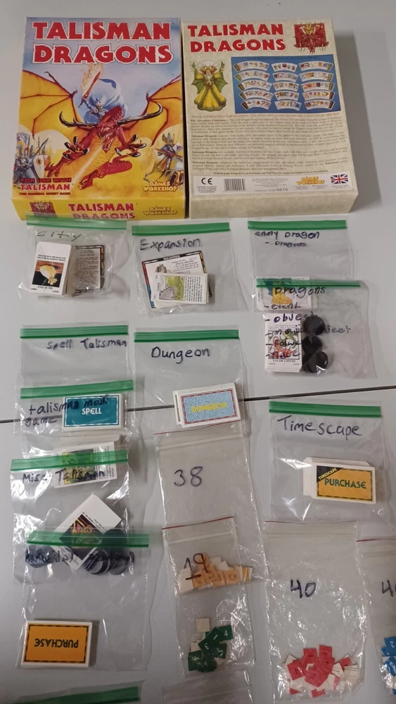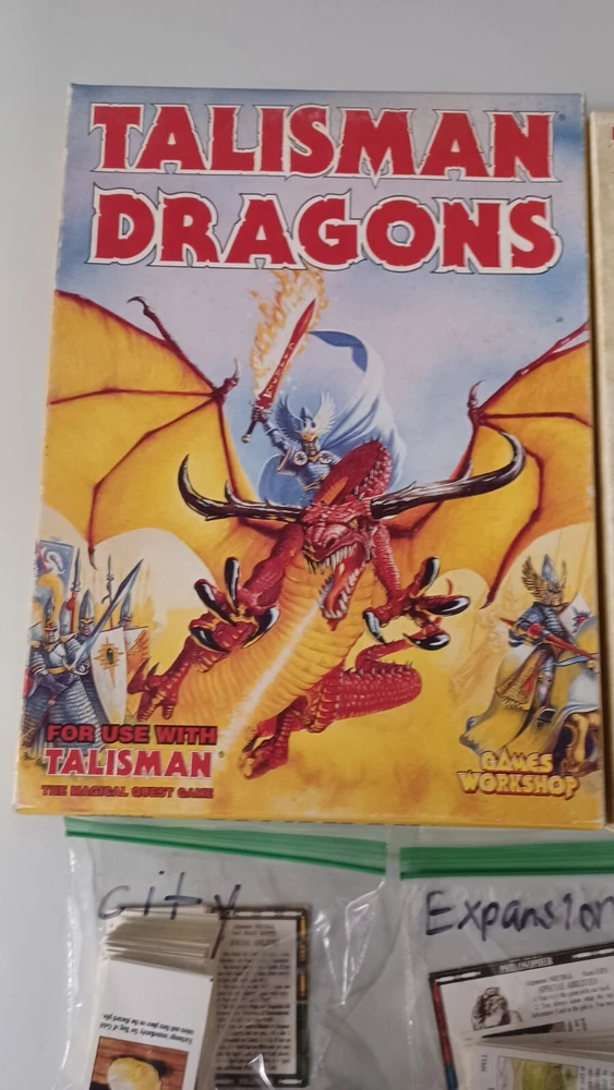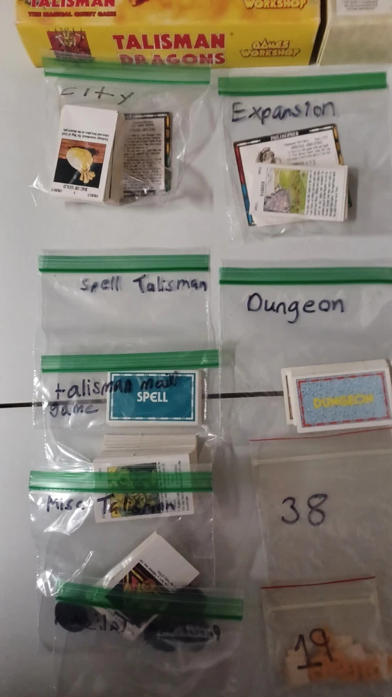 This talisman lot includes mainly just the cards. There are no boards, sheets, or rules for any of the games. Most of them do not have the character cards. All cards were checked against inventory lists. Below is what is included: Main game - No character cards, board, rules, and missing 3 counters. It does all spell, adventure, purchase, and misc cards. also includes all counters, but 3. Timescape expansion - no board, data sheets, or rule book. Includes character, spell, and timescape cards. Adventure expansion - no character, rules, or character sheets. Includes all spell, adventure, and alternative ending cards. City expansion - no character cards, board, stands, or rules. Includes all special character, spell, adventure, dungeon, city adventure, and purchase cards. Dragons expansion - no character or rules cards. Includes box, adventure cards, stands, and dragon king card. Box has minor wear. Dungeon expansion - no character cards, board, rules, or q&a. Includes all adventure and dungeon cards. Talisman expansion - missing all but two character cards. Includes all spell, adventure cards, and philosopher and pilgrim cards.