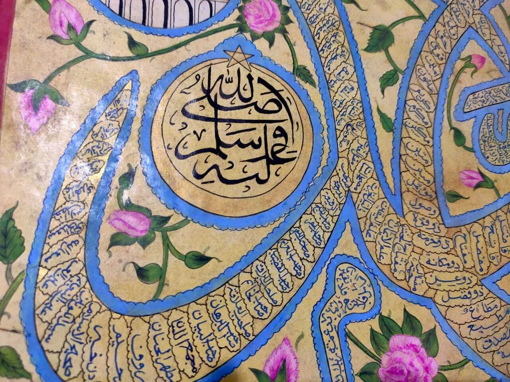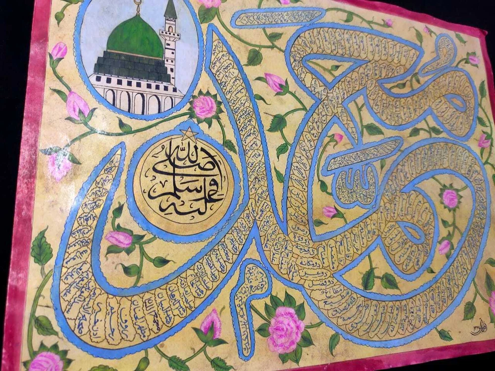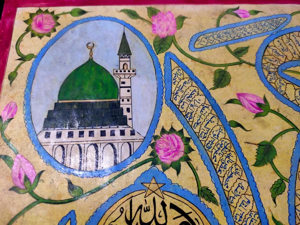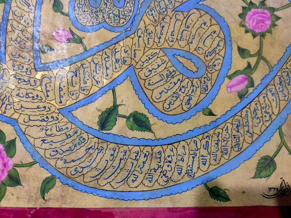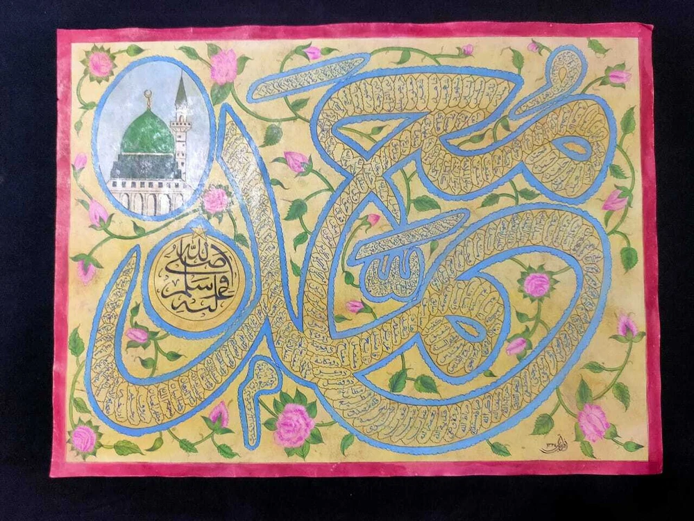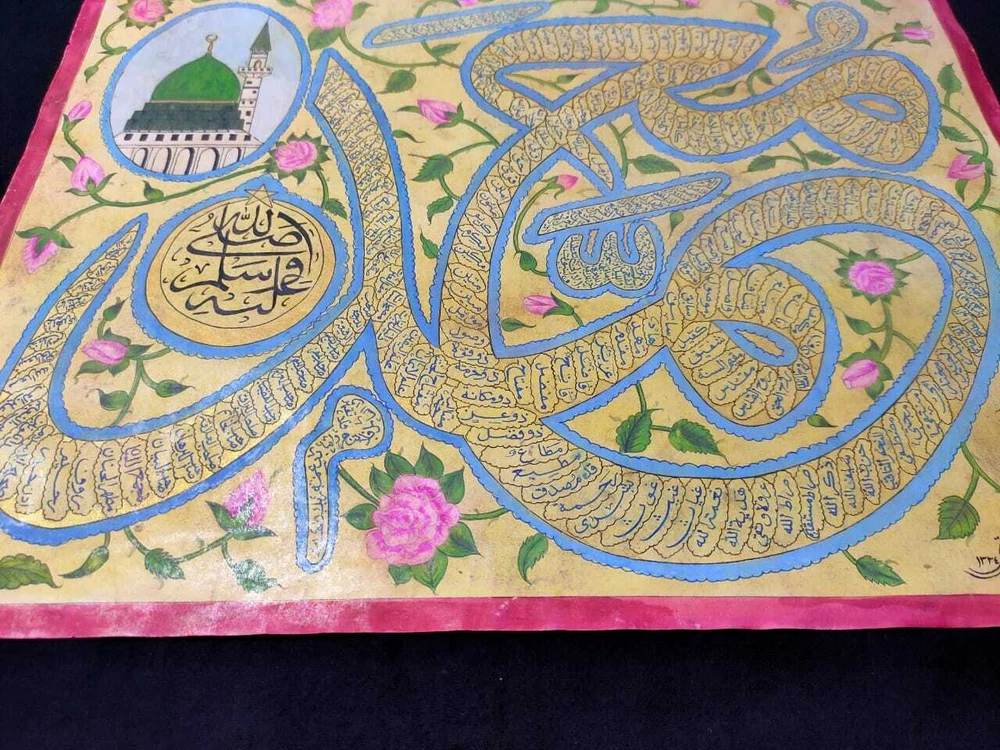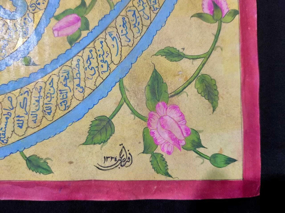 Islamic Art with handwritten Arabic calligraphy on handmade paper(Wasli). A hand-painted artwork on paper that contains Islamic scripts- 99 name of Mohammad surrounded by stylized flower and motifs design known as Tezhip by khatib Aftab Ahmad,1334 Hijri .Take possession of this beautiful Iranian stylized Islamic artwork, and receive a bliss from holy writings. The size of the same is 39 cm by 30 cm approx. A great addition for your vintage art and antique lovers. Best for your collection, home décor or personal gifting. Kindly visit our store for more vintage and antique items. We update daily new listings. Your Feedback is important to us, do leave us positive feedback so we can provide buyer the best services. Any problem and query related to item -please contact us, customer satisfaction is our first priority. We are unable to take any responsibility for any custom delay or tax, reason is because transit time is highly depended and provided by postal service(except weekend and holidays).The bidder/buyer(s) is solely responsible for Import Duties and Custom fees. Happy Shopping with eBay.
