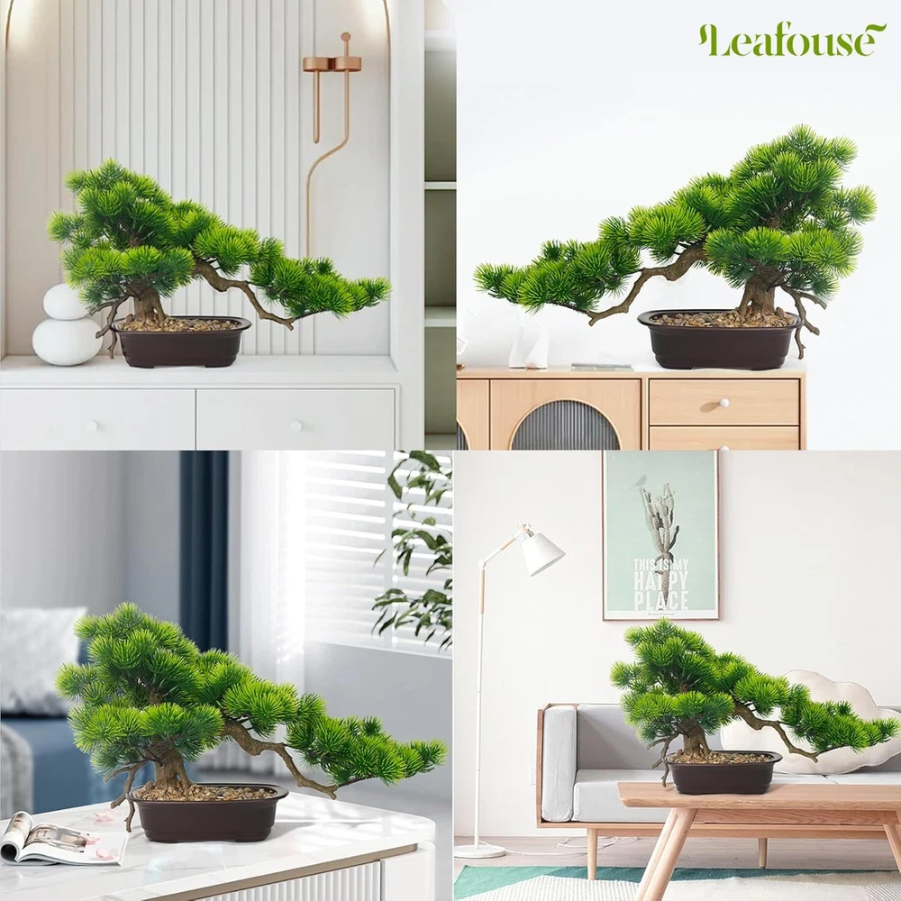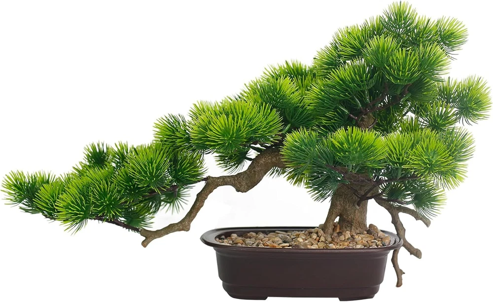 Artificial Bonsai Tree Decoration】Artificial bonsai trees are miniature trees that have been precisely pruned and have realistic leaves and strangely shaped branches, which look as majestic as a real pine tree. Small pebbles in the pots can add a decorative touch and give it a more finished look. 【Eco-friendly Material】Fake bonsai plants tree is made of plastic, which is good texture, no odor , no fading, durable, healthy and environmentally. Bonsai overall height 12",width 20". We have prepared some extra leaves for later maintenance. 【For Good Luck】The fake artificial bonsai tree is believed to make people healthy and live longer in Eastern culture,so it is auspicious to place it in your home, office, bedroom, living room, bookshelf, desk, and windowsill. 【Easy to Maintain】Artificial Plants are easy to keep, it doesn't need trim and watering like real trees. They are suitable for those who are busy but want to decorate their rooms. Branches can be bent until you are satisfied with the shape. 【Warm Attention】Handicrafts decorations will inevitably have flaws, if there are hot melt adhesive left on the plant, just remove them.