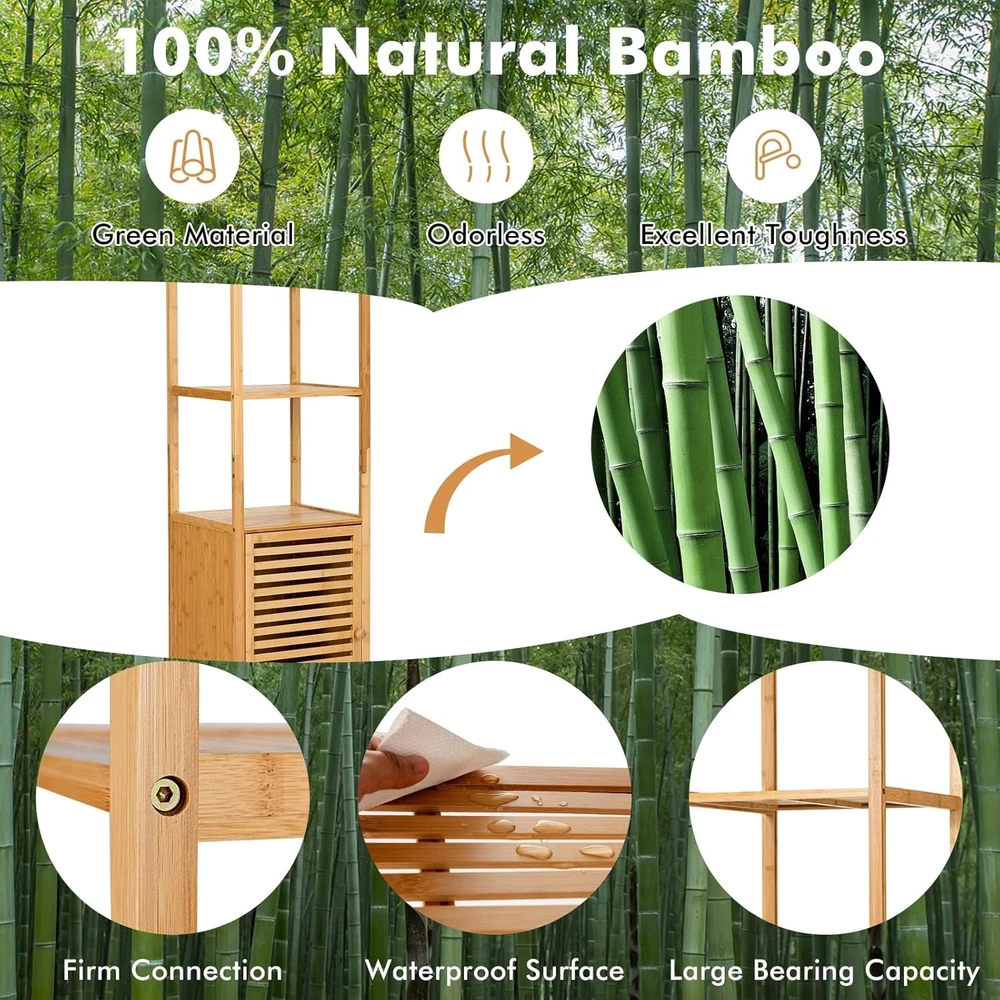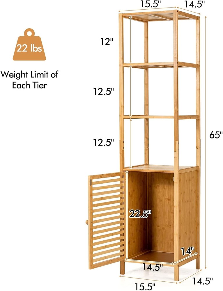 Product Description About this item • Wise Storage Solution to Small space: This bamboo cabinet can be placed in any corner or gap, effectively saving floor space and maximizing the storage function of the room. Besides, the open shelf design offers easy access and make it convenient for you to organize your stuff. • Premium Bamboo Construction: Constructed from natural bamboo, the bamboo storage cabinet is sturdy, and durable especially in bathroom environment. And the surface is smoothly polished for a fine touch. Besides, the overall shelf weighs only 16.5 lbs, so you can move it around with ease. • Versatile Storage Unit for Any Room: Troubled by the messy room? This bamboo shelf will perform its magic and keep any room well organized. You can make it a bathroom floor cabinet to store towels and toiletries, use it to hold spices bottles and small household appliances in the kitchen, or display decorations in living room. • User-friendly Design: To make the tall narrow cabinet a stable unit, we have specially added an anti-toppling device to prevent it from falling over. Meanwhile, the 4 raised feet can provide solid support and enhance overall structure. And the 3-inch clearance makes it easy to clean and keeps out stagnant water. • Easy Assembly & Maintenance: The skinny bamboo cabinet is simply-structured and requires very few efforts on assembly. With easy-to-follow instructions and necessary accessories, you can quickly put it together without any problem. What’s more, the daily maintenance is a breeze, since the surface is smooth and the slatted design easily drains water. On Aug 14, 2025 at 20:01:36 PDT, seller added the following information: