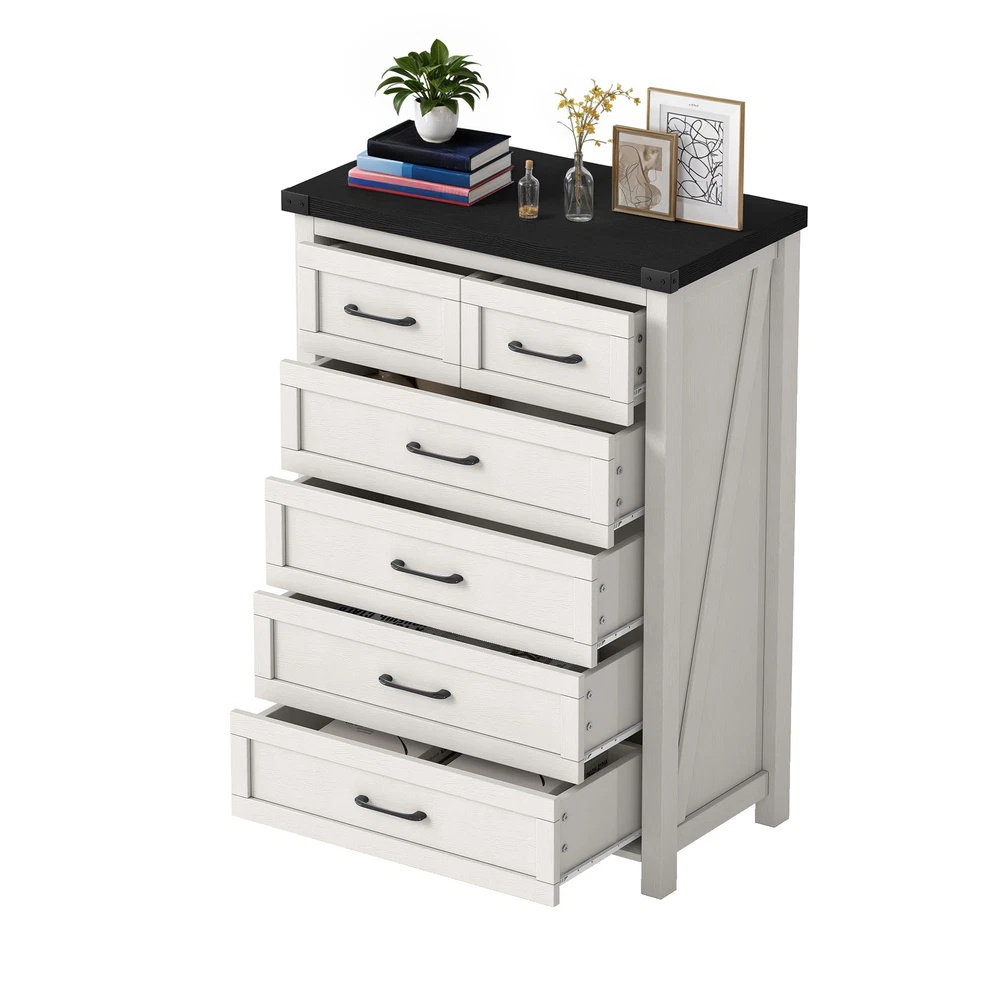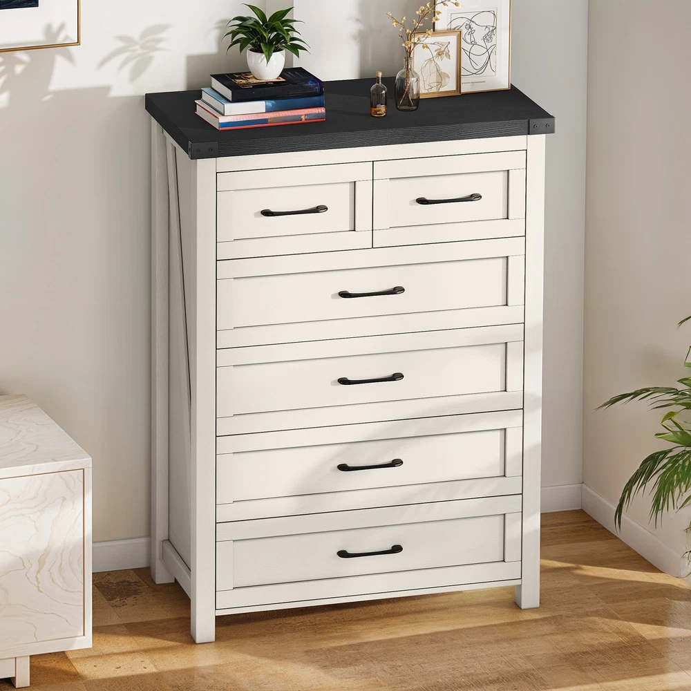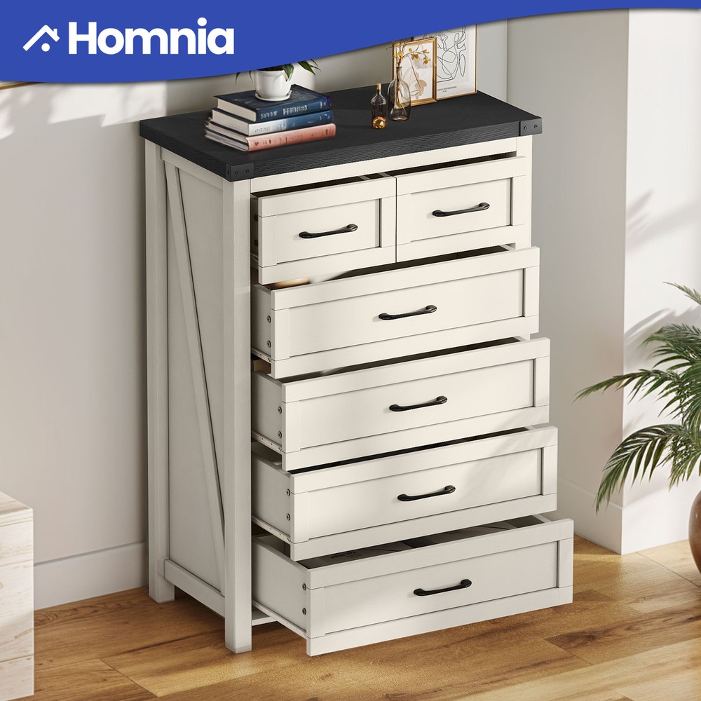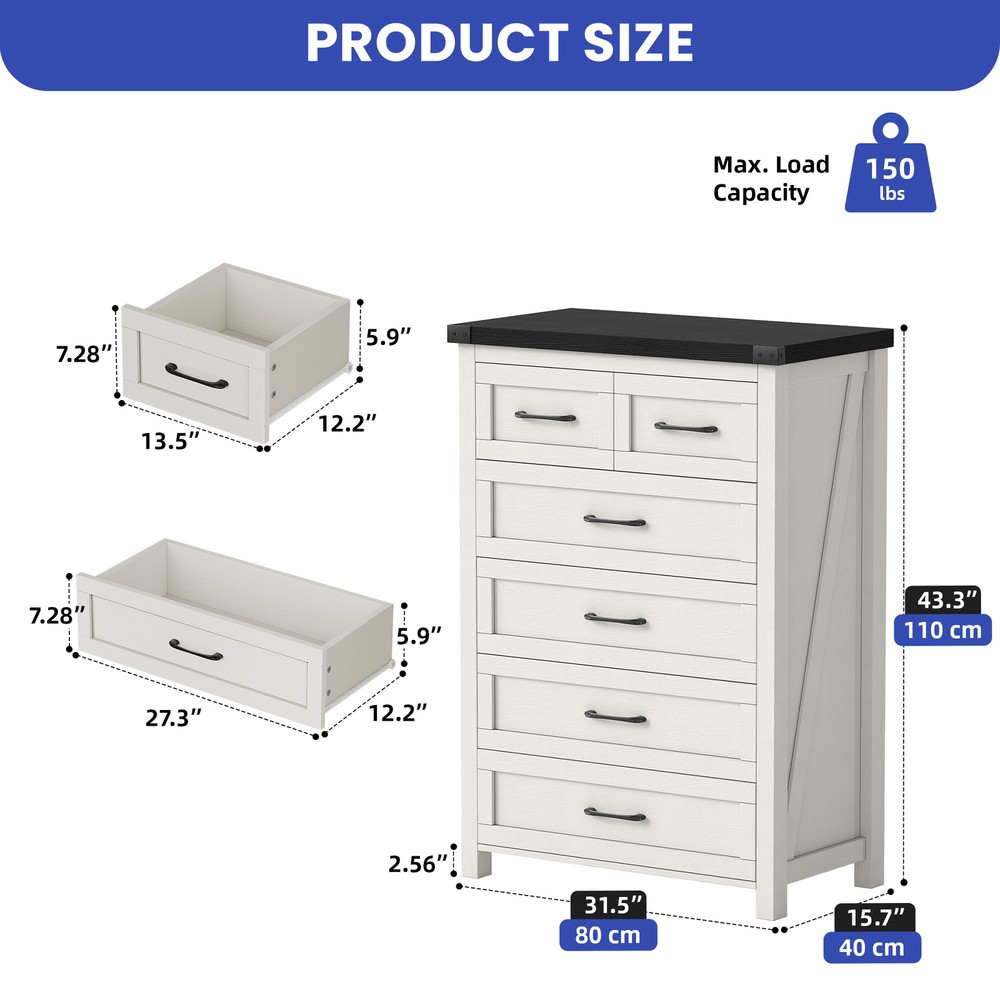 43" Tall Wood Chest of Drawer Modern Tall Dresser 6 Drawers Storage Cabinet Organizer For Bedroom, Living Room, Home Office, White Product Description NOTE: Professional Installation would be Highly Recommended. Description: 1. Color: White 2. Material: P2 grade particle board + Melamine 3. Handle Material: Iron, Metal, Steel 4. Number of Shelves: 6 (4 Large & 2 Small Compartments) 5. Room Placement Recomendation: Entryway, Kitchen, Living Room, Dining Room, Home Office Features: Versatile 6-Shelf Storage Cabinet for Living, Office, Entry Maximize your storage with elegance. This versatile cabinet boasts four large sections and two smaller shelves, perfect for organizing books, decorations, and daily essentials. Its design enhances any living room, office, or entryway while providing clutter-free organization. Heavy-Duty Wood Dresser Crafted with premium materials, this heavy-duty wood dresser boasts a thick, scratch-resistant surface and smooth metal drawer pulls. Its sturdy design and floor-protecting features ensure lasting quality and convenience. Effortless Drawer Access: Sleek Handles & Anti-Scratch Pads Featuring premium smooth-glide rails for easy access and sleek black metal handles for a modern look. Anti-scratch foot pads are included to protect your flooring Rustic Industrial Cabinet Embrace rustic elegance with a contemporary edge in this stylish storage unit. Featuring silent-glide drawers for quiet use and robust black metal accents, its sleek industrial aesthetic adds a touch of refined boldness to any space Stylish & Versatile Organizer Maximize space and style with this multi-purpose storage cabinet—perfect for storing linens, displaying décor, or upgrading your TV setup. Its modern white finish with black accents complements farmhouse, rustic, or contemporary homes. Use it as a media console, sideboard, or general organizer—this cabinet adapts to your needs effortlessly. Easy Assembly & Support Assembles in minutes with included tools and clear instructions. Our friendly customer support team is always ready to assist for a stress-free experience Dimensions: 1. Product Dimensions: 31.5"L x 15.7"W x 43.3"H 2. Large Drawer Cabinet Dimensions : 27.3"L x 12.2"W x 7.28"H 3. Small Drawer Cabinet Dimensions: 13.5"L x 12.2"W x 7.28"H 4. Floor-to-Bottom Distance : 2.56 inch 5. Main Drawer Weight Capacity: 30 lb 6. Overall Product Weight: 131 lb. 7. Maximum Weight Capacity: 150 lb. Package Included: 1 x 6-Drawer Dresser 1 x Accessory 1 x Instruction Notes: 1. Assemble according to the instruction manual. 2. After receiving the package, first confirm that all pieces are included as per the instruction manual. 3. Do not tighten screws too hard when assembling. Firmly tighten only after the entire structure has been constructed. Shipping 1. Normally the item will be dipatched within 1 business day if payment is cleared before 12pm PST. 2. Please verify the correct shipping address in your PayPal account before making the payment. We only dispatch the item to the address that is sent to us at the time of checkout. 3. We don't ship to Hawaii, Alaska, Puerto Rico, APO/FPO/PO Boxes. 4. We don't provide local pick-up service. 5. Normally we will use USPS, UPS, FedEx & LTL to dispatch items. Payment 1. We accept PayPal and credit card. 2. We will ship to the confirmed Paypal shipping address that is provided with the payment only. Return 1. 30 days Money Back Guarantee. 2. Please contact our customer service to receive a RMA form first if want to return the item. 3. All returned items MUST in new condition with the original package. Contact If has any problem, please contact us by sending an ebay message. Our customer service will resolve the problem as soon as possible. On May 4, 2025 at 23:51:57 PDT, seller added the following information: On May 5, 2025 at 00:26:22 PDT, seller added the following information: On Jun 16, 2025 at 03:13:50 PDT, seller added the following information: