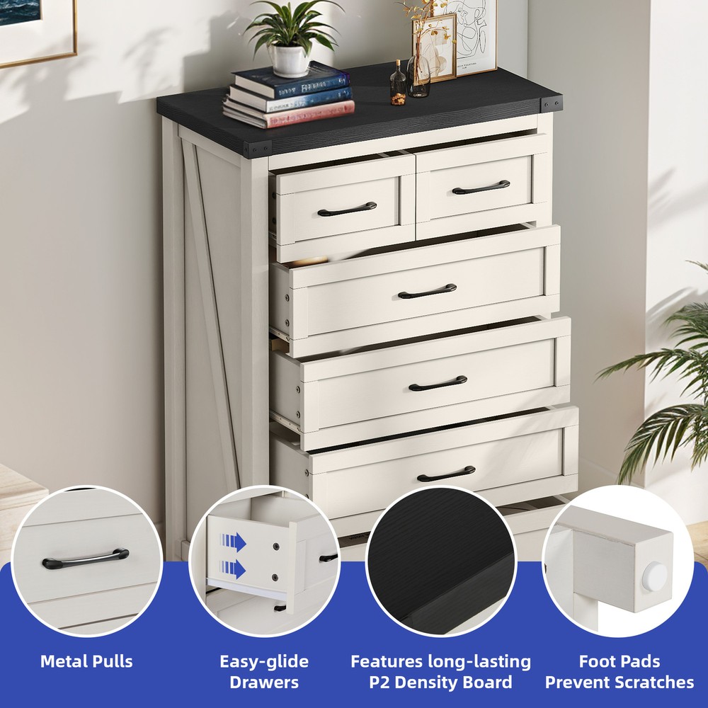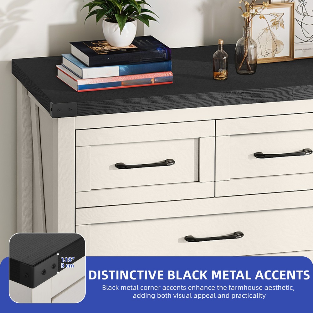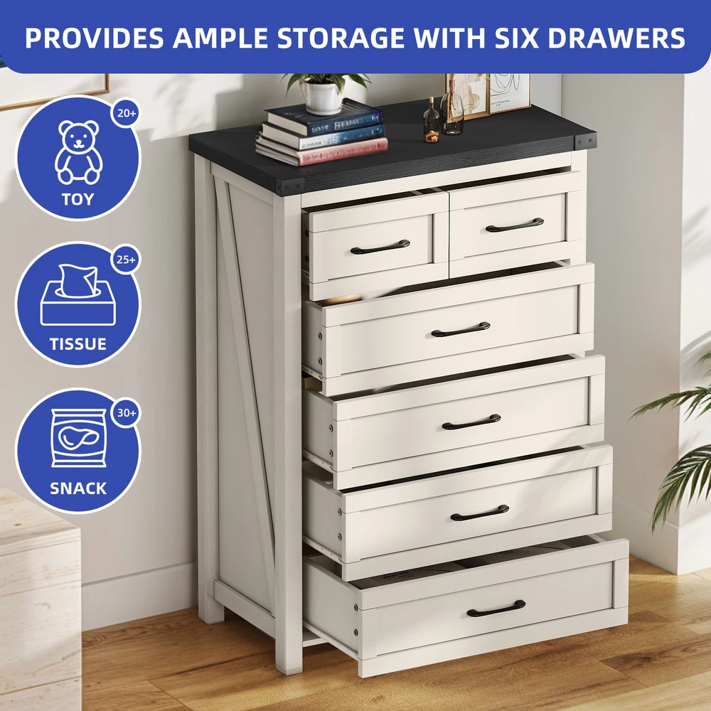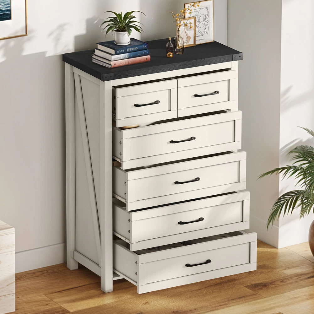 43" Tall Wood Chest of Drawer Modern Tall Dresser 6 Drawers Storage Cabinet Organizer For Bedroom, Living Room, Home Office, White Product Description NOTE: Professional Installation would be Highly Recommended. Description: 1. Color: White 2. Material: P2 grade particle board + Melamine 3. Handle Material: Iron, Metal, Steel 4. Number of Shelves: 6 (4 Large & 2 Small Compartments) 5. Room Placement Recomendation: Entryway, Kitchen, Living Room, Dining Room, Home Office Features: Versatile 6-Shelf Storage Cabinet for Living, Office, Entry Maximize your storage with elegance. This versatile cabinet boasts four large sections and two smaller shelves, perfect for organizing books, decorations, and daily essentials. Its design enhances any living room, office, or entryway while providing clutter-free organization. Heavy-Duty Wood Dresser Crafted with premium materials, this heavy-duty wood dresser boasts a thick, scratch-resistant surface and smooth metal drawer pulls. Its sturdy design and floor-protecting features ensure lasting quality and convenience. Effortless Drawer Access: Sleek Handles & Anti-Scratch Pads Featuring premium smooth-glide rails for easy access and sleek black metal handles for a modern look. Anti-scratch foot pads are included to protect your flooring Rustic Industrial Cabinet Embrace rustic elegance with a contemporary edge in this stylish storage unit. Featuring silent-glide drawers for quiet use and robust black metal accents, its sleek industrial aesthetic adds a touch of refined boldness to any space Stylish & Versatile Organizer Maximize space and style with this multi-purpose storage cabinet—perfect for storing linens, displaying décor, or upgrading your TV setup. Its modern white finish with black accents complements farmhouse, rustic, or contemporary homes. Use it as a media console, sideboard, or general organizer—this cabinet adapts to your needs effortlessly. Easy Assembly & Support Assembles in minutes with included tools and clear instructions. Our friendly customer support team is always ready to assist for a stress-free experience Dimensions: 1. Product Dimensions: 31.5"L x 15.7"W x 43.3"H 2. Large Drawer Cabinet Dimensions : 27.3"L x 12.2"W x 7.28"H 3. Small Drawer Cabinet Dimensions: 13.5"L x 12.2"W x 7.28"H 4. Floor-to-Bottom Distance : 2.56 inch 5. Main Drawer Weight Capacity: 30 lb 6. Overall Product Weight: 131 lb. 7. Maximum Weight Capacity: 150 lb. Package Included: 1 x 6-Drawer Dresser 1 x Accessory 1 x Instruction Notes: 1. Assemble according to the instruction manual. 2. After receiving the package, first confirm that all pieces are included as per the instruction manual. 3. Do not tighten screws too hard when assembling. Firmly tighten only after the entire structure has been constructed. Shipping 1. Normally the item will be dipatched within 1 business day if payment is cleared before 12pm PST. 2. Please verify the correct shipping address in your PayPal account before making the payment. We only dispatch the item to the address that is sent to us at the time of checkout. 3. We don't ship to Hawaii, Alaska, Puerto Rico, APO/FPO/PO Boxes. 4. We don't provide local pick-up service. 5. Normally we will use USPS, UPS, FedEx & LTL to dispatch items. Payment 1. We accept PayPal and credit card. 2. We will ship to the confirmed Paypal shipping address that is provided with the payment only. Return 1. 30 days Money Back Guarantee. 2. Please contact our customer service to receive a RMA form first if want to return the item. 3. All returned items MUST in new condition with the original package. Contact If has any problem, please contact us by sending an ebay message. Our customer service will resolve the problem as soon as possible. On May 4, 2025 at 23:51:57 PDT, seller added the following information: On May 5, 2025 at 00:26:22 PDT, seller added the following information: On Jun 16, 2025 at 03:13:50 PDT, seller added the following information: