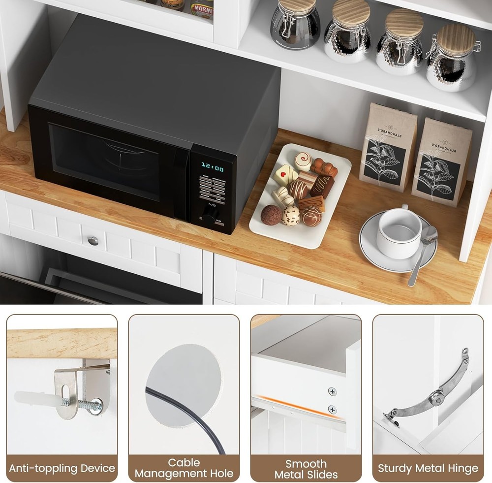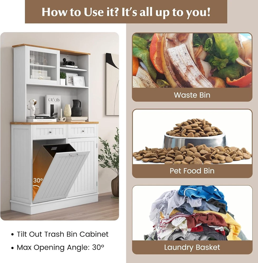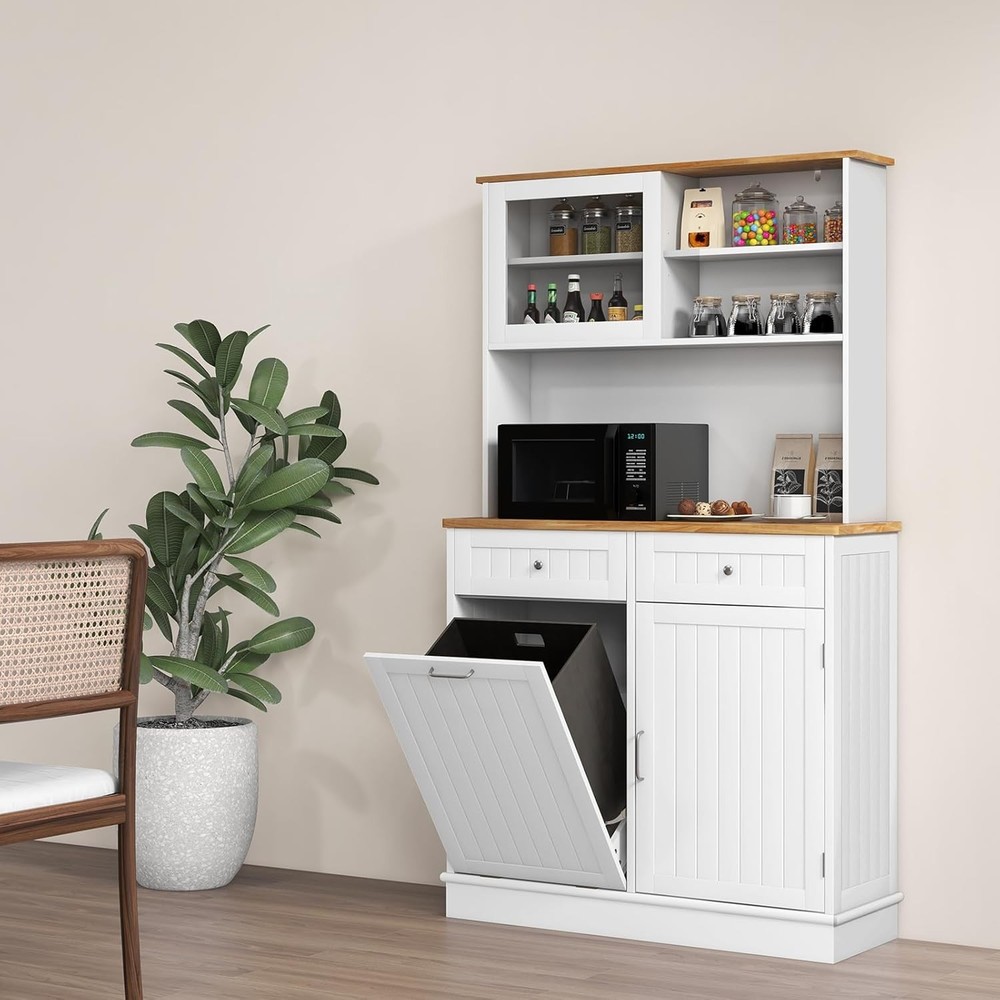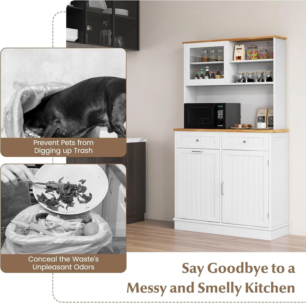 Product Description About this item Multifunctional Hutch Cabinet: 68” tall buffet cabinet combines the functions of closet, bar, T tilting garbage cabinet, storage cabinet and so on. Can be used as hutch cabinet, kitchen island, buffet sideboard, coffee bar cabinet, laundry basket. Large & Sorted Storage Space: Featuring storage hutch, 2 drawers and bottom cabinet, the pantry cabinet provides versatile storage options for your kitchen supplies. Plus, wide rubber wood countertop with cable management hole is a convenient spot to keep appliances with reach. Hidden Garbage Holder: This kitchen hutch cabinet features a hidden 10-gallon holder to conceal the waste’s unpleasant odors and prevent pets from digging up trash. Can not only this tilt out trash bin cabinet serve to be a waste bin in the kitchen, but also be used as a laundry basket in the laundry room, a recycle bin, a pet food bin in the living room. Note: Trash Bin is not included. Use with Convenience: The 3-position adjustable shelves in the food cabinet can maximize the storage capacity of upper and bottom cabinets, ensuring efficient utilization of space. In addition, the sliding tempered glass cabinet allows for more storage convenience. Plus, provides cable management holes for organizing cords. High Reliable Structure: Thickened board with tight connection casts a firmly constructed kitchen cupboard. When set against the wall, the kitchen hutch with trash can storage hold in place with anti-tip devices to prevent rocking or tipping. Description: Say goodbye to a messy and smelly kitchen! This kitchen pantry cabinet features a hidden 10-gallon garbage holder, allowing you to conveniently dispose of waste while keeping it out of sight. With a spacious countertop and drawers, you will get ample storage space for essentials. The adjustable shelves provide flexibility to accommodate your storage needs for various items. Besides, the sliding tempered glass cabinet not only adds display options but also protects your belongings. Meanwhile, specially designed with anti-toppling device, the floor trash cabinet is stable enough to hold kitchen utensils without wobbling.This modern tall kitchen cupboard can be used as recycling cabinet, pet food storage cabinet and laundry sorted cabinet, providing versatility and convenience. Features: 10 gallon trash cabinet can keep pets away from waste and hide smell Rubber wood countertop is sturdy and durable for a long life span Storage cabinets with 3-position adjustable shelves fit different sized items Sliding tempered glass cabinet for easy access 2 drawers provide ample classified space for kitchen supplies Secure the trash can cabinet with anti-toppling device for higher stability Cable hole keep the messy wires hidden at the back Equipped with sturdy metal hinge for 30°max opening angle Smooth metal slides make it convenient to push in and pull out Widely use as a trash cabinet, laundry sorter or recycle bin Specifications: Color: White + Natural Material: MDF, Rubber Wood, Tempered Glass Overall Dimensions: 39.5" x 13.5" x 68" (L x W x H) Upper Storage Cabinet Interior Dimensions (Each): 17.5" x 6.5" x 7.5" (L x W x H) Countertop Dimensions: 39.5" x 12.5" x 16" (L x W x H) Left Side Cabinet Panel: 18" x 24.5" (L x H) Right Side Cabinet Upper Storage Compartment: 18" x 12.5" x 10" (L x W x H) Right Side Cabinet Lower Storage Compartment: 18" x 12.5" x 14" (L x W x H) Drawer Interior Dimensions: 15.5" x 11.5" x 3" (L x W x H) Weight Capacity in Total: 300 lbs Net Weight: 89 lbs Max Opening Angle: 30° Package Includes: 1 x Tilt Out Trash Cabinet 1 x Instruction On Aug 14, 2025 at 20:01:46 PDT, seller added the following information: