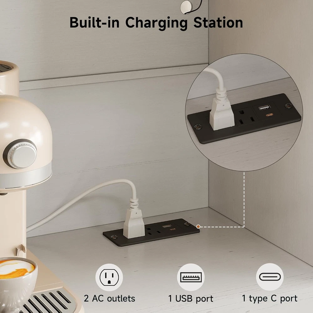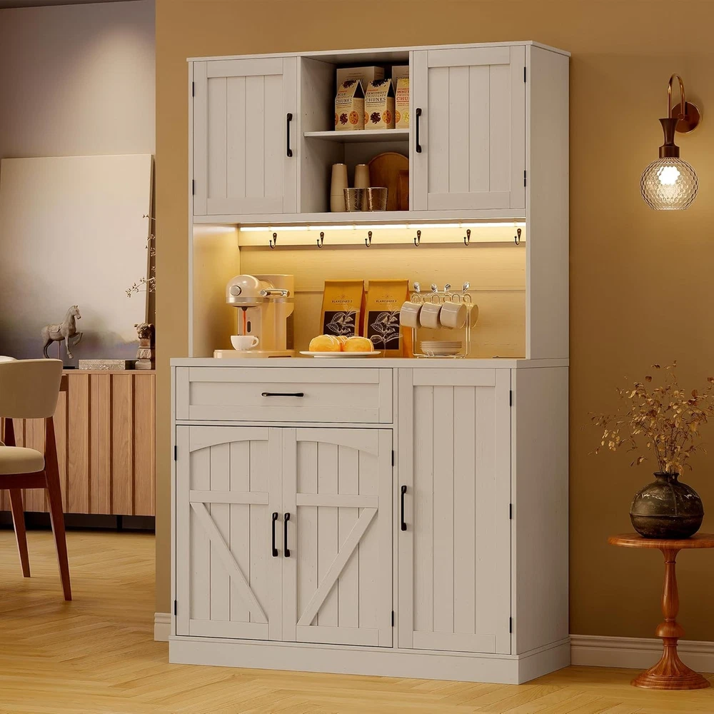 Product Description About this item 71“ TALL PANTRY WITH AMPLE STORAGE: Standing at a towering 71 inches, this kitchen cabinet offers vast storage to maximize your space. With multiple compartments, including cabinets, microwave shelf with 6 hooks, drawers, and door shelves, it’s perfect for organizing pantry items, kitchenware, and more, making it ideal for restaurant kitchens or large households. ADJUSTABLE LED LIGHTING & CONVENIENT POWER OUTLETS: Equipped with energy-efficient LED lights, this kitchen pantry storage cabinet illuminates your stored items clearly, even in low-light conditions. Stay powered up with built-in AC power outlets, a USB port, and a Type-C port. Whether you need to charge kitchen appliances, tablets for recipe viewing, this pantry cabinet keeps your devices within reach and ready to use. KITCHEN HUTCH WITH MICROWAVE SHELF & HOOKS: The cabinet features a dedicated microwave shelf, saving valuable counter space. Additionally, 6 sturdy hooks provide quick access to frequently used utensils like spatulas, ladles, or towels, keeping your workspace organized and efficient. DOOR SHELVES & ADJUSTABLE SHELVES: Tailor the storage to your needs with adjustable shelves and door racks. Whether you're storing tall bottles, bulky pots, or delicate spice jars, this kitchen pantry cabinet adapts effortlessly, ensuring every inch of space is optimized for your restaurant's unique requirements. MATERIAL SAFETY & DURABILITY: Crafted from top-tier, durable materials, this kitchen pantry cabinet is engineered for exceptional solidity, ensuring it withstands daily use with ease. For added safety, it includes wall connection fixers that allow you to securely attach the cabinet's back to the wall. This feature provides peace of mind, especially in high-traffic areas like restaurant kitchens or bustling households. EASE OF INSTALLATION: Assembly is a breeze with this kitchen pantry cabinet. All parts and accessories are conveniently numbered, and each installation step is accompanied by clear, detailed instructions. We prioritize your convenience and satisfaction, which is why we conduct thorough checks before delivery to ensure everything is in perfect order and ready for assembly. 71" Tall Kitchen Pantry Cabinet with LED Light & Outlet & Drawer Previous page Kitchen Hutch Cabinet Generous counter space fits various home appliances Spacious Countertop Features LED light, charging station, and 6 cup hooks Drawer & Door Shelf Deep drawer keep utensils in perfect order Next page Pantry Storage Cabinet with Microwave Shelf & 6 Hooks Previous page Charging Station Light Strip Next page Previous page Next page On Aug 14, 2025 at 20:05:44 PDT, seller added the following information: