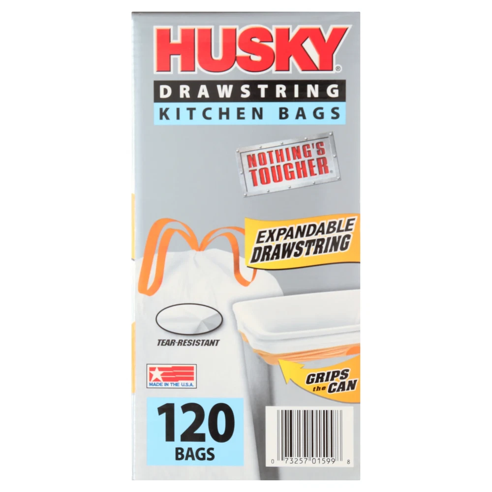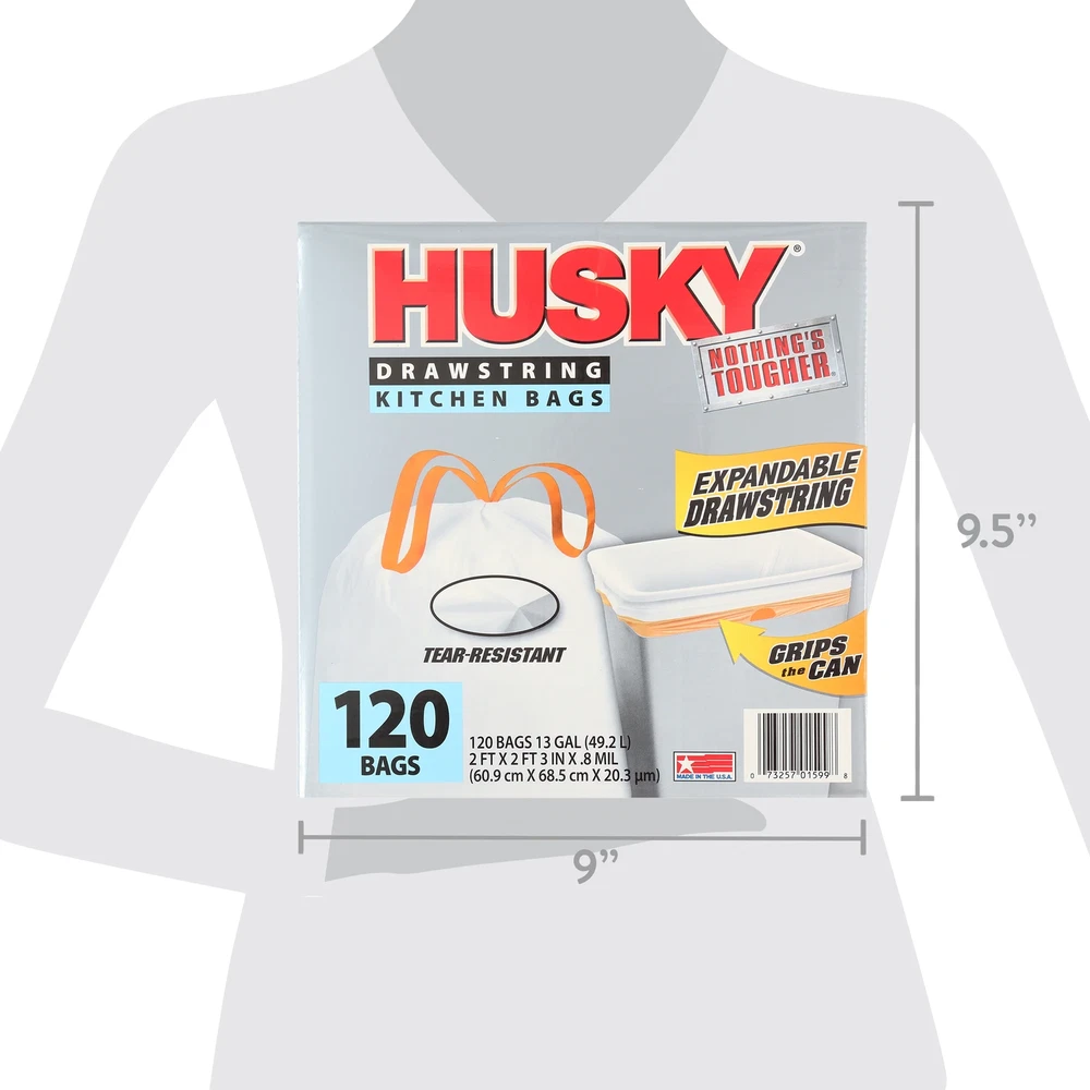 Husky 13 Gallon Drawstring Unscented Tall Kitchen Bags resist tears and punctures so you can transport your kitchen waste to the curb with confidence. These 24 inch by 27 inch kitchen bags fit most standard-size kitchen trash cans. Manufactured with high quality expandable drawstring which grips the can, keeping it in place. 120 bags per box. Manufactured with 20% post-consumer recycled content. Husky 13 gal 120 count 24" x 27" 0.8 mil thickness One-by-One dispensing Unscented Manufactured with 20% post-consumer recycled plastic Great for residential, indoor trash