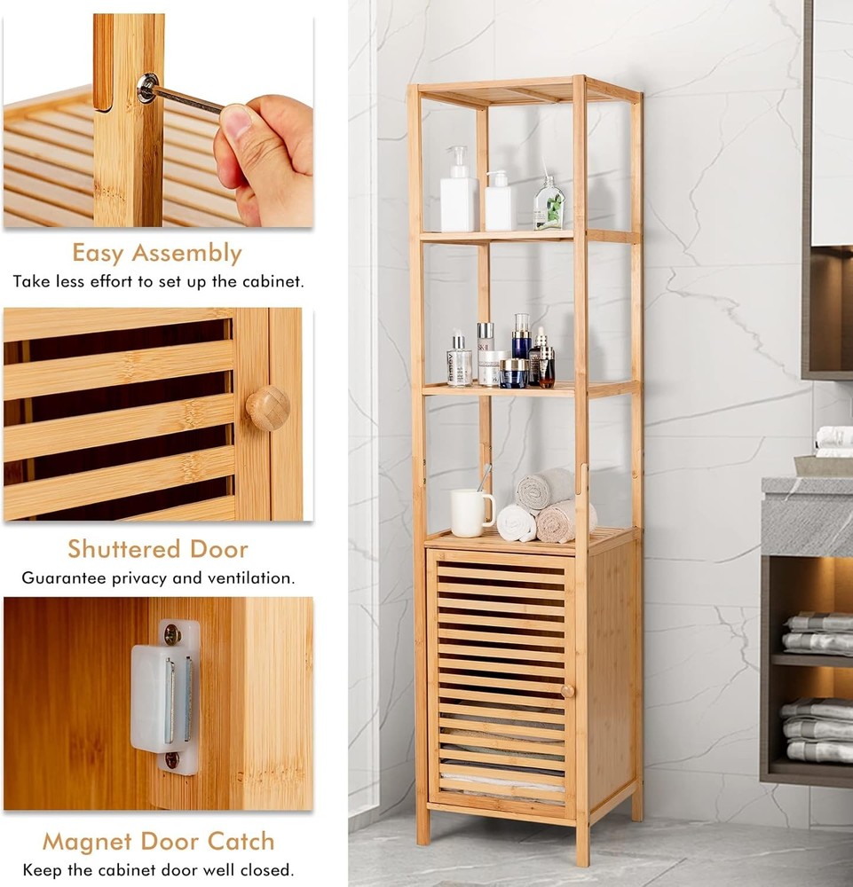 Tall Bamboo Cabinet, Narrow Bathroom Floor Storage Cabinet with 3 Tier Shelves & Shutter Door, Slim Linen Tower Cabinet for Living Room or Kitchen, 15.5 x 14.5 x 65 inches Product Description About this item Wise Storage Solution to Small space: This bamboo cabinet can be placed in any corner or gap, effectively saving floor space and maximizing the storage function of the room. Besides, the open shelf design offers easy access and make it convenient for you to organize your stuff. Premium Bamboo Construction: Constructed from natural bamboo, the bamboo storage cabinet is sturdy, and durable especially in bathroom environment. And the surface is smoothly polished for a fine touch. Besides, the overall shelf weighs only 16.5 lbs, so you can move it around with ease. Versatile Storage Unit for Any Room: Troubled by the messy room? This bamboo shelf will perform its magic and keep any room well organized. You can make it a bathroom floor cabinet to store towels and toiletries, use it to hold spices bottles and small household appliances in the kitchen, or display decorations in living room. User-friendly Design: To make the tall narrow cabinet a stable unit, we have specially added an anti-toppling device to prevent it from falling over. Meanwhile, the 4 raised feet can provide solid support and enhance overall structure. And the 3-inch clearance makes it easy to clean and keeps out stagnant water. Easy Assembly & Maintenance: The skinny bamboo cabinet is simply-structured and requires very few efforts on assembly. With easy-to-follow instructions and necessary accessories, you can quickly put it together without any problem. What’s more, the daily maintenance is a breeze, since the surface is smooth and the slatted design easily drains water.