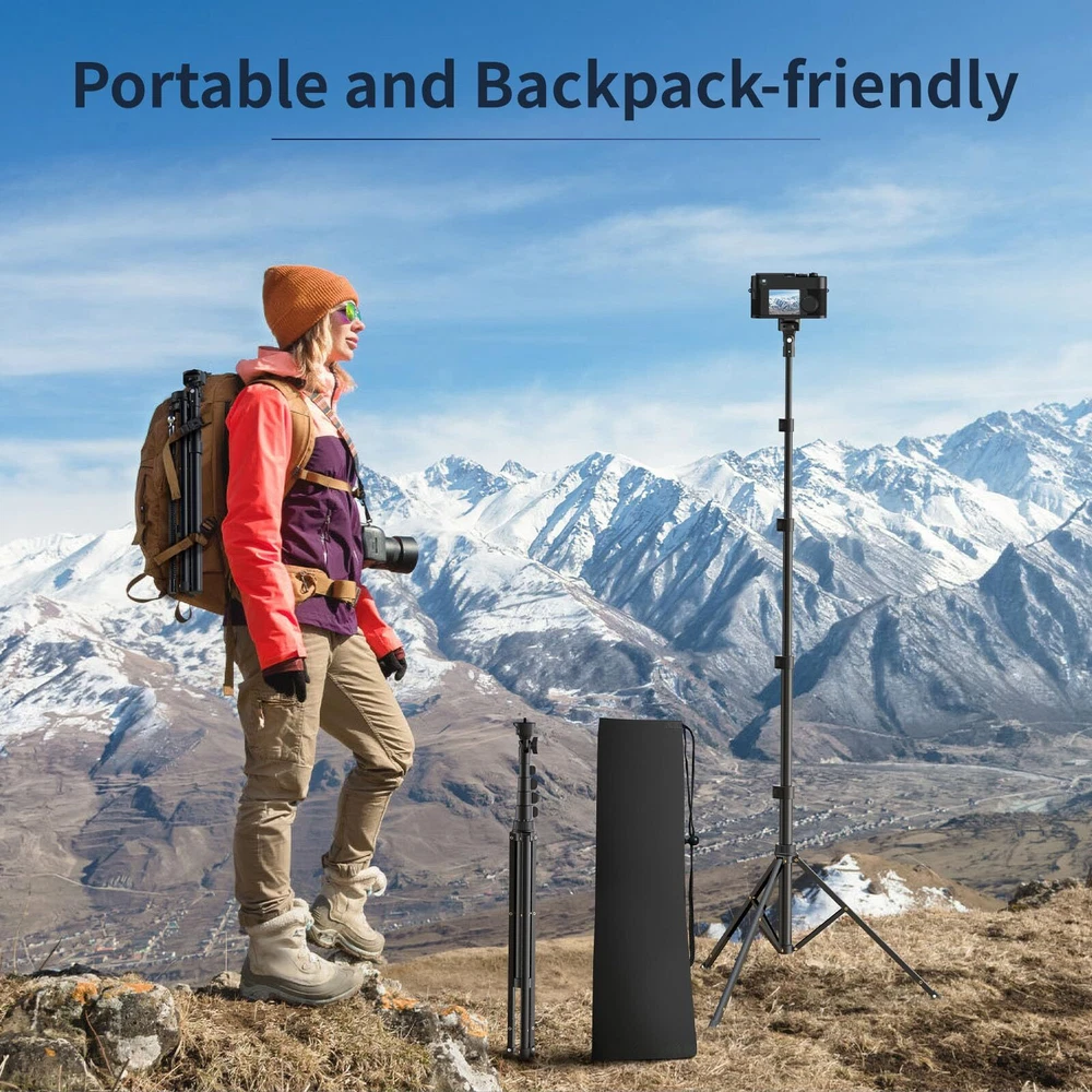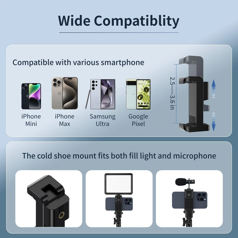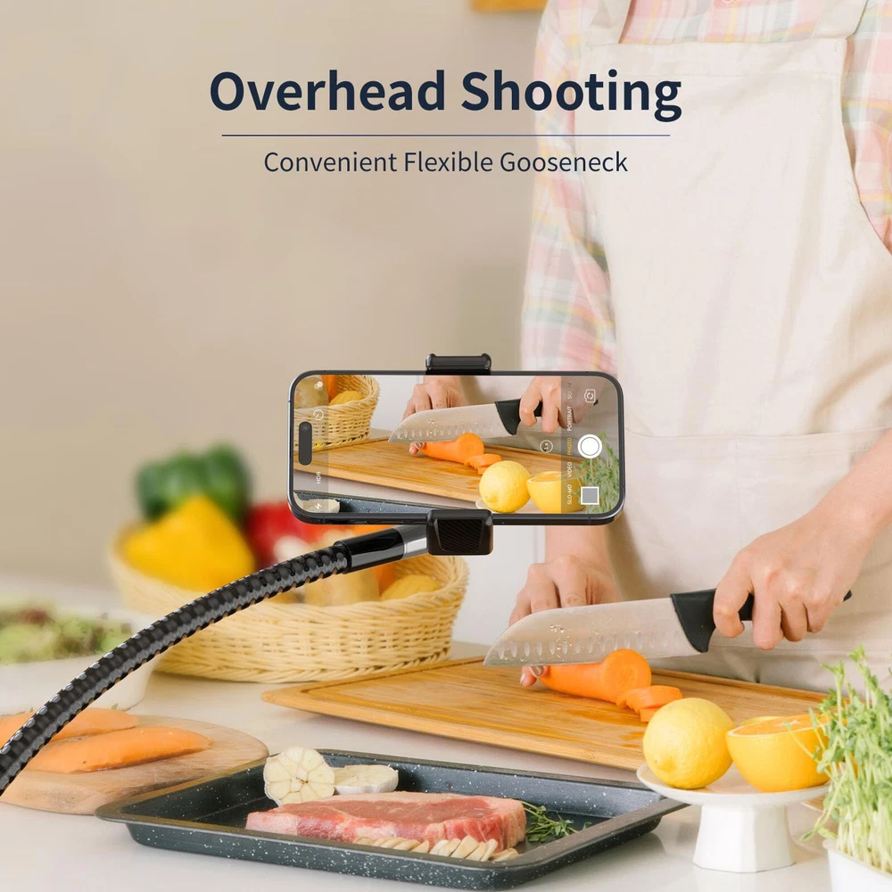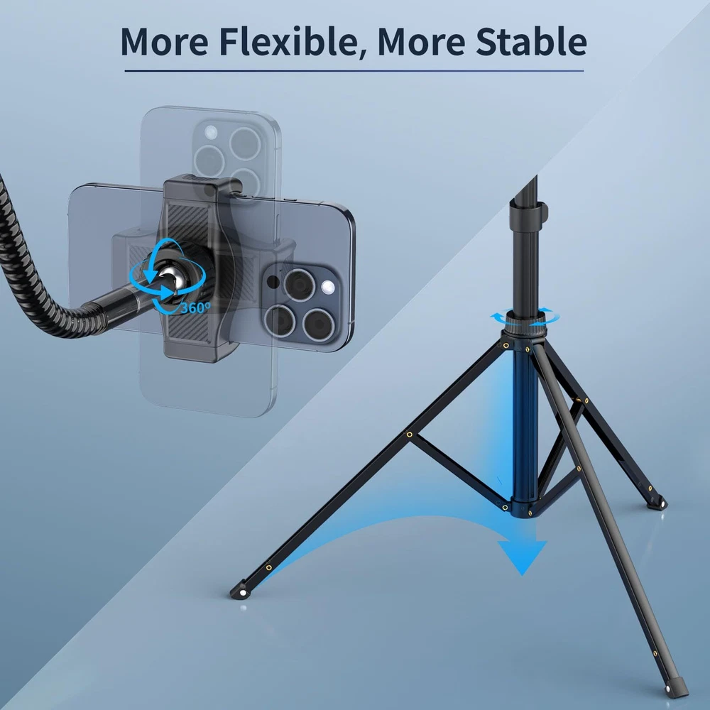 Highly Flexible Gooseneck Stand: Our phone tripod stand features a 15" gooseneck that bends in any direction, ensuring perfect shots from any angle. Ideal for selfies, photography, live streaming, family moments, travel adventures, and video recording. Adjustable and Sturdy Phone Tripod: 's flexible tripod extends from 23 to 86 inches using a quick flip-lock system. Made from premium aluminum alloy with non-slip rubber feet, it provides outstanding stability and durability, perfect for all your photography needs. Multi-Angle Shooting: Equipped with a 360° rotating ball head, this tall tripod allows effortless switching between horizontal, vertical, upward, and downward angles. Enjoy unparalleled flexibility and easily adjust your phone to the perfect viewing angle. Enhanced Accessories: Our device includes a phone holder for devices from 2.3 to 5.5 inches, compatible with iPhone and Android smartphones. It also features an upgraded cold shoe mount for lights or microphones and a wireless Bluetooth remote with a range of up to 33 feet. Everything is neatly packed in a portable travel bag. Effortless Selfie Stick: This versatile, adjustable overhead tripod includes a detachable center selfie stick, making it lightweight and user-friendly. Perfect for both indoor and outdoor events, it offers a wide range of adjustability for the perfect shot. Plus, backs your purchase with a 24-month warranty for total peace of mind.