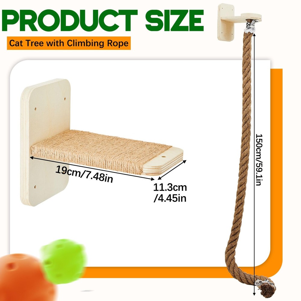 Features: Wall mounted cat tree provides your cats with lots of opportunities to climb, play, and exercise, promoting a good and active lifestyle. The cat climbing rope and shelves set can satisfy your cat's scratching needs while protecting your furniture from cat claws. Specifications: Material: solid wood, jute Color: wood Size: Total height: about 59.1 inches/ 1.5 m Cat platform: 7.48 x 4.45 inches/ 19 x 11.3 cm Package includes: 1 x Set of Cat tree with climbing rope 1 x English instruction manual Notes: Manual measurement, please allow slight errors on size. The color may exist a slight difference due to different screen displays. Small parts included, please keep them away from little kids to avoid swallowing risk. Dual Platform Design: it comes with 2 pieces of cat wall steps and a jute cat climbing rope, that allows cat to jump between levels, and provides a cozy space for it to relax and nap, ensuring they can recharge after playing Proper Size: the cat tower with climbing rope measures about 59.1 inches/ 1.5 m in total height, which satisfies cats' natural desire to stand in high places for a sense of security and climbing instinct, encouraging their active play and exploration, bringing them an interesting experience Sturdy and Durable: our wall cat rope scratching post set is made of quality solid wood and 1.97 inches/ 5 cm thick jute rope, which is strong and safe, not easy to break, it can bear the weight of most cats and help cats sharpen their claws and meet their scratching needs Easy to install: holes have been drilled in the wood of this wall climbing cat toy, and nails and instructions are prepared, you can just install it directly on the wall according to the steps and the heights you want Space Saving: the cat tree with climbing rope features wall mounted design for saving your floor space, it will offer a stable and secure climbing solution for small space or apartments, providing a vertical playground that maximizes your space