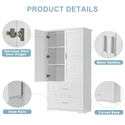 Tall White Bathroom Storage Cabinet with Doors & Drawers – Adjustable Shelf, MDF, Modern Freestanding Organizer free&fast shipping !!! Desctiption : Bring elegance and order to your space with this Tall White Storage Cabinet , crafted from durable painted MDF wood . Designed to suit bathrooms, kitchens, or even offices, this freestanding unit features two large drawers and a double-door cabinet with adjustable shelving —perfect for storing towels, toiletries, pantry items, or decorative pieces. ✅ Key Features: Sturdy & Elegant: Made of premium painted MDF with smooth, waterproof surfaces Spacious Design: Features 2 deep drawers and a 3-tier cabinet behind double doors Adjustable Shelf: Customize the internal layout to suit your needs Safe for Families: Includes an anti-toppling device for wall attachment Versatile Use: Ideal for bathroom, kitchen, laundry room, or living room Easy to Assemble: All tools and instructions included 📦 Product Specifications: Main Color: White Main Material: MDF (Medium-Density Fiberboard) Overall Dimensions: 32” L x 15” W x 63.2” H Drawer Inner Size: 31.3” W x 11.9” D x 7.1” H Shelf Weight Capacity: 45 lbs each Drawer Weight Capacity: 25 lbs each Net Weight: 72.75 lbs Assembly Required: Yes Certification: CARB P2 Compliant 📦 Package Includes: 1 × Tall Bathroom Cabinet 2 × Large Drawers (pre-cut panels) 2 × Cabinet Doors 3 × Interior Shelves (1 adjustable) 1 × Hardware Pack (screws, hinges, anti-tip kit) 1 × Step-by-Step Instruction Manual ✨ Whether you're upgrading a small bathroom or organizing a busy kitchen, this stylish and practical cabinet provides the perfect balance of beauty and functionality .