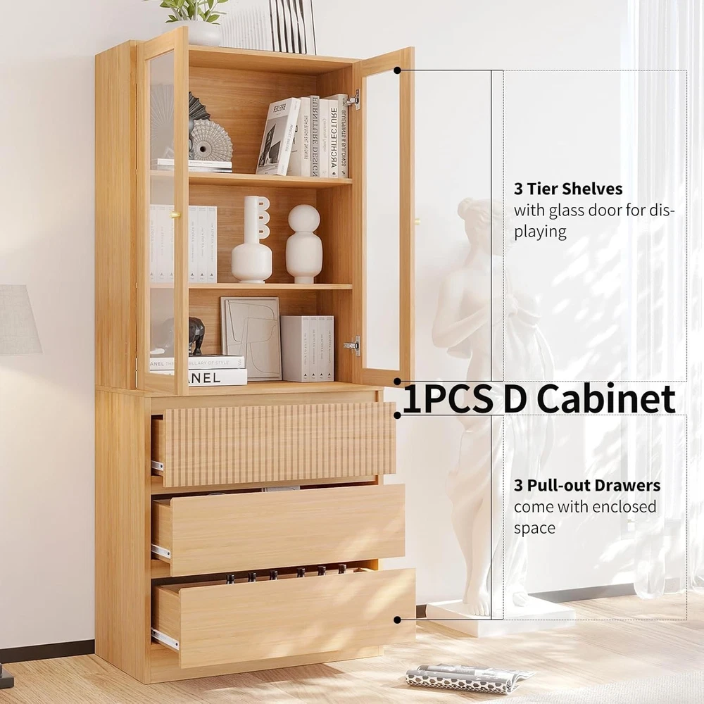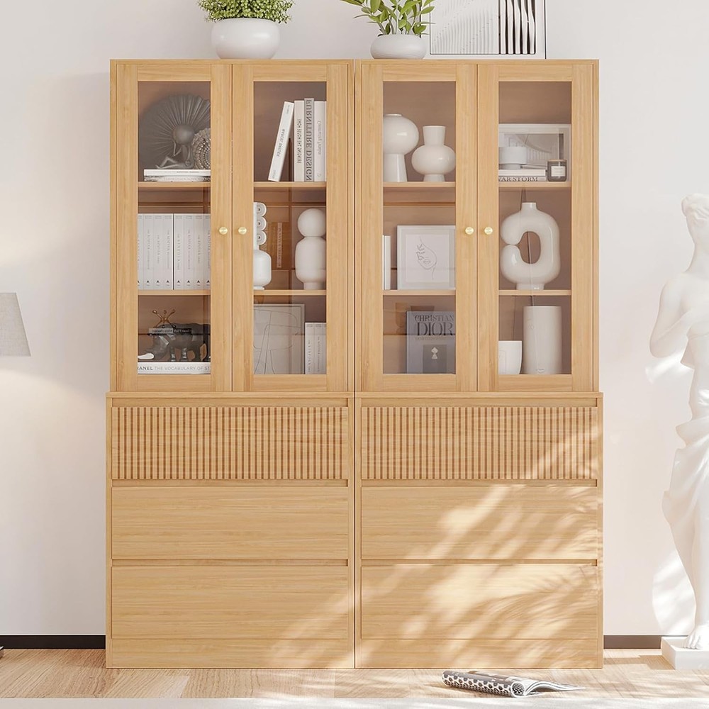Wood Bookcase Cabinet, 71’’ Freestanding Tall Storage Cabinet with 2 Tempered Glass Doors, Modern Kitchen Cupboard Large Floor Cabinet for Kitchen, Living Room, Home Office (D) Product Description About this item 【SIMPLE DESIGN】The natural wood texture and vertical stripe decoration enhance the visual effect of the furniture, whether it is the living room, bedroom, dining room or study, it can be perfectly integrated into your home environment and enhance the practicality and aesthetics of the space. 【QUALITY MATERIAL】This bookcase is made of high quality MDF, ensuring its durability and reliability. The surface is smooth and easy to clean and maintain, just wipe it gently with a damp cloth to remove stains and keep the bookcase neat and beautiful. The top of the bookcase has an anti-tipping device, which can effectively enhance the stability of the bookcase and prevent it from accidentally tipping over during use. 【TEMPERED GLASS DOORS & SHELVES】Multi-tier design keeps clutter in its place, this bookcase has 3 shelves behind the upper cabinet door and 2 shelves behind the lower cabinet door. Toughened glass doors protect your belongings from dust and dirt, and documents and office items are easy to see, easy to access, and multiply your work efficiency. 【MULTIFUNCTIONAL BOOKCASE】The wood grain design is clear and natural, and the vertical stripe design gives the cabinet a unique texture, making it an ideal addition to all types of living spaces and storage areas. Whether it's for storing clothes, display items or other daily necessities, it can find its place as a storage cabinet in a study, home office, bedroom or living room or kitchen. 【ASSEMBLY NOTE】Please review the list of hardware/screws/planks in the instructions before assembling. Please follow the instructions step by step to assemble carefully, each part is labeled to prevent damage caused by violent installation. This versatile cabinet is practical and artistic, not only providing storage space, but also enhancing the quality of life. Designed with a wood-colored vertical stripe finish visually elongates the product, enhancing the sense of space and dimension. Simple and stylish, it adapts to a variety of home styles, including modern minimalist, Scandinavian and retro classical. It makes life more organized and adds warmth and harmony to the home.