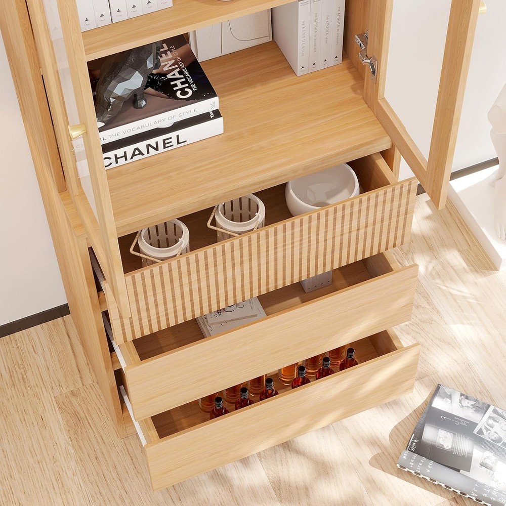 This stylish wood bookcase cabinet is a perfect blend of function and modern design. The natural wood grain and clean lines add elegance to any room, while the tempered glass doors keep items dust-free yet visible. Sturdy and spacious, it’s great for displaying books, decor, or kitchen essentials. Easy to assemble and versatile enough for living rooms, offices, or dining areas—definitely a great addition to any home!