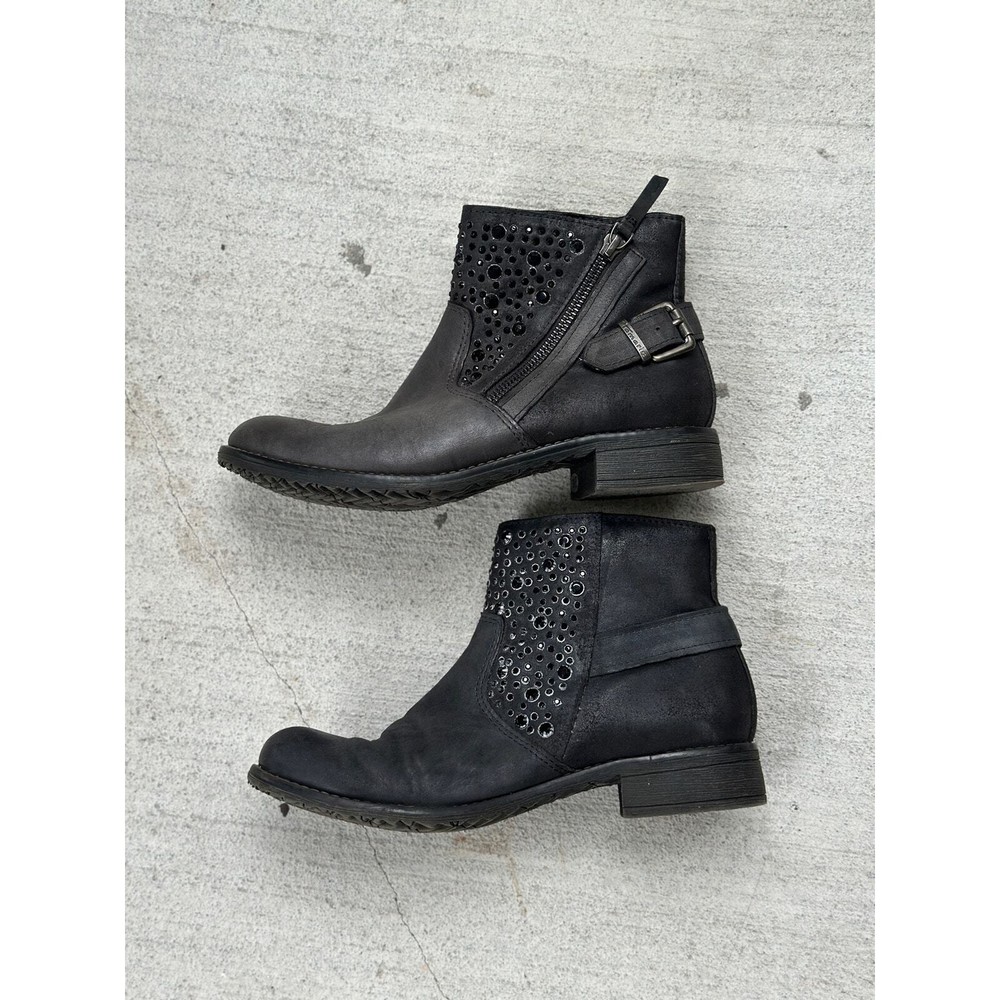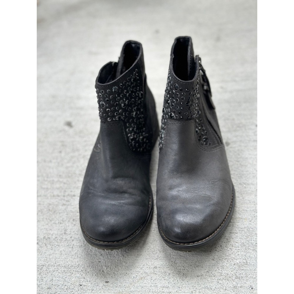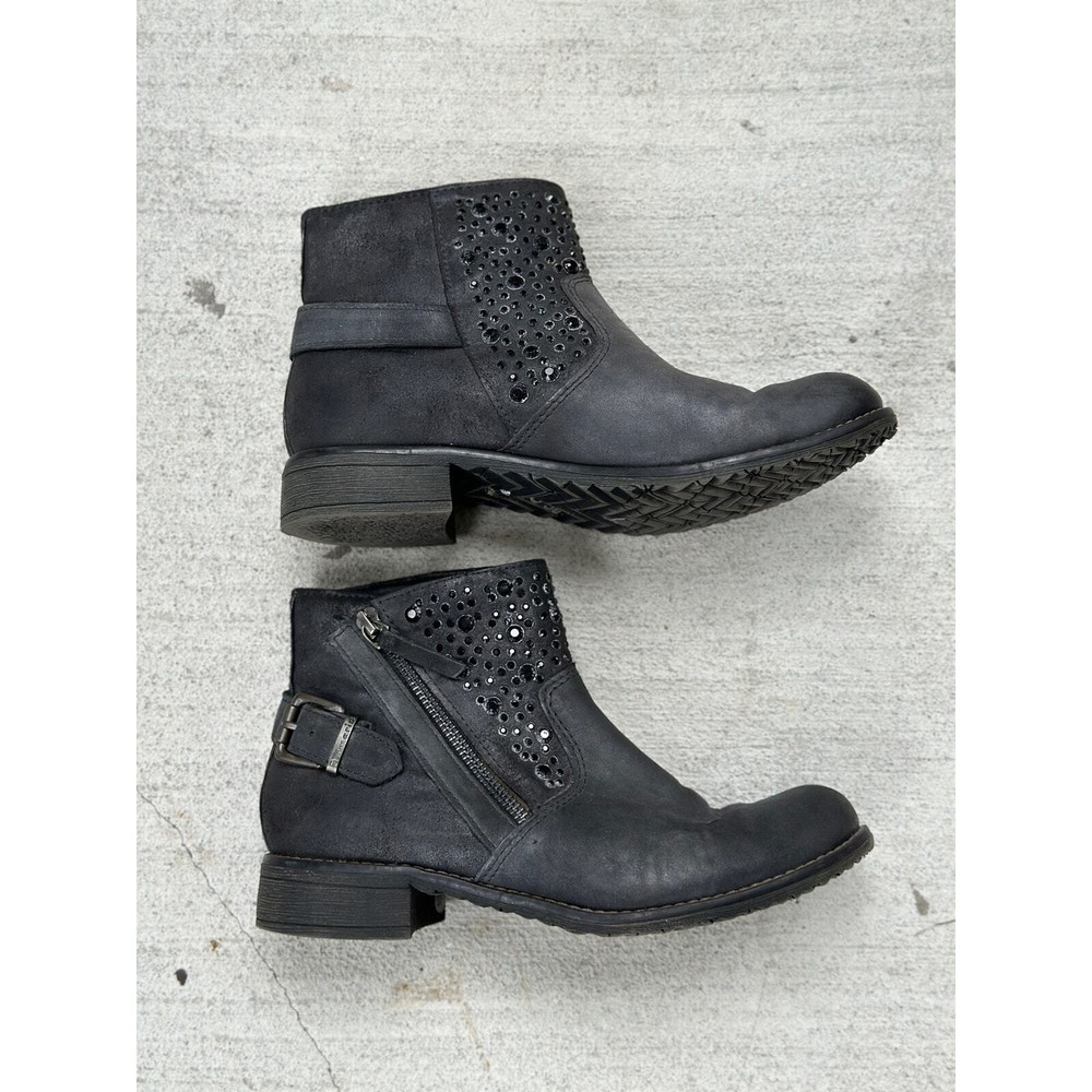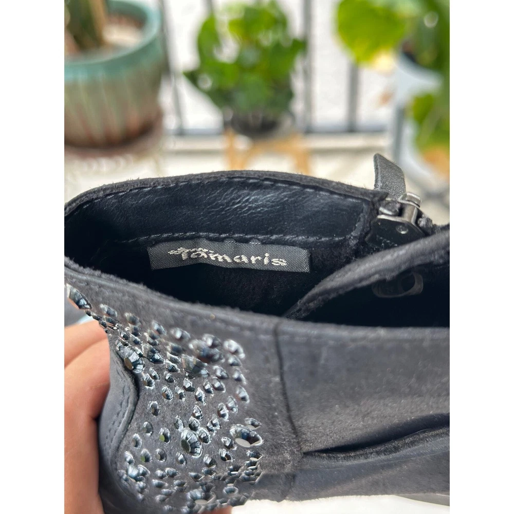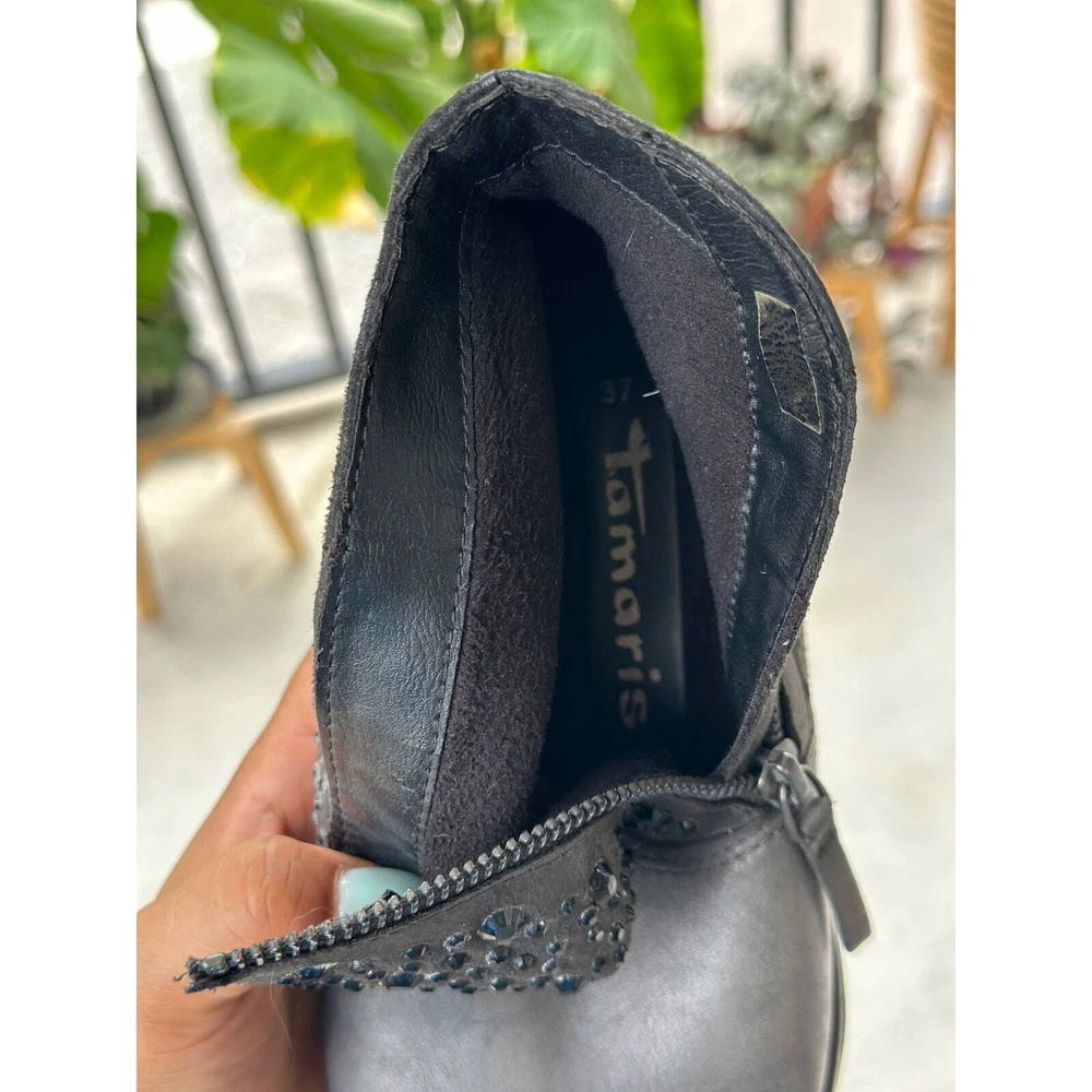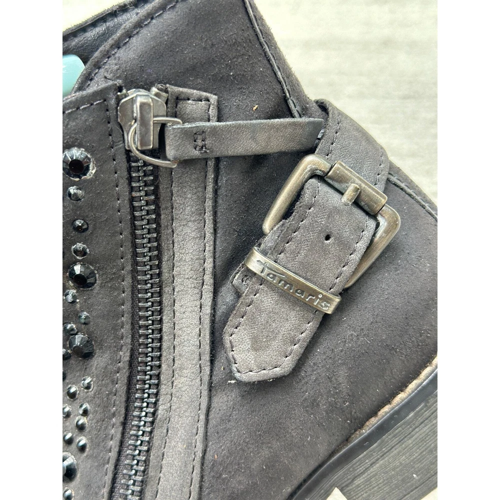 Tamaris Anthracite Ankle Boot EU 37 Gray Leather Distress Stud Rhinestone Bootie All items are pre-owned unless noted otherwise. Any flaws will be shown in the pictures. Note that vintage items are not new and may have minor imperfections. Please take a close look at all photos and feel free to ask any questions before buying. Same day or next business day shipping out is guaranteed once payment is received.