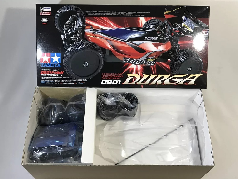 Tamiya 58395 1/10 Electric RC Car Series No.395 DB01 Durga Off-Road Description Condition: NEW High Performance Inherited from TRF501X This is an assembly kit for a race-oriented electric radio-controlled buggy that inherits the genes of the high-end 4WD racing buggy, TRF501X. It adopts a highly efficient 2-belt 4WD system, with a 4-wheel double wishbone suspension that has essentially the same geometry as the TRF501X. The use of turnbuckles on the upper arms and multiple damper pivots provide a wide range of setting options. Additionally, the compact front and rear gear cases come standard with ball differentials. The tires are high-density spike K, which provide good grip on a wide range of surfaces. DB01 Chassis with Equal-Length 2-Belt 4WD The DB01 chassis features a 2-belt 4WD system with the spur gear positioned in the center of the chassis and the front and rear drive belts of equal length, which enhances driving performance. The chassis covers the spur gear and drive belts with resin parts to protect the drivetrain from small stones and dirt commonly encountered in off-road conditions. The front and rear bulkheads are integrated with the frame parts, reducing the number of parts and improving maintainability. The bathtub frame is made of glass fiber reinforced nylon resin, allowing the RC mechanism and running battery to be mounted flat for a low center of gravity. Additionally, the underside is fully flat with countersunk screws, producing a high skid effect. Basic Specifications Length: 395mm Width: 248mm Height: 157mm Body Weight: 1075g Wheelbase: 280mm Tread: Front 214mm, Rear 210mm Tire Width/Diameter: Front 32/85mm, Rear 42/85mm Frame: Glass fiber reinforced nylon resin Drive System: Equal-length 2-belt drive 4WD Differential Gears: Ball differential front and rear Dampers: CVA oil dampers front and rear Gear Ratio: 8.13:1 (23T), 11.00:1 (17T) Speed Controller: ESC specification (sold separately) Motor: RS540 type (sold separately). When using motors 53068 Sport-Tuned Motor, 53689 540-J Motor, or 54358 Torque-Tuned Motor, only the 17T pinion can be used. Additional Items Required RC Mechanism: Expec GT-I 2.4G (Electric RC car set) or 2-channel radio with ESC Battery and Charger: Tamiya 7.2V Racing Pack or various 7.2V Advanced Packs Manufacturer: Tamiya JAN: 4950344583959 Shipping This item is set on ebay We will ship it within the corresponding period. The product will be shipped by FedEx. We strive to ship quickly. Attach the tracking number. Your order will be carefully packaged and shipped. thank you very much! International Buyers - Please Note: Import duties, taxes, and charges are not included in the item price or shipping cost. These charges are the buyer's responsibility. Please check with your country's customs office to determine what these additional costs will be prior to bidding or buying. Thank you for your understanding.