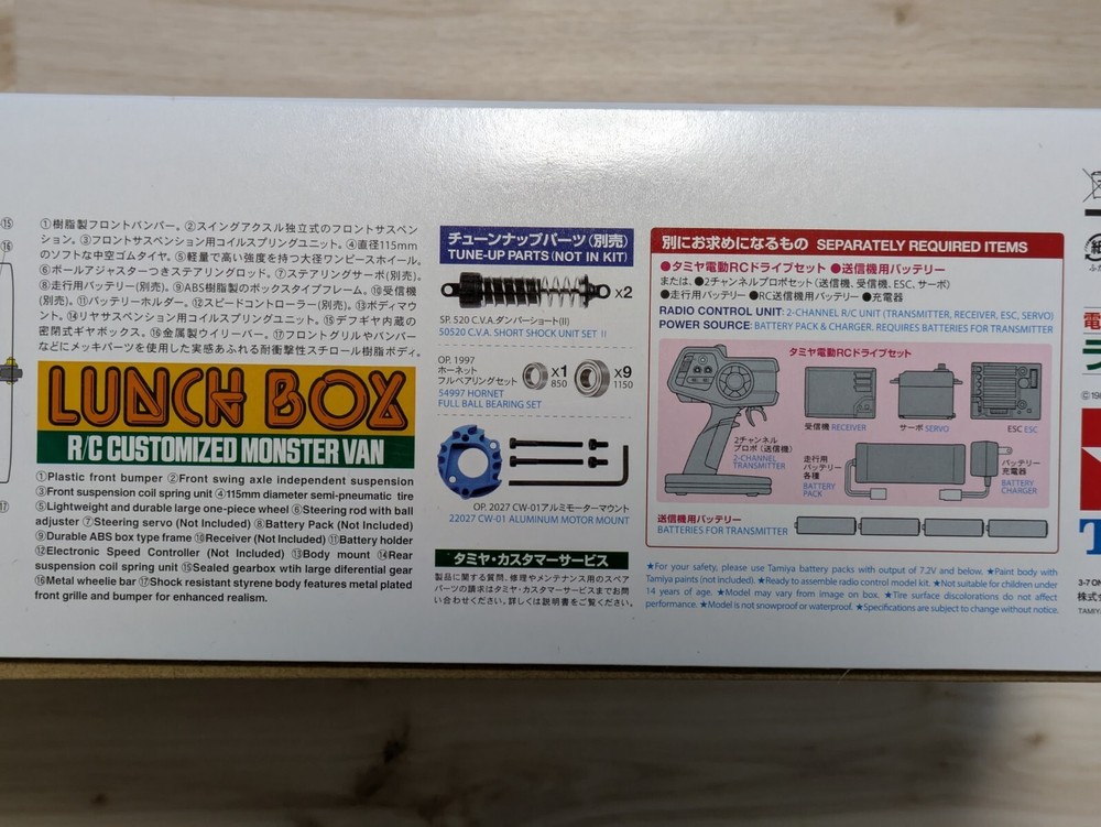 Tamiya 58347 1/12 RC Lunch Box 2005 Electric Car Kit Series No.347 Japan New Description Experience the joy of building and racing a Tamiya 1/12 scale RC Lunch Box 2005 electric car kit. This iconic model is a must-have for enthusiasts and collectors alike, offering a precise replica of the original lunch box design with impressive detail and craftsmanship. Crafted with precision in Japan, this Tamiya kit features a durable electric powertrain, ensuring a reliable and responsive driving experience. Whether you're a seasoned RC hobbyist or looking to dive into a new project, this model is an excellent addition to any collection, celebrating the legacy of Tamiya's renowned RC car series. Items to be purchased separately: ●RC mechanism: Expec GT-I, or 2-channel radio with FET amplifier ●Receiver ●Speed controller ●Steering servo ●Battery and charger: Tamiya 7.2V Racing Pack, or any 7.2V Advanced Pack Shipping We will ship by DHL or FedEx or Speed PAK Economy or Japan Post. International Buyers - Please Note: Import duties and taxes are not included in the item price or shipping cost. Please check with your country's customs office to determine these additional costs prior to bidding or buying. Additionally, if the delivery address is in a remote area, there may be additional charges by FedEx or DHL. If such charges occur, you may be asked to pay an additional $15 to $20. Thank you for your understanding.