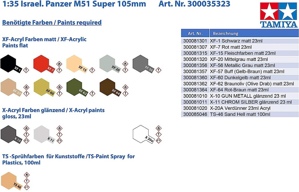 Further Details Title: Tamiya 300035323 – 1:35 Israeli Tank M51 Super, 105 mm Condition: New Release Date: 03/06/2015 Description: During the 1960's, the Israeli Ordnance Corps upgraded their M4A1 Sherman tanks by equipping them with the powerful French 105mm CN-105-F1 tank gun and they were redesignated as M51s. The larger gun meant a muzzle brake was installed to minimize the greater recoil effect and a counterweight was fitted to the rear of the turret. The 460hp diesel engine and the combination of the Horizontal Volute Spring Suspension (HVSS) and wider T80 tracks gave the M51 improved mobility. During the Six-Day War in 1967, the M51s were used against newer T-54/55 tanks as well as JS-3 tanks from Egyptian, Iraqi, and Syrian armies. The M51's 105mm gun could take on these adversaries by using HEAT ammunition. After the war, these M51s continued to serve with distinction until they were finally retired in the early 1980s. About the Model 1/35 scale plastic assembly kit of the M51. Length: 257mm, Width: 86mm. _Distinctive form of the tank is accurately reproduced based on a thorough study of an actual museum example. _The cast turret has rich finish. _Realistic HVSS suspension and T80 tracks. _Commander & loader figures, plus 3 types of marking options included. Language: English, Italian, French, German, Spanish Item Height: 102mm Item Width: 85mm Item Weight: 222g Age Level: 12 years and up Assembly Status: Yes Brand: MMD Holdings, LLC Character: Modern Color: Beige Item Length: 256mm Material: Plastic Scale: 1:35 Style: Modern Theme: Japanese Type: Tanks Dimensions: 25.68 x 8.59 x 10.26 cm; 222.26 Grams Number of Pieces: 1 MPN: TM35323 1:35 Length: 257 mm Includes 105 mm cannon Various accessories such as tools and spare canisters Includes 1 command and and 1 charging protector Missing Information? Please contact us if any details are missing and where possible we will add the information to our listing.
