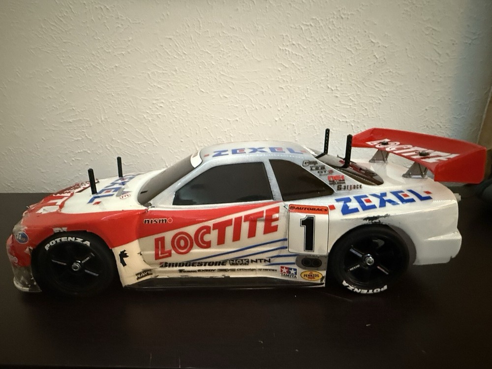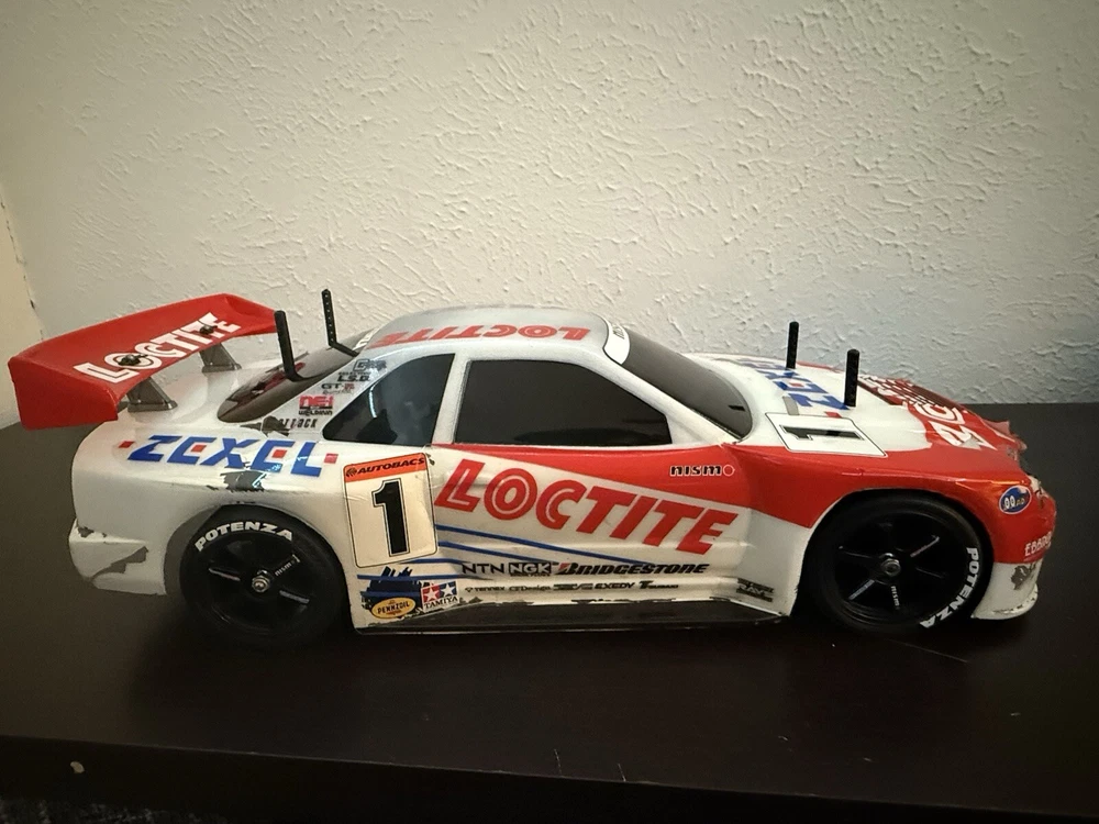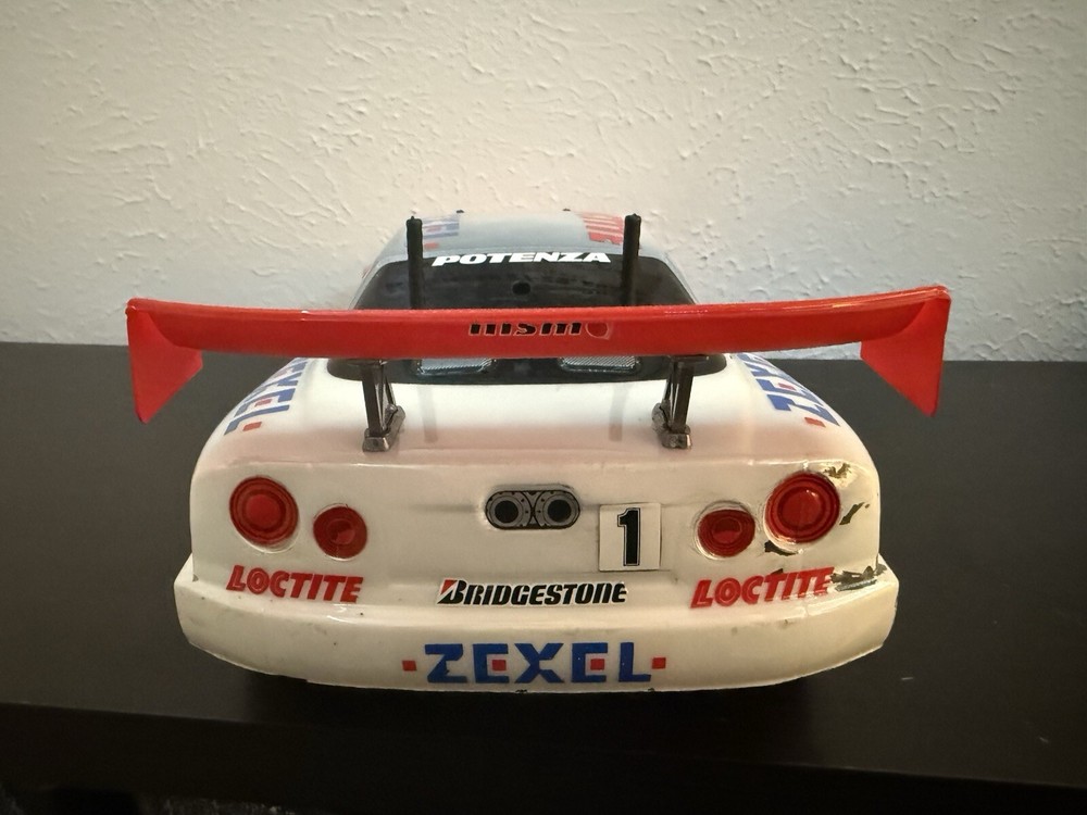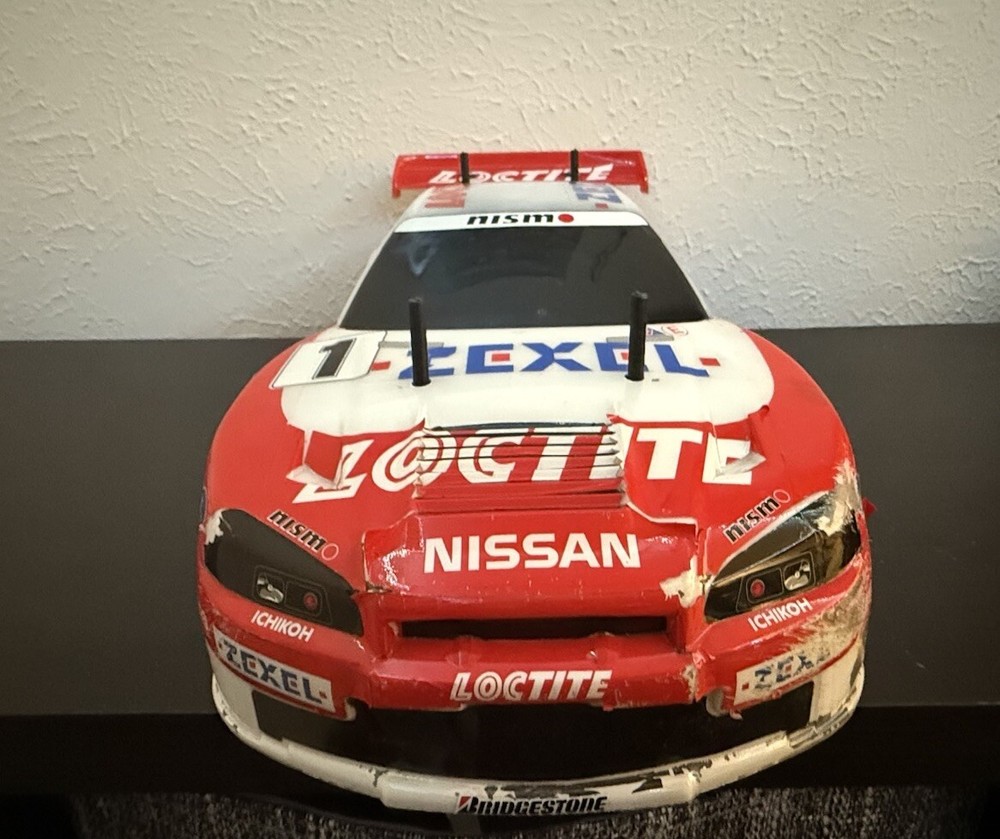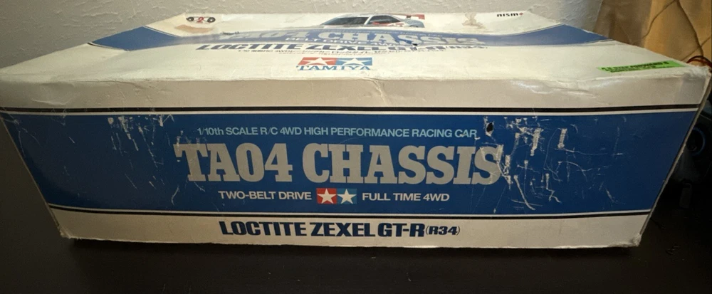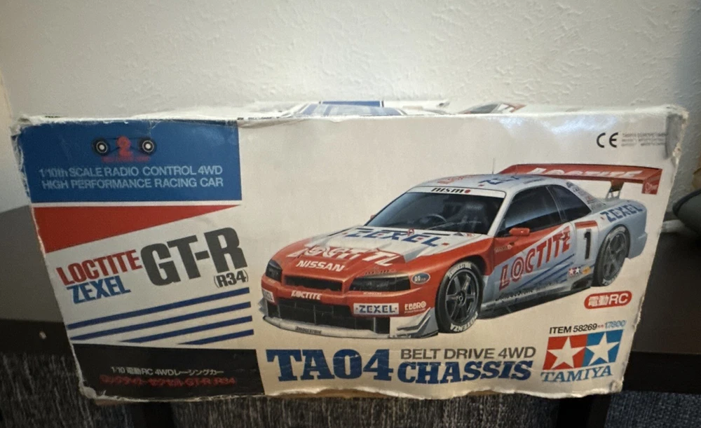 This is the Tamiya Loctite Zexel GT-R (R34) with the TA-04 Chassis. This kit requires some electronics to operate. The body is severely damaged, and some paint pieces are slowly coming off. However, the decals (some of which are also damaged) are still retained. The box is also severely damaged but can still be seen. The item is exactly shown in the images. Thank you for reading!