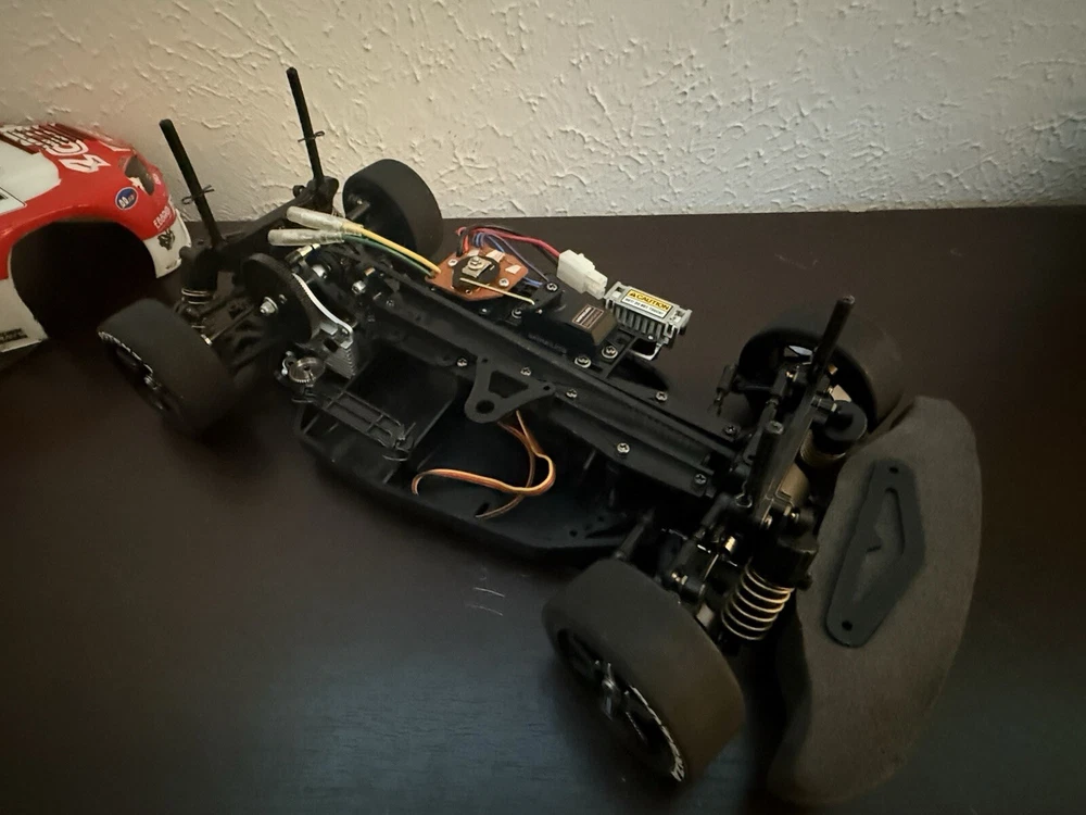This R34 GT-R kit has seen better days—body damage, peeling paint, and worn decals—but it’s a solid project for hobbyists. The TA-04 chassis with full ball bearings is a great base, and it’s exactly as pictured. Perfect for restoration or parts!