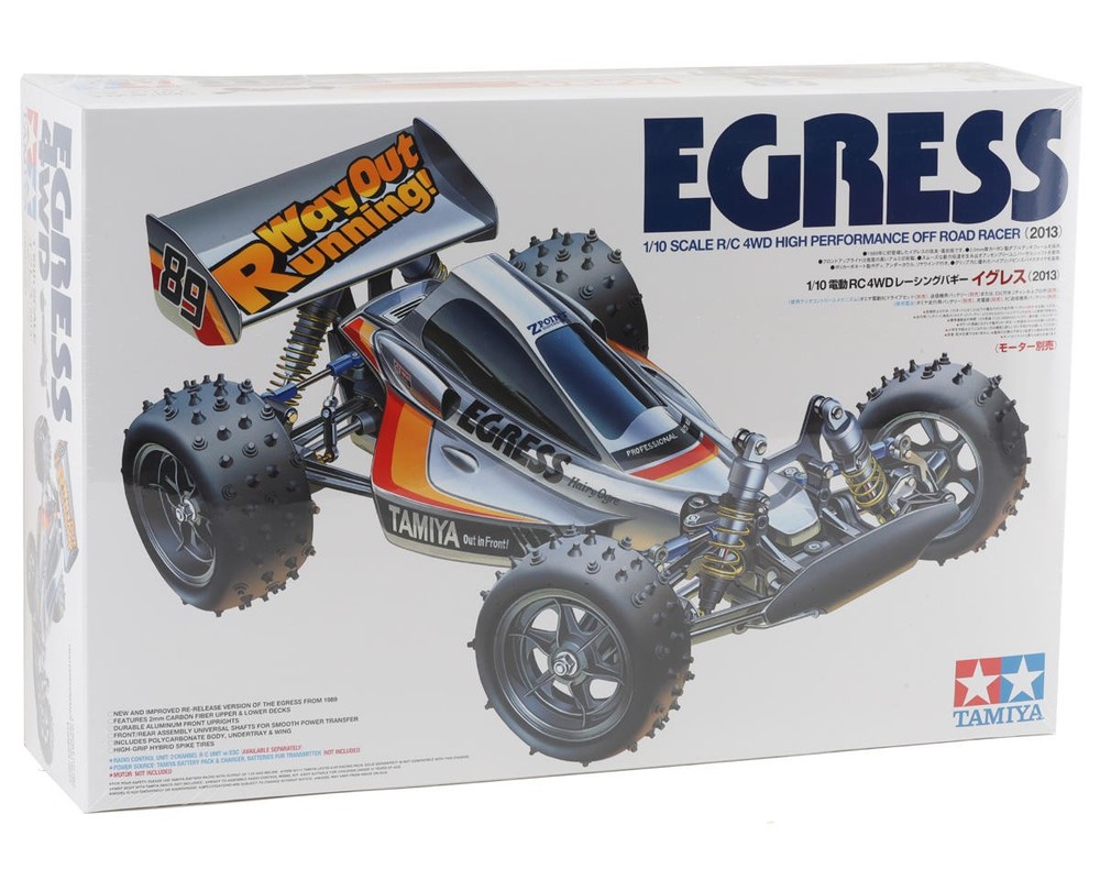 Egress 2013 4WD High Performance Buggy This is the Egress 2013 4WD 1/10 Off Road Buggy Kit from Tamiya. A re-release of the iconic Egress 4WD off-road racing buggy, first introduced in 1989, it blends the nostalgia of the original with modern advancements in battery and motor technologies, making it a thrilling option for hobbyists. About the Egress 2013 4WD Buggy 4WD System The shaft drive 4WD system employed in the Egress 2013 4WD 1/10 Off Road Buggy Kit stands as a testament to Tamiya's commitment to performance and reliability. Positioned longitudinally, the motor's power is efficiently transmitted to all four wheels through a shaft drive mechanism. This configuration not only enhances traction but also minimizes power loss, ensuring that every bit of torque from the motor is effectively utilized. With full ball bearings throughout the drivetrain, the Egress delivers smooth and consistent power delivery, vital for maintaining control on a variety of off-road terrains. Robust Drivetrain A notable feature of the Egress 2013 kit is its re-designed front and rear ball differentials, which offer exceptional reliability and ease of maintenance. These differentials play a crucial role in distributing power evenly to the wheels, allowing for predictable handling characteristics and improved cornering performance. The inclusion of a center one-way bearing further enhances the buggy's agility, providing a degree of freedom in the drivetrain that aids in maintaining cornering speed without sacrificing stability. Combined with the built-in lockable one-way bearing setup option, drivers have the flexibility to fine-tune the Egress to suit their driving style and track conditions. Suspension The Egress 2013 kit features a robust 4-wheel double wishbone suspension system, complemented by high-capacity aluminum cylinder oil dampers. This suspension setup offers exceptional damping characteristics, providing a plush and controlled ride over rough terrain. The aluminum front uprights add durability to the front suspension assembly, ensuring precise steering response and consistent performance under demanding driving conditions. With stabilizers installed at both the front and rear, the Egress exhibits minimal body roll during cornering, allowing drivers to push the buggy to its limits with confidence. Features: Shaft Drive 4WD system for efficient power transmission and enhanced traction Longitudinally positioned motor for optimal weight distribution and stability Full ball bearings throughout the drivetrain for smooth and consistent power delivery Re-designed front and rear ball differentials for exceptional reliability and easy maintenance Built-in center one-way bearing and lockable setup option for improved agility and cornering speed 4-wheel double wishbone suspension system with high-capacity aluminum cylinder oil dampers for plush and controlled ride Aluminum front uprights for added durability and precise steering response Stabilizers at the front and rear for minimized body roll and enhanced cornering performance Includes: (1) Egress 2013 4WD 1/10 Off Road Buggy Kit (1) Manual Needed To Complete: (1) ESC and Motor (1) 2-channel Transmitter/Radio (1) Low Profile Steering Servo (1) 2S (7.2V-7.4V) Battery (1) Compatible charger Polycarbonate paint for body Specifications: Scale 1/10 Length 16.93" (430mm) Width 9.57" (243mm) Height 6.18" (157mm) Wheelbase 10.83" (275mm) Drive 4WD Input Voltage 7.2-7.4V Assembly Level Kit* *NOTE: RC Kits are an unassembled Remote Control Model that require assembly, racer selected electronics, and other racer provided items. Photos of assembled kit are for illustrative purposes only. For a complete list of needed items to drive this kit please see the list above. Manuals: User Manual About Us | View Store