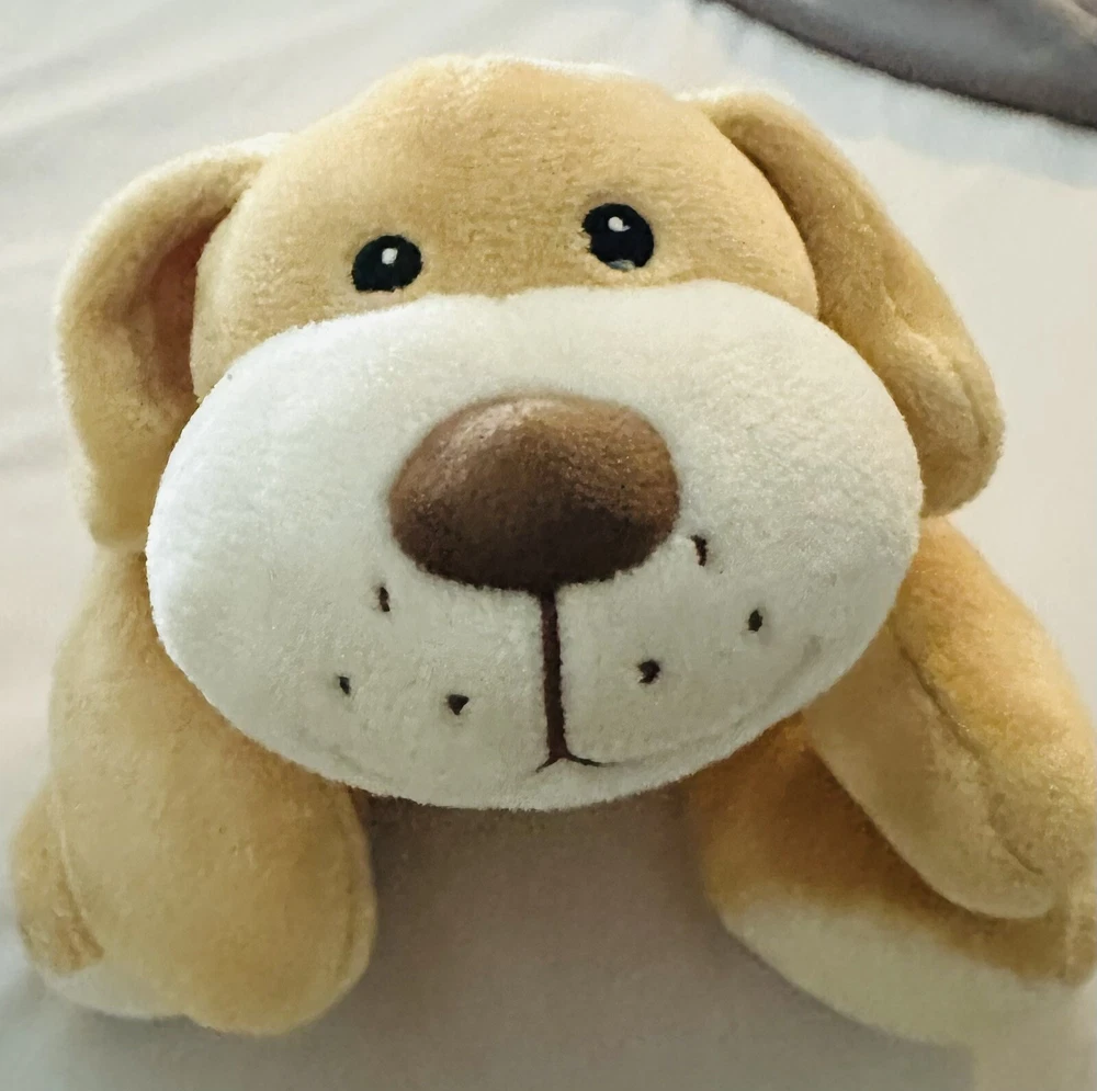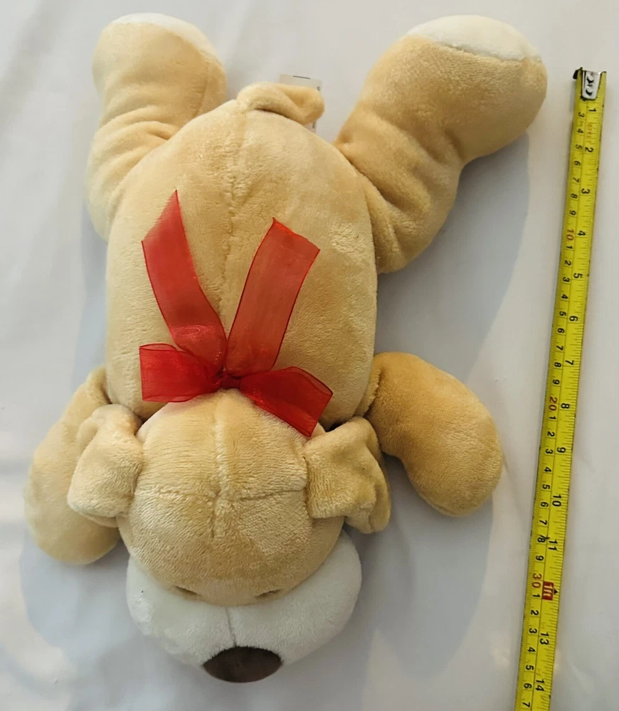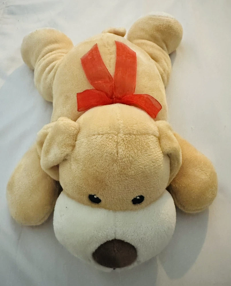 Tan 16” Puppy Dog Plush Brown Nose Soft Floppy Toy Red Ribbon Bow. Condition is New. Shipped with USPS Ground Advantage.