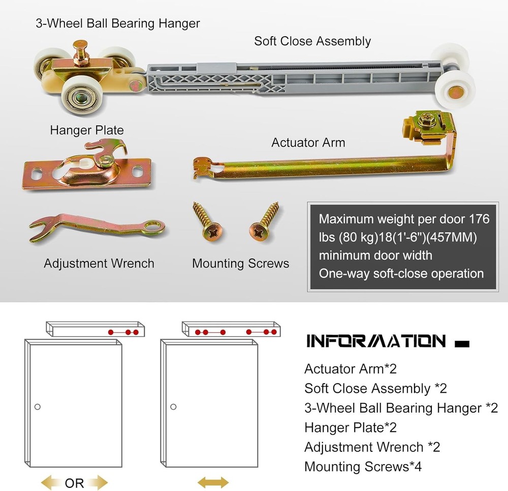 Tandefio 2 Set Sliding Pocket Door Soft Close Hanger Heavy Duty Multicolor Product Details Brand: Tandefio Color: Multicolor Material: Plastic, Iron, Metal Style: Modern Item Weight: 0.62 Kilograms Assembly Required: Yes Manufacturer: Tandefio Part Number: CLO-Tandefio-372 Item Weight: 1.37 pounds Package Dimensions: 11.85 x 4.69 x 2.76 inches Item model number: CLO-Tandefio-372 Item Package Quantity: 2 Batteries Required?: No Brand: Tandefio Color: Multicolor Material: Plastic, Iron, Metal Style: Modern Item Weight: 0.62 Kilograms Complete Set: Includes 2 soft close assemblies, 2 actuator arms, 2 hanger plates, 2 adjustment wrenches and 2 screw pack.enough to meet your use needs, to replace your old or broken one Single Bi-Direction: For single direction soft door operation, the 1060 must be used in combination with a 1125 door hanger.For bi-direction soft door operation, 2 pack of 1060 are required. adapt:For pocket door (1500/1560/1562/100 Series) soft close, the 1060 reqiures a min. 24" door width for single direction or 28" for bi-direction.For bypass door (134/138/2610F/100 Series) soft close, the 1060 reqiures a min. 18" door width for single direction or 24" for bi-direction. Good Compatibility : our sliding door hardware and track kit is compatible with a wide array of rail series and pocket door frames, compatible with 100, 134F, 138F, 2610F Series Track and compatible with 100PD,1500, 1560, 1562, 2710 Series pocket door frames; The top door hanger comes with a soft shut assembly capable of supporting a maximum door weight of 180 lbs Features: The sliding door hardware is designed to prevent damage caused by violent closure of doors. A good addition to your quiet and serene space. You can share the sliding door hardware and track kit with your father, neighbors, relatives and other friends who are need to replace, to shock them with such a practical gift. Specifications: Material: iron, metal, plastic Color: multicolor Weight: maximum about 180 lbs Installation type: screw in Package includes: 2 Sets of sliding pocket door soft shut hangers Notes: Manual measurement, please allow slight errors on size. The color may exist a slight difference due to different screen displays. Small parts included, please keep them away from little kids to avoid swallowing risk.