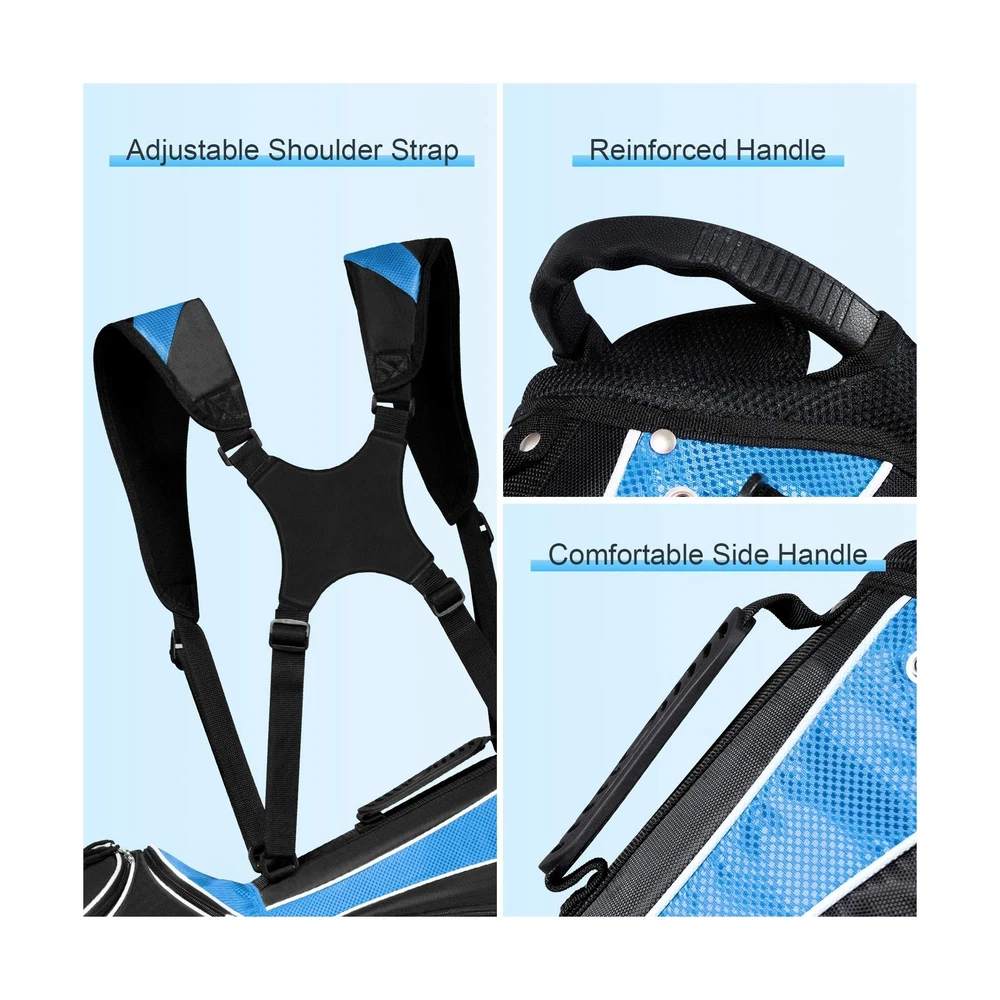 Tangkula Golf Stand Bag with 6 Way Top Dividers, Lightweight Golf Bag with Adjustable Dual Strap & 8 Pockets, Waterproof Rain Hood, Portable for Men Women Description Features: Water Resistance: Made of sturdy material, our golf bag is water resistance to avoid any liquid to permeate. And its sturdiness can well up to the additional wear and tear while using it. It surely guarantees you a durable lifetime for its sturdy construction. Reasonable Capacity: Featuring light weight of only 6 lbs and portability, golf bags 6 way dividers surprisingly offers you enough space to accommodate your golf clubs. There are 8 pockets on this bag to bring you additional storage space, which you can put various accessories in. Considerate Added Values: Backpack-style shoulder strap for extra comfort provides you a convenient handle on the side to quickly carry and go. And the special zipper design adds both practicability and aesthetics to this product. Specially designed umbrella holder offers you a good assistance. Premium Travel Helper: golf travel bag is quite great for traveling for it takes up very little space in a trailer, camper, or car trunk due to its compact body. You can just take it to your desired place effortlessly. And the bag can be stored neatly when you do not use it. Foot Support: With a mixed color and durable automatic stand with anti-slip foot, it can stand steadily and balanced as you want to release your hands. And it can also stand straight with a plastic chassis. A rubber foot pipe bracket can well prevent the scratch. Product Details: Brand: Tangkula Color: Blue Material: Polyester Strap Type: Adjustable Product Dimensions: 11"L x 8"W x 32.5"H Number of Dividers: 6 Item Weight: 6 Pounds Number Of Pockets: 8 Manufacturer: Tangkula Golf Club Bag Type: Stand Golf Bag Brand: Tangkula Color: Blue Material: Polyester Strap Type: Adjustable Product Dimensions: 11"L x 8"W x 32.5"H Number of Dividers: 6 Item Weight: 6 Pounds Number Of Pockets: 8 Manufacturer: Tangkula Golf Club Bag Type: Stand Golf Bag Item Package Dimensions L x W x H: 35.25 x 13.25 x 10 inches Package Weight: 3.38 Kilograms Item Dimensions LxWxH: 11 x 8 x 32.5 inches Brand Name: Tangkula Warranty Description: / Model Name: AM0047SP Suggested Users: unisex-adult Part Number: AM0047SP Included Components: 1 x Golf Stand Ba,g 1 x Rain Hood Date First Available: October 14, 2016 Delivery We Do Not Ship Outside of the Continental US. Return Policy All items qualify for returns within 30 days of receipt. Buyer is responsible for return shipping on any item that is not damaged. Feedback We take our reputation seriously, we buy and sell online, so we understand the value of trust. If you are unsatisfied with your order, please contact us and we will work with you to resolve it to your satisfaction.
