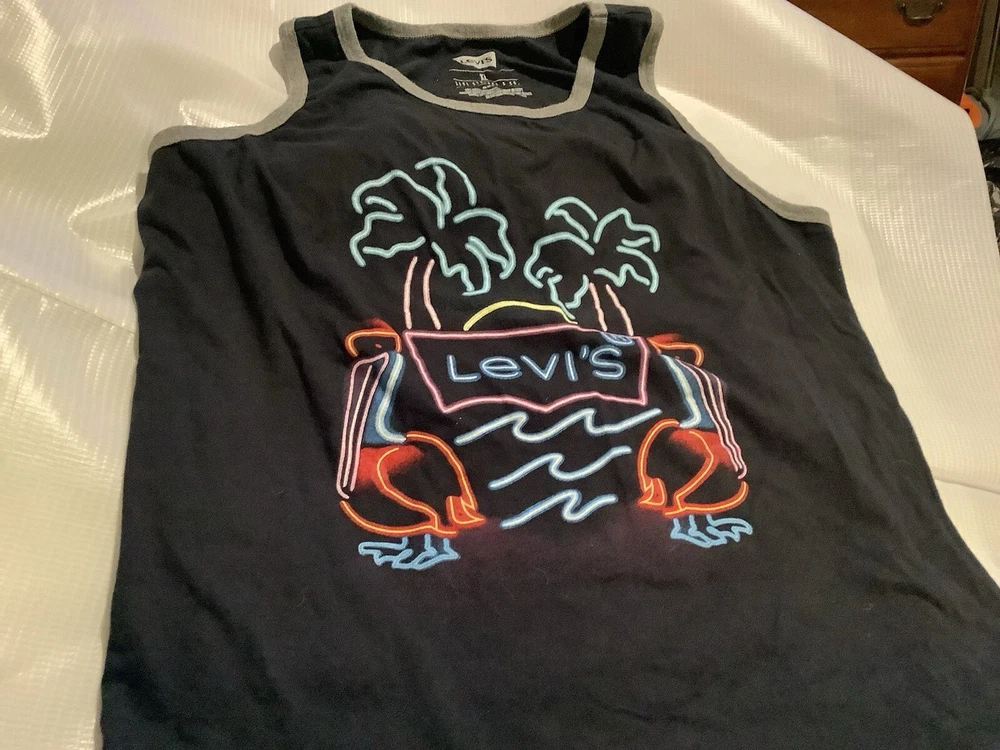This Levi's tank top for men features a fun graphic print of flamingos and palm trees, perfect for a day at the beach. The shirt is made from a comfortable cotton blend material that is lightweight and breathable, making it easy to care for. Its regular fit and sleeveless design make it a great choice for casual wear, while the collarless crew neck adds a touch of style. The black color of the shirt complements the graphic print, and its XL size is perfect for those who want a comfortable fit. This vintage-style t-shirt is perfect for those who love beach-themed clothing, and its easy-care features make it a great addition to any wardrobe.