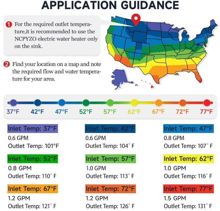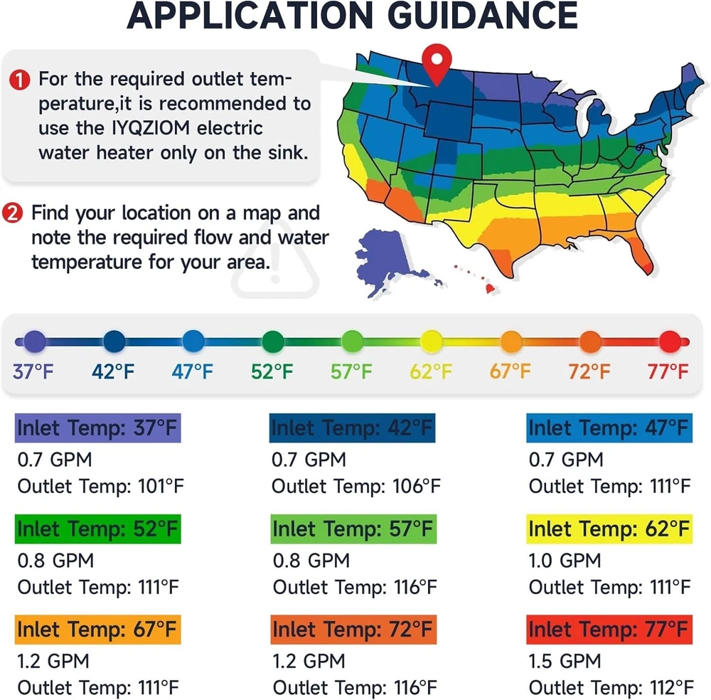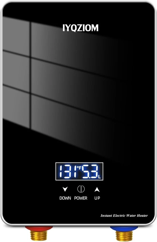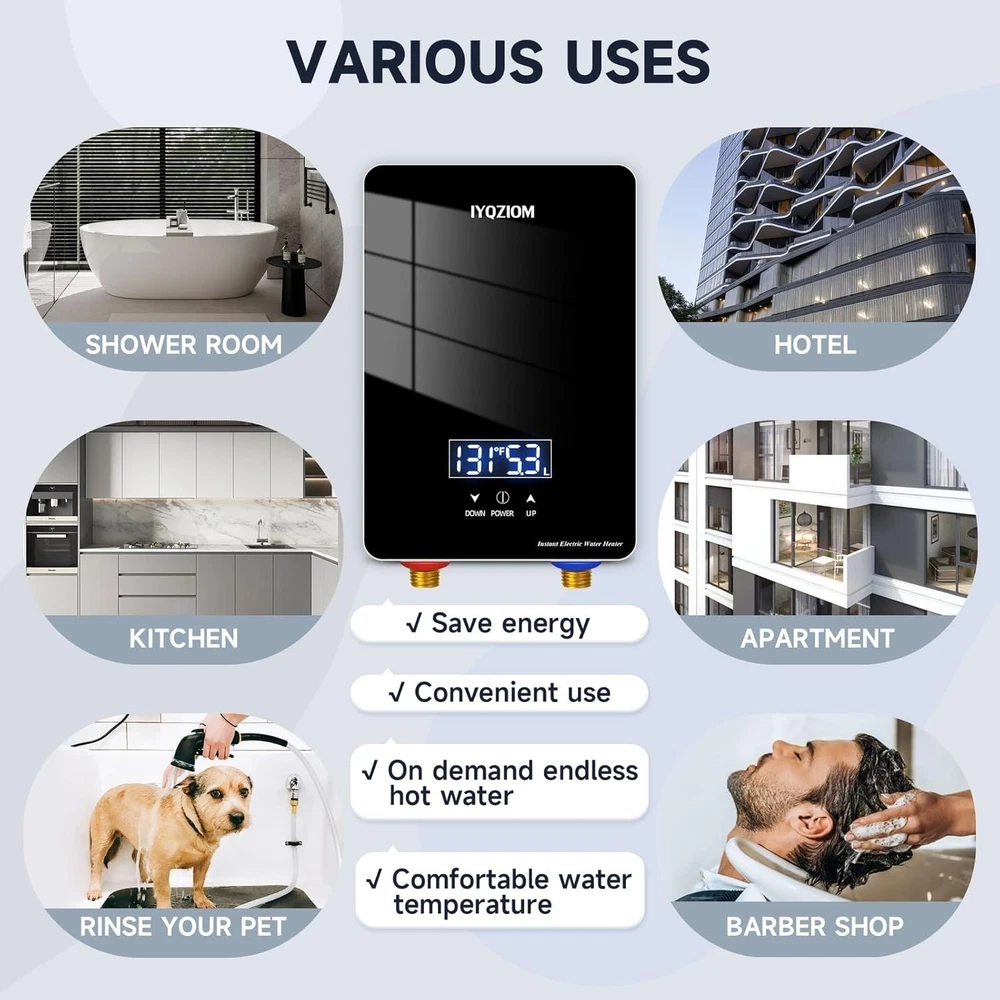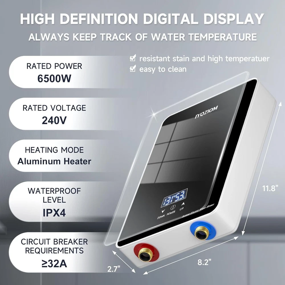 About This Item: Tankless Electric Water Heater – Instant, Adjustable, & Energy-Efficient Hot Water Instant & Continuous Hot Water This tankless electric water heater delivers instant, endless hot water with adjustable temperatures from 86℉ to 131℉. No waiting for preheating and no temperature fluctuations. Built with high-quality materials and durable construction, it ensures a reliable hot water supply for years in kitchens, bathrooms, or under sinks. Smart Self-Modulating Technology Equipped with frequency conversion technology, this water heater automatically adjusts power input based on water flow and temperature settings. Reduced flow triggers minimal energy consumption, saving both time and electricity. The intuitive control panel makes temperature adjustments simple and user-friendly for all ages. Safe & Reliable Operation Designed with multiple safety features for peace of mind: IPX4 waterproof rating Leakage protection and dry-burning prevention Automatic power-off in over-temperature or inactive states Memory function prevents repeated operations Electric leakage proof valve provides double protection Built to withstand 480V insulation testing , ensuring maximum reliability Easy Installation & Wide Application Includes pre-drilled mounting holes, fixed bracket, English manual, and 1/2-inch NPT interface for quick installation. Compact and versatile, perfect for: Kitchens and under-sink applications Bathrooms, showers, and washrooms Cleaning dishes, food, clothes, face, and hands Specifications & Important Notes Power: 6500W Voltage: 220–240V Dimensions: 12"H × 3"D × 8"W Recommended wiring: ≥ 2.5mm² cross-section, connected to a 32A or higher trip switch
