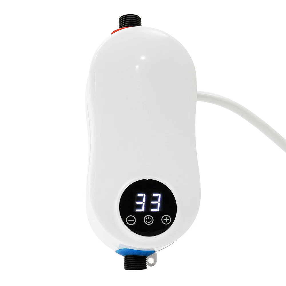 Application It is suitable for kitchens, cupboards, bathrooms, daily washing, RVs, bars, schools, hospitals, communities, hair salons, and so on to wash hands, dishes, clothes, and face. You can also take a shower above 0.04MPa water pressure. Package Included 1* Instant Water Heater 1* Hand Spray 1* Shower Hose 1* Water Inlet Hose 1* Flow Regulating Valve 1* Hand Spray Holder 1* English Instruction Other Accessories for Assembly Tankless Water Heater,110V 3500W Mini Electric Tankless Instant Hot Water Heater Without shower, hose, bracket. Description Our water heater uses a stainless steel heating core with 3500w large power, providing you with instant hot water and allowing for a comfortable washing/shower experience. In addition, it adopts multiple protection designs such as leakage protection, dry-heating protection, and grounding protection, ensuring high safety of water use. The mini body and modern appearance make it a great companion for a sink, faucet, or bathroom. Specifications Color: White Material: ABS, Stainless Steel Shape: Gourd-shaped Style: Mini, Instant Mounting Type: Wall-mounted, Vertical Usage: Indoor Use Features: With Leakage Protection Water Inlet Mode: Lower Water Inlet Heating Method: Instant, Stainless Steel Heating Tube Power Source: Corded Electric Voltage: 110V Frequency: 50Hz Power: 3500W Rated Pressure: 0MPa Operating Pressure: 0.04-0.4MPa Anti-Electric Shock Type: I Waterproof Grade: IPX4 Wire Requirements: >2.5m² Circuit Breaker Switch: >16A Heating Time: 3s Interface: 1/2"NPT Heating Temperature: 20-55℃/68-131℉ Power Cord Length: 0.9m/2.95ft Water Inlet Hose Length: 50cm/19.68inch Water Heater Size: 19*7.5*7.5 cm/7.48*2.95*2.95 inch Package Size: 27*28*12cm/10.6*11.02*4.7inch Net Weight: 1.35kg/2.97 lbs Gross Weight: 1.4kg/3.08 lbs Features Premium Material: The instant water heater uses stainless steel and high-quality ABS materials, making it sturdy, wear-resistant, anti-rust, and long-lasting. A Safe Heater: The various protections such as leakage protection, dry-heating protection, anti-electric wall technology, water-electricity isolation, overvoltage protection, thermostatic anti-scalding protection, over-temperature protection, grounding protection, and IPX4 waterproof rate make it safe to use without any worries. Instant Heating: Using a stainless steel heating tube with 3500w high power, this water heater can deliver warm hot water in about 3 seconds without storing water for preheating, which saves time/energy and prevents sediment/scale accumulation. Temperature Controllable: You can control the water temperature (68-131℉) by adjusting the water flow (large/small water flow--low/high temperature) and pressing the+/- keys on the panel, providing hot water that fits four seasons in a year. LED Display: The digital screen displays the water temperature and power, so you can keep track of them and get the desired temperature easier. Anti-scaling Design: It can filter the sediment, rust, and other large particles in the tap water, restore the tap water to the factory state, reduce energy consumption, and avoid damage to the human body and skin. Low Water Pressure Startup: The advanced temperature sensing technology overcomes the difficulty of using water heaters due to low water pressure, making it suitable for residential buildings with water pressure up to 0.04MPa. Cost-effective: The tankless water heater with 98% thermal efficiency can automatically regulate the power according to the water flow and temperature change, saving energy up to 50%. Only when it is used the water can be heated to the required place, eliminating the waste of unused water in the long water pipeline between the central water heater and each faucet. Mini Appearance: This mini wall-mounted white instant water heater with a unique gourd-shaped design and 4.6*2.8*6.3 inches size plays a decorative role and does not occupy much space. Simple Installation: With the equipped accessories, premade fixing screw holes, English manual, and 1/2" standard interfaces, you can install this heater easily. Details Power Cable: The 2.95ft power cable allows for easy installation in your cupboard or under the sink. Touch Button: The new-generation touch button with electronic control has a longer lifespan and good sealing. It resists wet and water and avoids mechanical failure of buttons. Application It is suitable for kitchens, cupboards, bathrooms, daily washing, RVs, bars, schools, hospitals, communities, hair salons, and so on to wash hands, dishes, clothes, and face. You can also take a shower above 0.04MPa water pressure. Package Included 1* Instant Water Heater 1* Water Inlet Hose 1* Flow Regulating Valve 1* English Instruction Other Accessories for Assembly How to Install Fix it through the premade screw holes at the proper position on the wall. Install the water flow regulating valve at the blue electric water inlet under the water heater. Install an electric partition wall at the red water outlet above the water heater. Connect the water inlet hose to the water flow regulating valve. Connect the water inlet. Turn on the water flow regulating valve to ensure that this product does not leak. Plug in the power. Long press the power button for 3 seconds to turn it on. Notes Please verify this unit is the right size for you before buying. The wire is required to be more than 2.5m² and the circuit breaker switch is greater than 16 A. The start-up water pressure of this machine is about 0.04Mpa. If the water flow is significantly too low, it is not recommended to buy, except for users who have added a water booster device. The water temperature will be affected by the inlet water temperature, the water pressure, and the voltage level. When the temperature and inlet water temperature is too low in winter, you can turn down the faucet or the water pressure switch that comes with the machine to achieve the adjusted temperature. Users with high requirements for water temperature, 