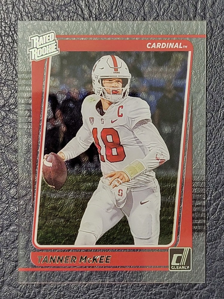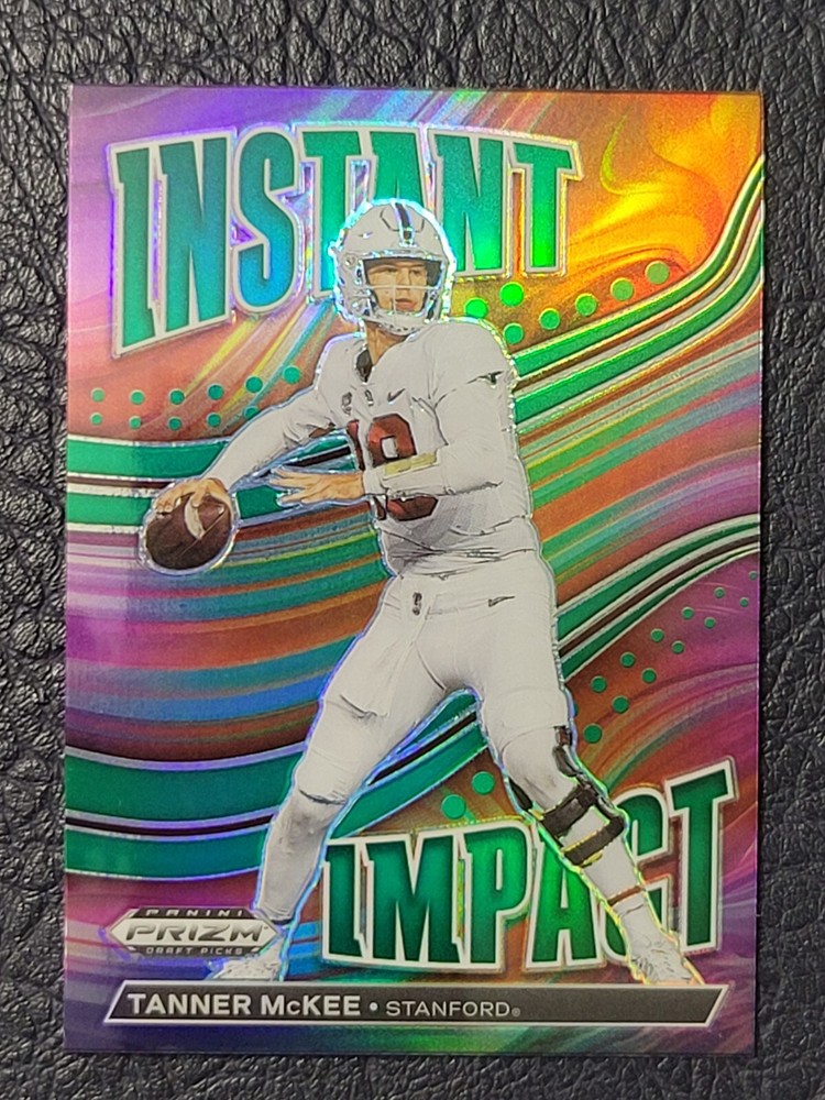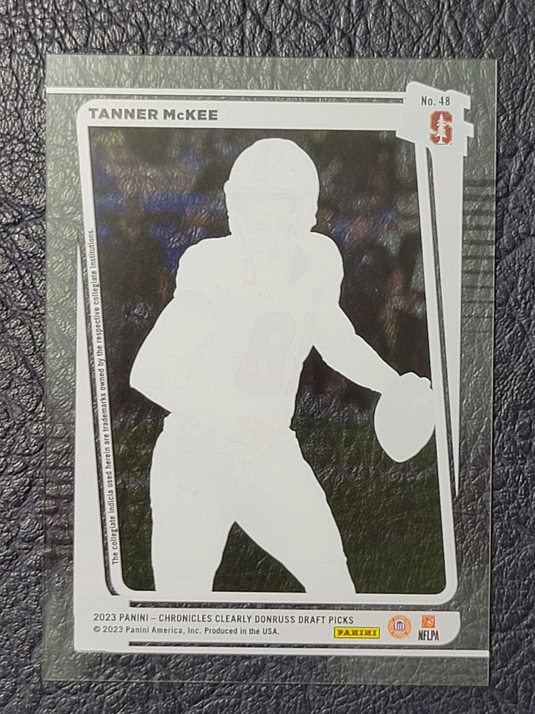This is a rare and highly sought-after Tanner McKee 2023 Prizm Draft Picks Instant Impact Green & Chronicles Clearly card pair (2). It features a parallel and insert design, with a rookie status, and is made of high-quality card stock material. The cards are from the 2023 Panini Chronicles Clearly Donruss Draft Picks and 2023 Panini Prizm Draft Picks sets, making it a must-have for any serious collector. This card duo has a Standard size and is in English language. It showcases Tanner McKee, a player from the Stanford Cardinal and Philadelphia Eagles teams, who participated in the Super Bowl event/tournament. The card is manufactured by Panini in the United States and is a great addition to any sports trading card collection.