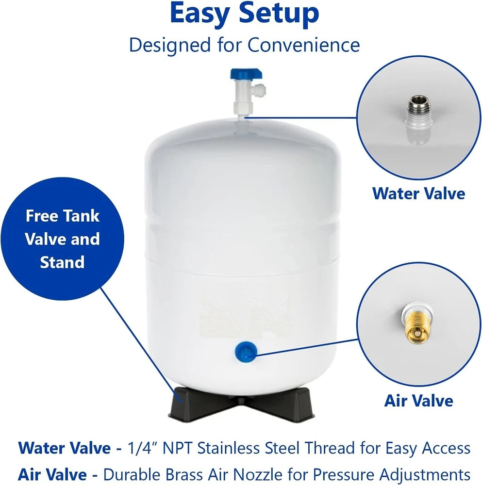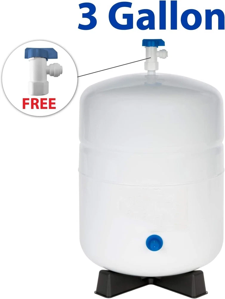 Tanque de expansión del sistema de filtración de agua: tanque de 3 galones NUEVO Tanque de ósmosis inversa: fabricado con materiales 100 % aptos para uso alimentario, el tanque de agua almacena y mantiene el agua libre de impurezas y productos químicos agresivos. El complemento perfecto para cualquier sistema de agua de ósmosis inversa. Tanque de agua fácil de instalar: los reemplazos del tanque incluyen una válvula de bola de tanque gratuita para una fácil instalación y reemplazo con un diseño de conexión rápida de 1⁄4”. Tanque de agua de alta calidad: este tanque de almacenamiento de agua está fabricado con domos de acero embutido duraderos con soldadura de precisión para garantizar un valor duradero. Dimensiones del tanque de agua: este tanque de agua compacto está diseñado (14 x 9 x 9) para caber debajo de la mayoría de los fregaderos de cocina. Almacena hasta 2,2 galones de agua para agua potable filtrada a pedido.