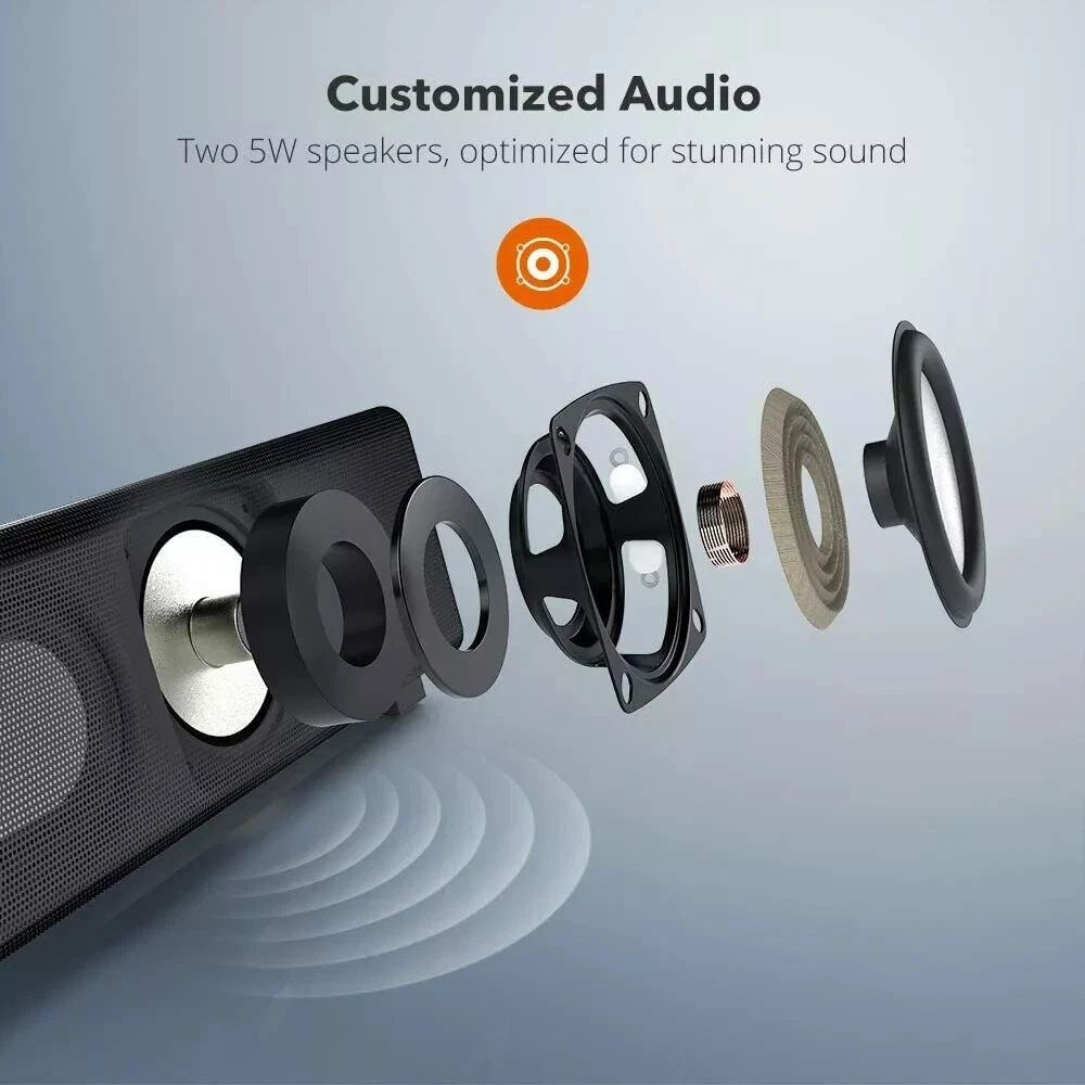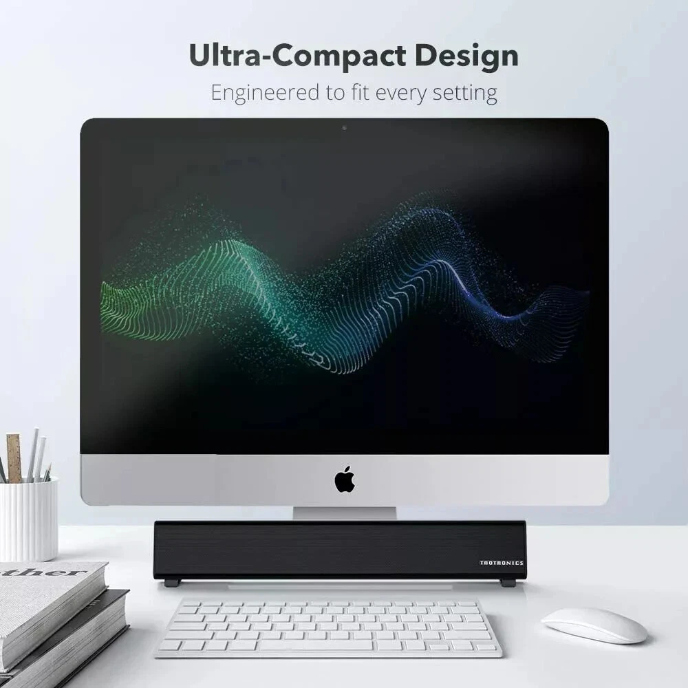TaoTronics Bluetooth 5.0 Computer Speaker Wired/Wireless Mini Sound Bar SK025 Stream wirelessly: connect via Bluetooth 5.0 or plug in physical AUX and RCA cable connections, choose your most convenient Immersive sound experience: housing Two 5W full range speakers, The sound bar delivers a crisp, mesmerizing sound Easy set up in minutes: The package contains all equipment needed - Unpack, plug in, and enjoy Widely compatible: The computer sound bar also connects with your phone, tablet, MP3 player, or any other device with Bluetooth, RCA, or audio connectivity Fits your desk perfectly: The ultra-slim sound bar is tailored to save precious space and avoid cluttering -----