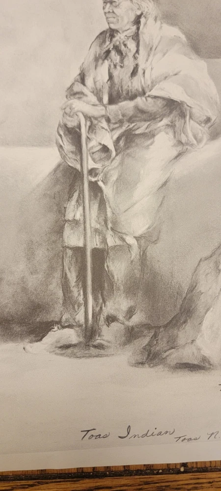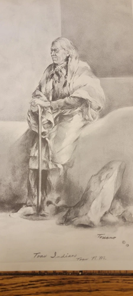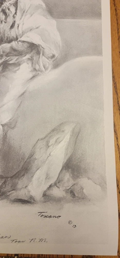 This beautiful print by Dee Toscano depicts a Taos Indian Native American deep in thought. Created in 1973, this charcoal sketch on paper measures 12 inches in height and 18 inches in length. The print is unframed and is a reprint of the original. The piece showcases traditional Taos culture and the beauty of the American Indian. It is a great addition to any art collection and is perfect for those who appreciate contemporary art produced in the 1970s. This print is a medium-sized piece. It is printed on high-quality paper and is a great representation of the Taos people. See pictures for details