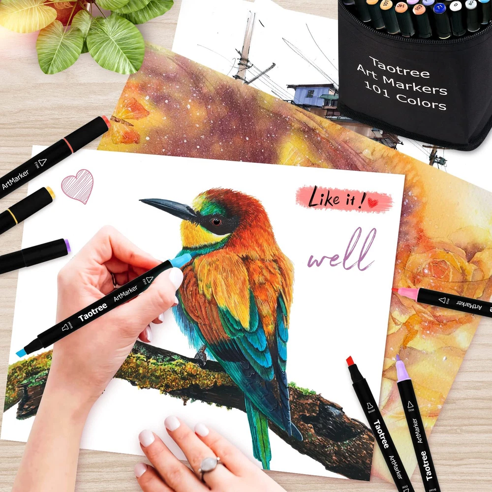 Taotree 101 Colors Alcohol Based Markers, Dual Tips Permanent Art Markers Highlighter Pen Sketch Markers for Kids Adult Coloring Drawing Sketching Illustration and Card Making Fine & Chisel Double Tip Alcohol Art Markers. Each Fine & Chisel tip Alcohol markers has a double-ended design, providing great versatility. You can choose the brush tip for sweeping, details, calligraphic strokes or the broad chisel tip for quickly color in large areas. including all the primary colors you might need for your art creation, and it can be blended nicely for added dimension to your artwork. 100 MULTIPLE Colors + 1 Free Colorless Blender. Valued artist markers set for adults, kids coloring books , artist sketching, illustration, drawing, calligraphy lettering beginners, underlining, card making, architectural design, advertising rendering, landscape, and other forms of comic design etc. Great as art markers, sketch markers, drawing markers, permanent markers, paint markers, brush markers pens, alcohol based markers, alcohol markers brush tip, alcohol brush markers. ALCOHOL-BASED INK: Never let wet ink ruin your work again! Draw smudge-free thanks to its fast-drying, alcohol-based formula. The markers feature a 4mm broad chisel tip for quick coverage and a 1mm fine bullet tip for detailed lines highlight. It's great for coloring, drawing, sketching, illustrating, shading, designing, rendering, comics, adult coloring books and more. EASY TO USE, NO SMUDGING: Each Marker Cap is marked with color code at both ends makes it easier to choose right color. Small Round barrel design makes it comfortable to hold by kids as well as adults. Forget about blotchy, uneven coloring. High-quality ink blends seamlessly to achieve beautiful coloring effects, even for beginners. Plus, your artwork will never fade or smudge with time Good Markers: Don't waste time looking for the right color. Color-coded caps keep tips from drying out and help you find any marker in a flash. Equipped with a beautiful form-fitting black carrying case for traveling and storing! Great gift for Christmas, Thanksgiving, art teachers, school students, families, friends, women, kids, girls. Feel totally free to contact us for a replacement if the original item has any defect.