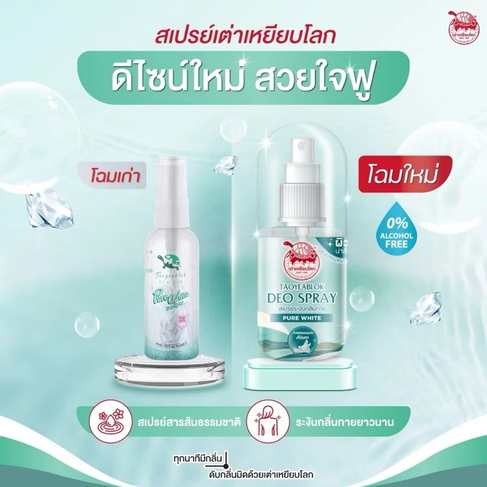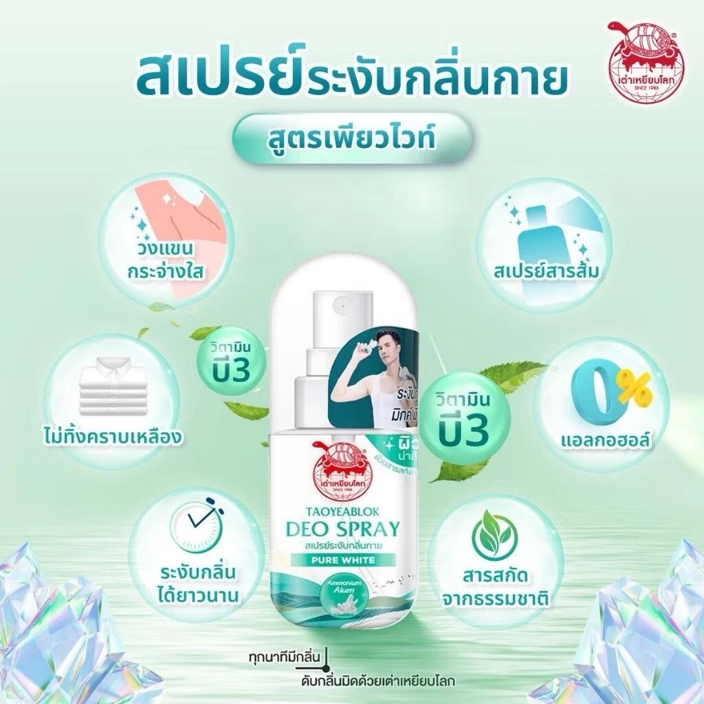 Taoyeablok Pure White Deo Spray 50 ml. Taoyeablok Pure White Deo Spray • Brightening formula, gentle to the touch • Mixed with vitamin B3, gentle on the skin • Made from natural ingredients • No stains on clothes • Skin looks bright and clear • Long-lasting deodorant • Not sticky • 100% alcohol-free Ingredients: 100% alum, vitamin B3 How to eat/use: Spray lightly on the armpits after showering Contraindications/Warnings: If irritation occurs, stop using and consult a doctor. License number Registration number 10-1-6500042280