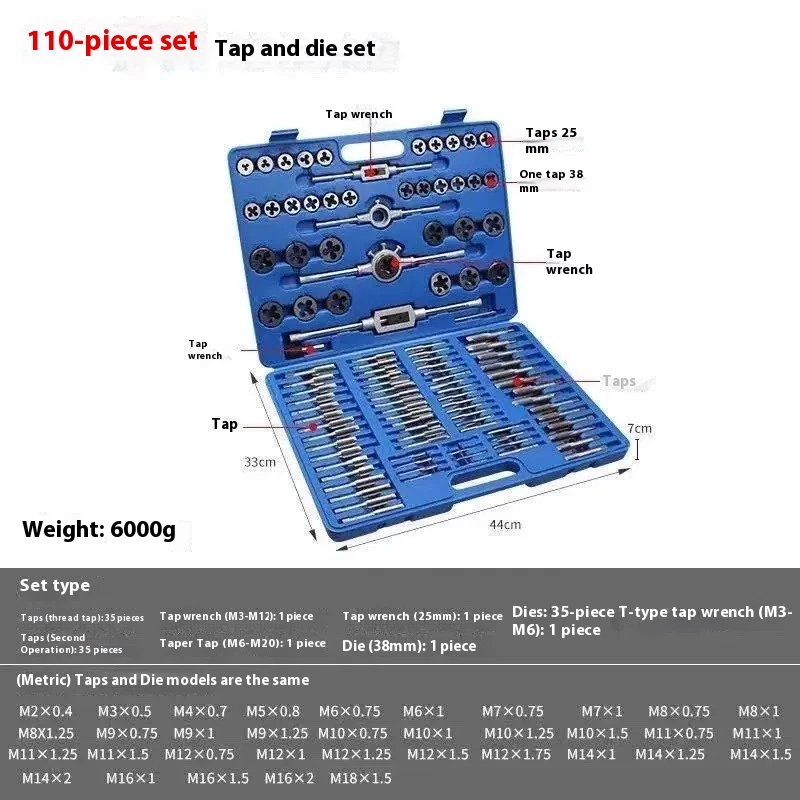 Tap and Die Set 110pcs M2-M18 Screw Thread Metric Tap Die Se ts of Hand Too weights:6kg