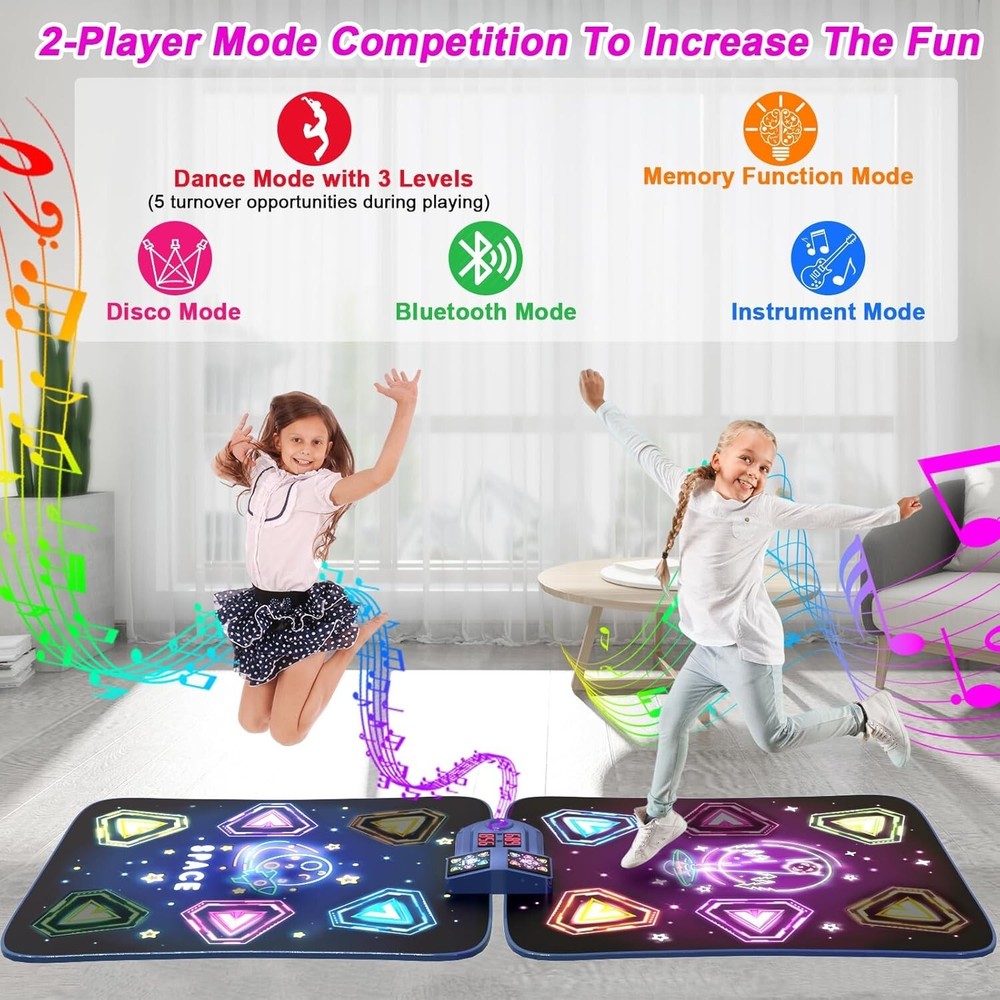 Tapete de baile para 2 jugadores con 12 botones iluminados y 5 modos de juego US Modos Individual y Doble: Esta alfombra de baile iluminada para dos jugadores, con modos individual y doble (cambio fácil entre izquierda y derecha), es equivalente a dos juguetes musicales. Los niños no solo pueden bailar, sino también experimentar tocando instrumentos musicales con amigos, lo que fomenta el desarrollo de su talento musical y estimula su creatividad. Interacción y Ejercicio: La alfombra de baile para niños combina diversión y ejercicio, ofreciendo una excelente manera para que los niños mejoren su equilibrio, coordinación ojo-mano y sentido del ritmo, mejorando su inmunidad. Los padres también pueden participar. Jugar promueve la interacción y la cooperación entre padres e hijos, y entre niños. 5 Juegos Opcionales: La alfombra de baile para dos jugadores cuenta con 5 modos de juego: el modo Baile tiene 3 niveles de dificultad (del 1 al 9); el modo Memoria para memorizar y coordinar; el modo Bluetooth para bailar con tu música favorita; el modo Instrumento para simular sonidos de piano y batería. Modo discoteca con ritmos musicales y luces, que ofrecen diversión sin fin para niñas y niños de 3, 4, 5, 6, 7, 8, 9 y 10 años. Material seguro y portátil: Fabricada en vinilo resistente, es fácil de limpiar y lo suficientemente resistente para bailar y saltar. Su base antideslizante garantiza la seguridad de los niños mayores de 3 años. La alfombra de baile es pequeña y plegable, fácil de transportar y cabe perfectamente en un bolso de mano. Los niños pueden llevarla a cualquier lugar y disfrutar de la diversión tanto en interiores como en exteriores. Gran regalo para niños de 3 a 12 años: Si buscas un regalo creativo para tus niñas o niños, ¡recomienda esta alfombra de baile! Ya sea para Navidad, el Día del Niño o un cumpleaños, este es el regalo ideal para niñas de 3, 4, 5, 6, 7, 8, 9 y 10 años o más. ¡Los regalos emocionantes traen alegría emocionante!