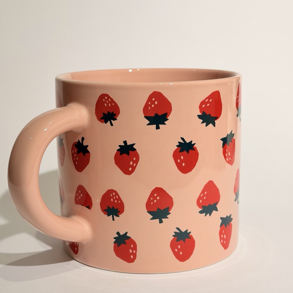 The Target Room Essentials Strawberry Coffee Mug is a charming round mug in a vibrant pink color, perfect for all occasions. It can be used for both hot and cold beverages, making it versatile for any drink preference. This original coffee mug features a painted design with the Target brand logo, standing at 4 inches tall. Made of normal glass and manufactured in China, this unique mug is a stylish and practical addition to any kitchen or home collection.