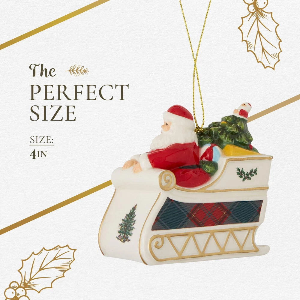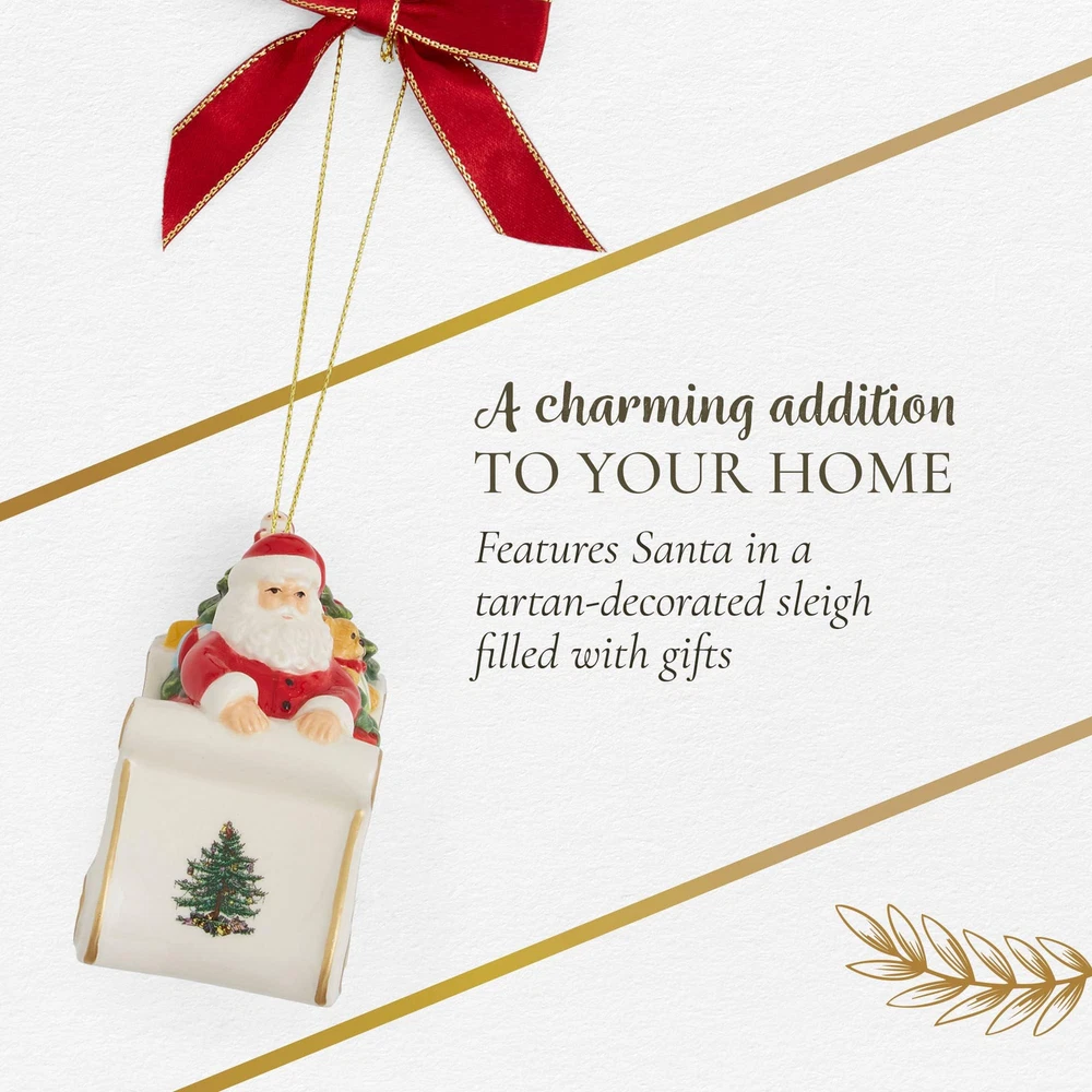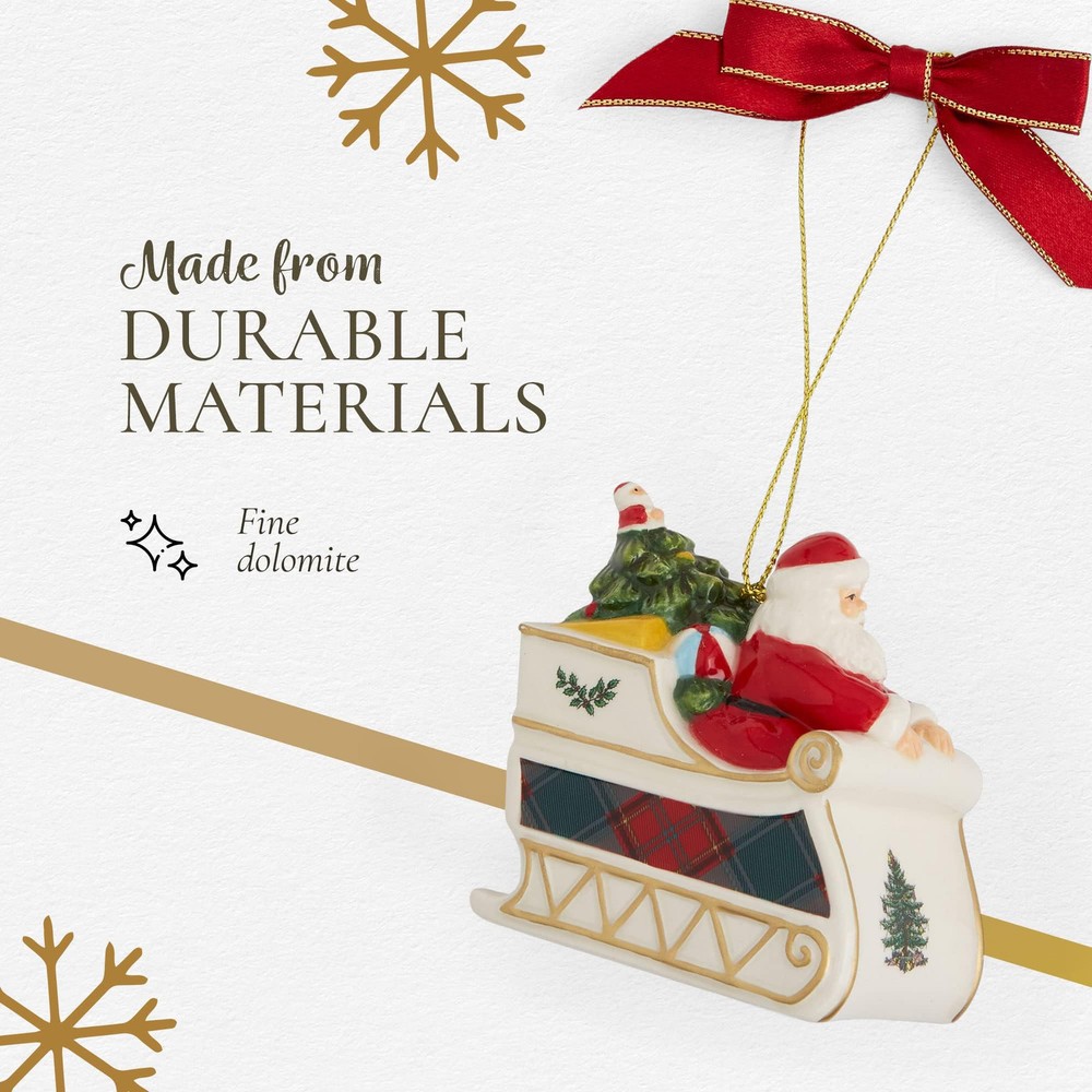 Santa in Sleigh Ornament: Celebrate the magic of the season with this Santa Claus ornament, featuring Santa in a sleigh overflowing with gifts. This holiday ornament enhances the festive spirit in any room and adds a classic touch to your Christmas tree. Charming Holiday Ornament: This Christmas Tree Tartan Santa Ornament brings a festive and unique touch to your holiday décor. With its bold tartan plaid and holly designs, this Christmas ornament adds cheerful charm to your Christmas tree decorations and holiday displays. Long-Lasting: Made from fine dolomite, this holiday ornament is crafted for durability, ensuring it remains a valued part of your collection. Ideal for use on Christmas trees, mantels, or as part of a decorative arrangement, it brightens up any space during the festive season. Fun & Festive: The Tartan Santa Ornament showcases a playful stack of gifts wrapped in tartan plaid and decorated with holly accents, evoking the excitement of the holiday season. This vibrant ornament is a fun addition to your Christmas home decor that will catch the attention of your guests. Mix & Match: With its eye-catching design, this Christmas decoration can be easily combined with other holiday ornaments. Whether your holiday style is traditional or modern, this ornament complements a wide range of Christmas tree decorations, enhancing the festive atmosphere in your home.