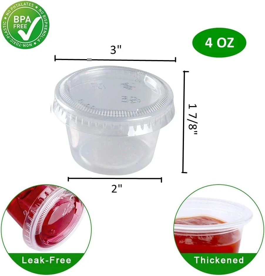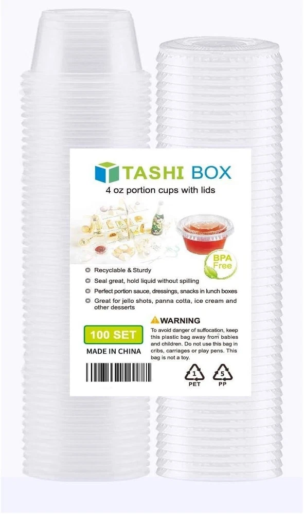 TashiBox 4 oz Plastic Disposable Portion Souffle Cups with Lids 100 Sets clear Size: 4oz-100 Color Clear Material Plastic Material Feature BPA Free Capacity 4 Fluid Ounces BPA free best Value portion cups with lids 4oz-100 sets Stackable and seal tight, hold liquid without spilling Perfect portion cups, deal for salad dressing, sauce cup, gelatin, condiments, toddlers snacks, etc. Return Policy: We offer a 30 day return policy from the receiving date. Please contact us for a Return Label. Please use our return label provided by us because it will go back to our supplier. Feedback: Your satisfaction is very important to us! If you have any problem with your order, please contact us and we will do our very best to make you satisfied. As long as you are happy with your purchase, please leave a positive feedback for us. We will always leave you a positive feedback in return. If you have any problem with your purchase, please do not leave a negative feedback. Please Contact us ... and your issue will be solved quickly and positively We are a small family-owned business trying to make it, not a huge company that doesn't care ... We will ALWAYS do our best for you!