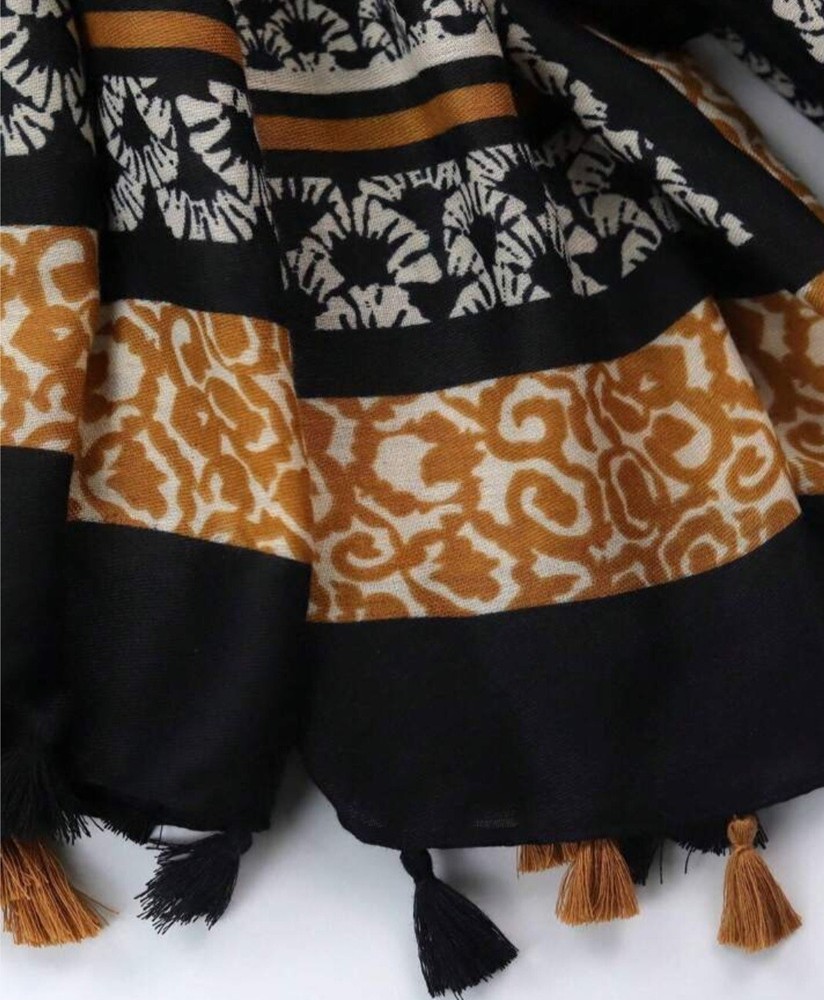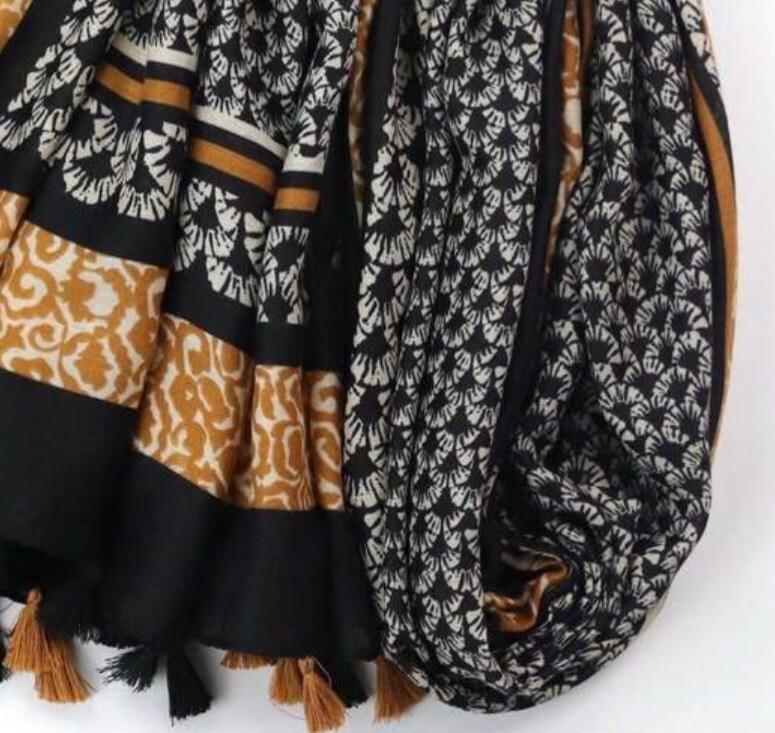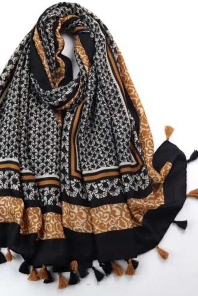 Elevate your accessory game with the Tassel Scarf's Tatum Patterned Leaf Border, a versatile addition to any ensemble. Ideal for all seasons, this scarf serves as a stylish neck warmer or a chic shawl wrap, providing both warmth and a touch of elegance. The geometric pattern in black, white, and goldish yellow hues offers a vibrant complement to a multitude of outfits, making it a must-have for your wardrobe. Crafted from 100% polyester, this scarf is easy to care for with a gentle wash in cold water. Its multifunctional design and tasseled accents add a trendy edge to the piece, ensuring you stay on top of the fashion curve regardless of the weather. Whether you're shielding your shoulders from the sun or adding a layer of comfort to a chilly evening out, this scarf's got you covered. Width - 85cm/33.46 Inches Length - 180cm/70.8 Inches Brand New Without Tags 📸 Please See All Photos To Make The Best Informed Decision 📸