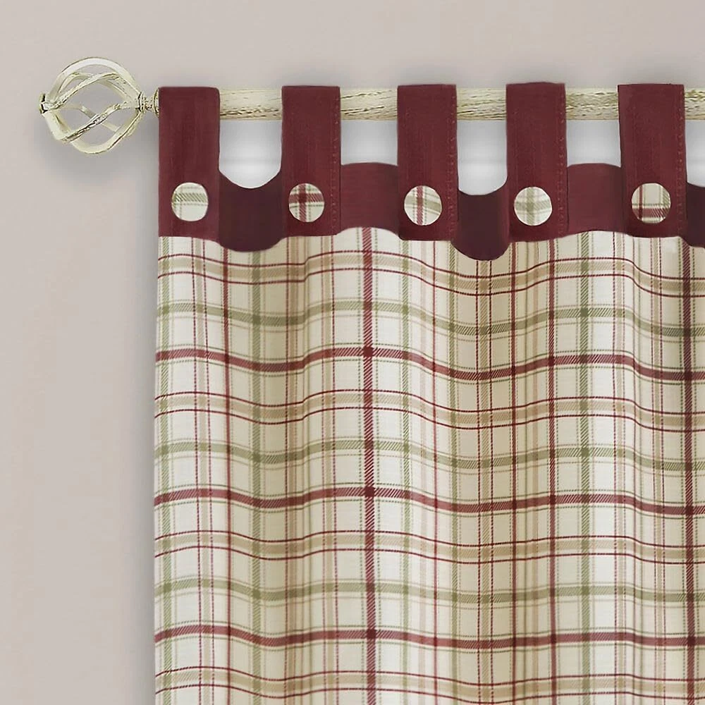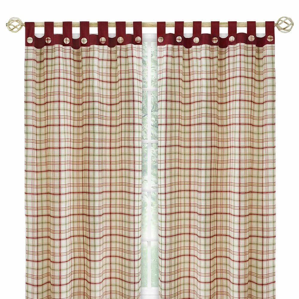 This farmhouse tab-top panel features fabulous plaid with coordinating solid color tabs and bottom band. Each tab has a generous opening and is embellished with and a half inch fabric covered plaid buttons to create a custom look. The Tattersall Tab Top panel is 52-inches wide and is bordered with a 10-inch coordinating solid color bottom band. This light filtering polyester cloth drapes just beautifully and will complete the look of any room. Panels can be hung with any size decorative rod. Each panel sold separately. Also available separately are the Tattersall tier and decorative valance set or Tattersall single valance, great ways to cross coordinate short windows with the Tattersall Tab Top Panel. Burgundy, Tan and Sage on a Cream background Light filtering polyester Machine washable Panel width 52-inch Panel available lengths 63-inches or 84-inches