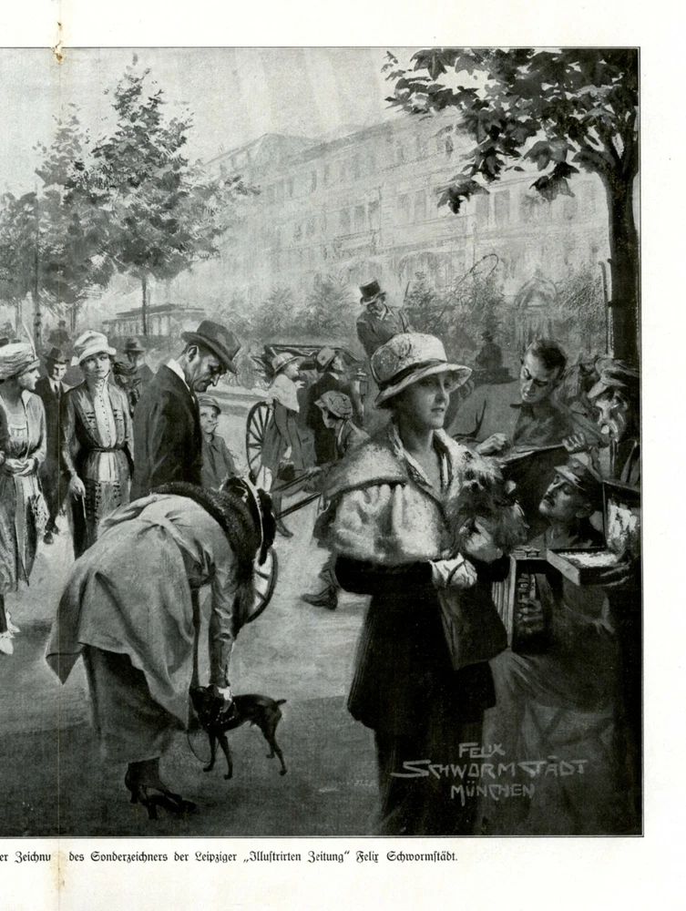 (CJ) (F21) Deutsch / English 0 Doppelseitiger Kunstdruck aus dem Jahr 1919 Der Kunstdruck wurde einem Journal, einem Buch oder einer Zeitung entnommen und lässt sich daher genau datieren. Auf Wunsch nenne ich dem Käufer gerne, wo und wann dieser Kunstdruck veröffentlicht war. Es handelt sich um keine moderne Kopie, sondern um einen seltenen, 1919 gedruckten und veröffentlichten Kunstdruck, ein Original der Zeit. 0 " Auf der Tauenzienstraße in Berlin " 0 Very large center fold German 1919 art print This early and hard to find art print has been carefully removed from an old German magazine, book or newspaper and is guaranteed to be an original piece. It is no photocopy or reprint but a 1919 printed and published art print, a wonderful historical collectible. The translation of the German title (to the best of my ability): 0 " On Tauenzienstrasse in Berlin " 0 Kunstdruck nach einer Zeichnung von / Art print after a drawing by Felix Schwormstädt, * 1870 in Hamburg, † 1938 in Locarno 0 Größe / Size: Größe der Doppelseite mit Falz in der Mitte (so veröffentlicht) mit weißem Rand wie unten abgebildet 39 cm x 54 cm . Auf Grund der Größe kann ich trotz A3 Scanner den Kunstdruck nicht in einer Gesamtansicht zeigen. Bild 1 zeigt die Mitte, Bild 2 die linke Seite, Bild 3 den Falz vorne, Bild 4 die rechte Seite und Bild 5 den Falz auf der Rückseite. Size of the double page with a fold in the center (as issued) with the white margins like shown below 15.3" x 21.3" inches . Due to the size of the double page compared to my scanner I can not show an overall view of the publicity. Image 1 shows the center, image 2 the left side, image 3 the fold frontside, image 4 the right side and image 5 the fold backside. 0 Zustand / Condition: Druck der Rückseite schimmert im weißen Rand vereinzellt dezent durch, oben links etwas auffallender. Sonst nur leichte Gebrauchsspuren im weißen Rand sowie Klammerlöcher mit leicht schadhaften Stellen im Falz - siehe Scans. Kunstdruck selbst hat bis auf den Falz keine Mängel. Nach Schulnoten bewertet würde ich - ohne Berücksichtigung des Falzes - sagen, Zustand Rand: 2-3, Zustand Kunstdruck: 1, Schönheit und Seltenheit des Kunstdrucks: 1*. Die Rückseite ist bedruckt, hat aber inhaltlich nichts mit der Vorderseite zu tun. Das Original ist schärfer als von meinem Scanner wiedergegeben, die Schrift ist klar und deutlich zu lesen. A bit of reverse print visible in a few spots in the white margin, most significant marigin upper left. Otherwise only slight signs of handling in the white margin and staple holes with a bit surface wear around in the fold - see scans. Art print has - beside the fold - no flaws. Without consideration of the fold I would say condition margin: almost good, condition art print: very good, beauty and rarity: excellent. The reverse sides are printed but have nothing to do with the content of the front. The original is better than reproduced by my scanner, the writing is very good to read. 0