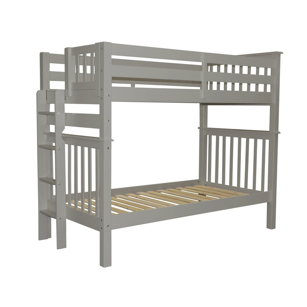 Constructed from stable pine wood with a charming grey finish, this classy and reliable bunk bed is a fantastic solution for roommates and large families. The bunk features a twin over twin construction with an end ladderFeatures:Includes hardwareGrey finishSolid PineAssembly RequiredSale is for bunk bed only (excludes mattresses)69 inches high x 43 1/2 inches wide x 83 1/2 inches longThis product will ship to you in multiple boxes.Assembly Required Free Shipping Over $49.99* Details Taylor & Olive Trillium Tall Twin over Twin Bunk Bed with End Ladder Product Description: Constructed from stable pine wood with a charming grey finish, this classy and reliable bunk bed is a fantastic solution for roommates and large families. The bunk features a twin over twin construction with an end ladder Features: Includes hardware Grey finish Solid Pine Assembly Required Sale is for bunk bed only (excludes mattresses) 69 inches high x 43 1/2 inches wide x 83 1/2 inches long This product will ship to you in multiple boxes. Assembly Required