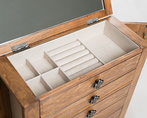 With the Taylor Jewelry Chest, you'll have the perfect storage solution for all your precious jewels! This antique-inspired design will transport you back in time while still providing modern-day organization. You'll love the multiple ring rolls, divided compartments, and spacious drawers with additional divided compartments for all your bracelets, earrings, note cards, and keepsakes. The sweet clover knobs add a touch of charm to this already lovely piece. Plus, the side doors with necklace hooks will keep your strands safe and stylishly stored. You can trust the lined interior to protect your precious jewels, making this the perfect gift for any jewelry lover looking for a unique and functional storage solution. The sturdy construction ensures durability and longevity, while the compact size fits perfectly on any dresser or vanity, saving you precious space. Antique-inspired design with modern-day organization Multiple ring rolls in top compartment for easy access Divided compartments to keep your jewelry organized and tangle-free Clover knobs for a touch of sweetness and charm 5 spacious drawers with additional divided compartments for bracelets, earrings, note cards, and keepsakes Side doors with necklace hooks for safe and stylish storage Lined interior to protect your precious jewels Product Dimensions: 15" H x 7" D x 14.75" W