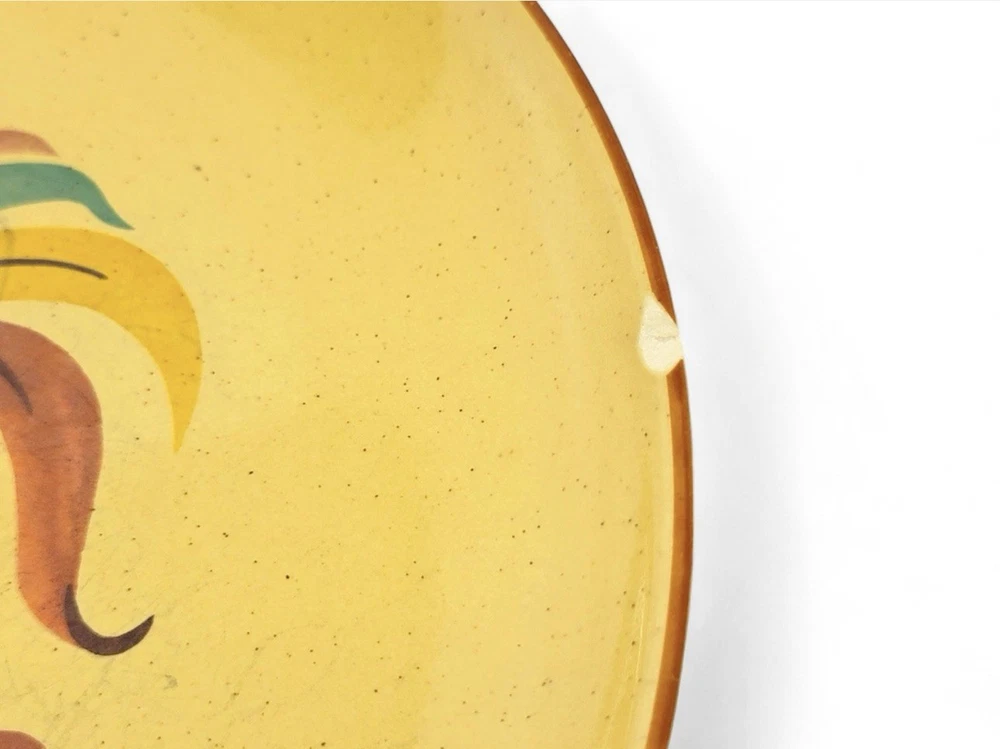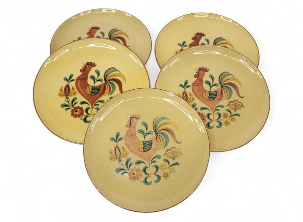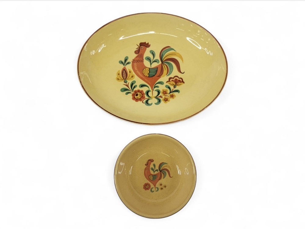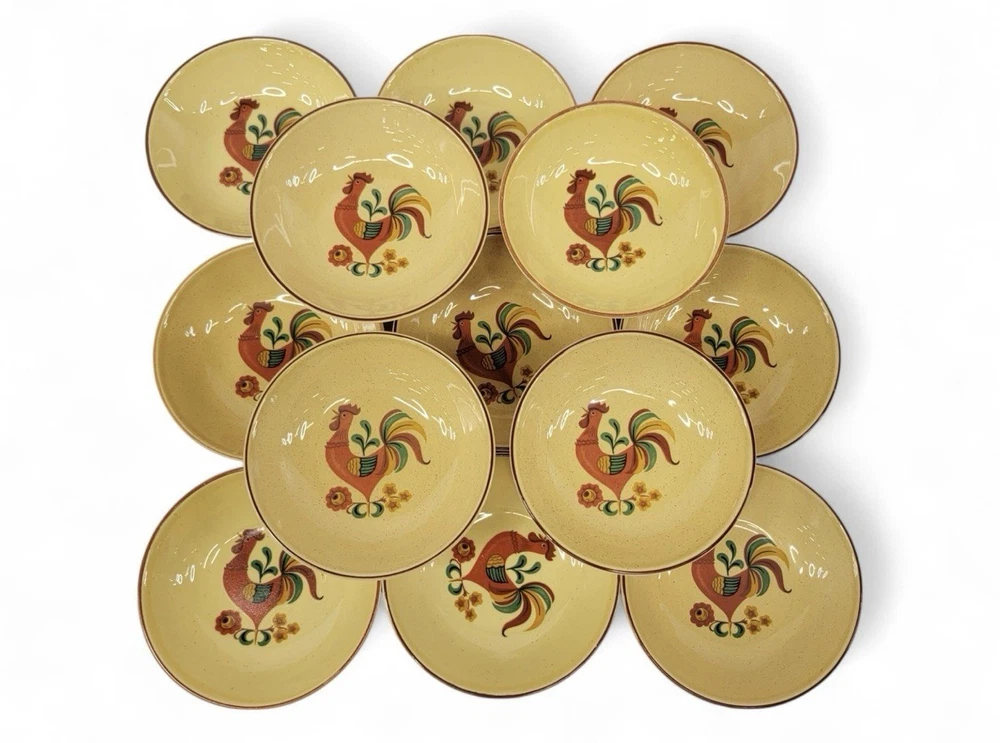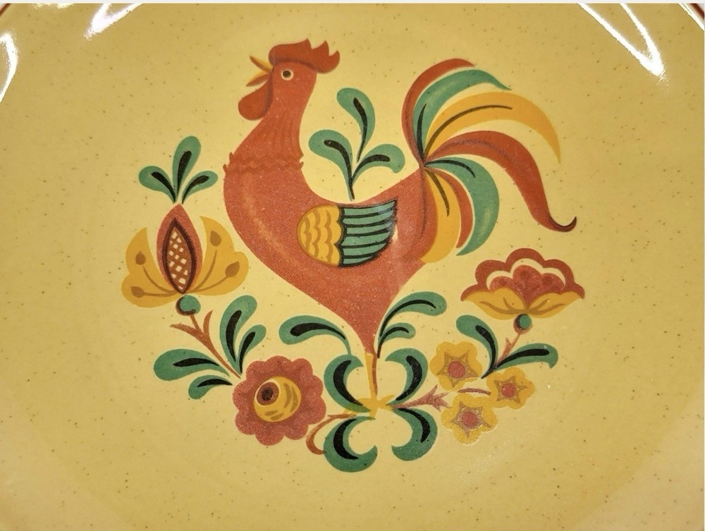 The Taylor Smith Taylor Vintage Ironstone Cannes Atomic Onion Dinner Coffee Set is a charming and unique dining set featuring a rooster pattern in a vibrant yellow color. This round-shaped set includes 8 place settings, with a variety of pieces such as bowl sets, dessert plates, salad plates, bowls, dinner plates, and mugs. Made from ceramic with a smooth finish, this set exudes a retro charm that is perfect for adding a touch of vintage flair to your dining experience.