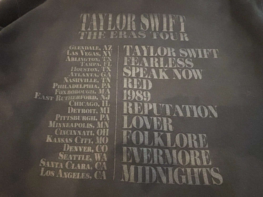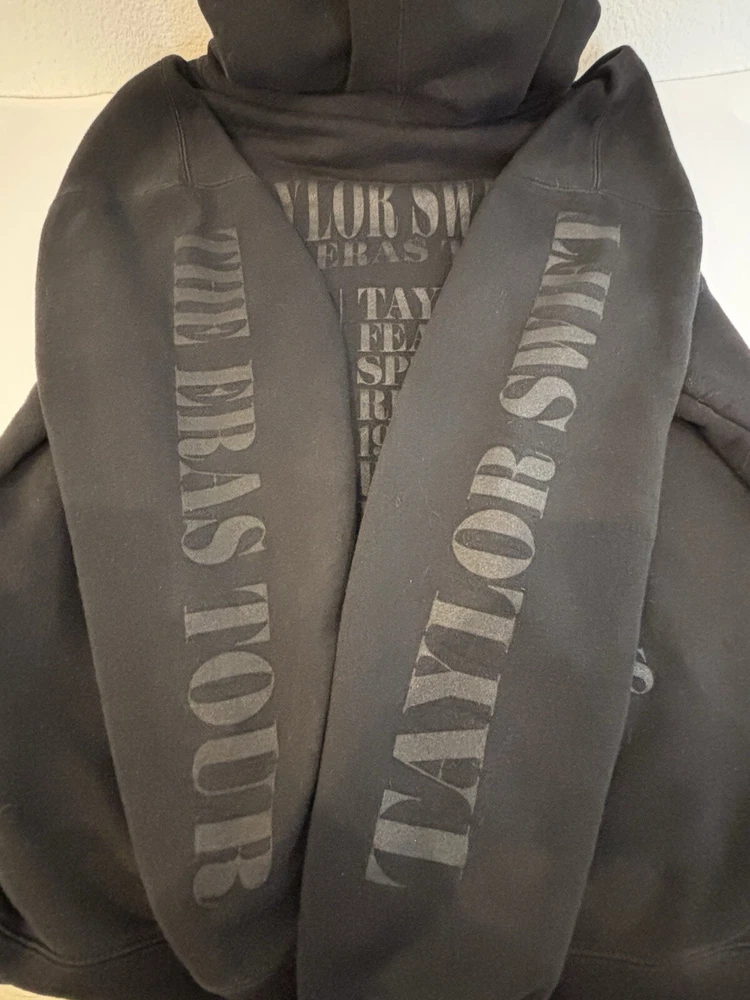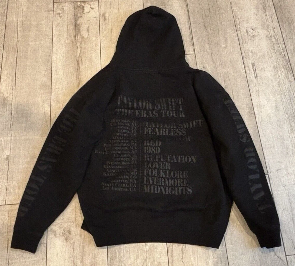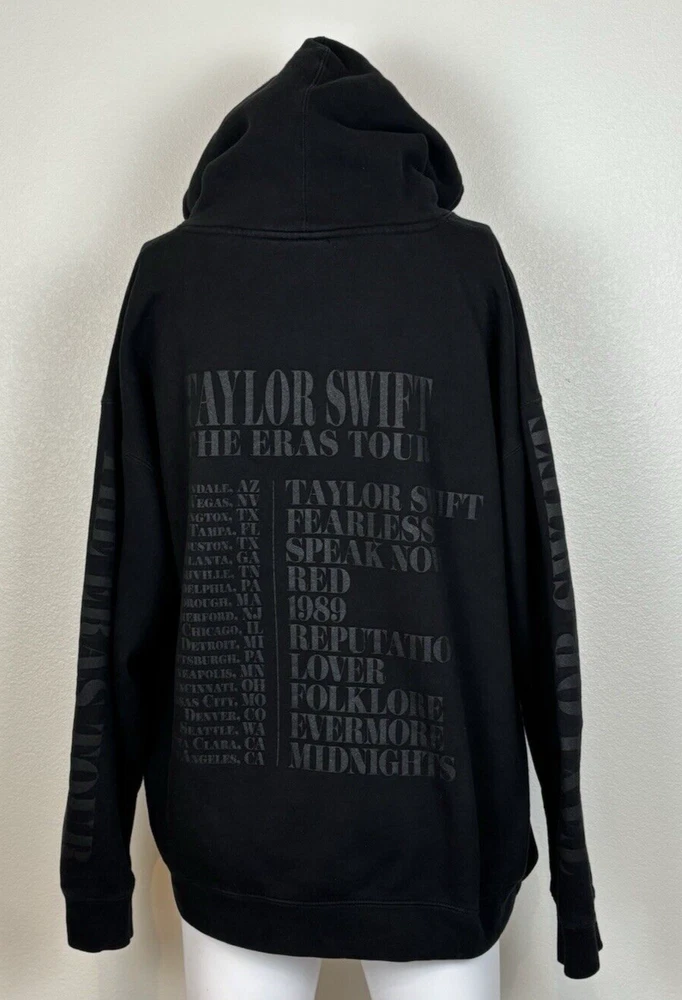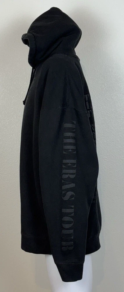 Taylor Swift The Eras Tour Concert Merch Hoodie Adult 2XL Black Limited Edition. US Tour dates on back of hoodie, photos on front and Eras Tour going down arms. Perfect for any Swiftie fan! In excellent pre-owned condition-no flaws. Please see photos for measurements and condition. Features: • Style Profile: Swiftie, Concert memorabilia, Pop, Celebrity, Stars, Music • Hoodie with Kangaroo pouch • Machine Washable Measurements: - Previous washings may change the sizing written on the tag. - Please refer to the photos above for all measurements. - Please compare our measurements to that of one of your favorite garments. - Please note, item measurements are approximate . - Colors may differ slightly in shade from photos to actual item due variances caused by photography lighting and monitors. All items are bagged and sealed after being photographed, then stored in a smoke free environment to ensure the item is exactly the same as when photographed. We always carefully package and ship ASAP. Feel free to contact us with any questions. All items are washed per eBay standards and policies. We greatly appreciate your business! Please remember to leave positive feedback if you are happy with your purchase! Thanks for looking!